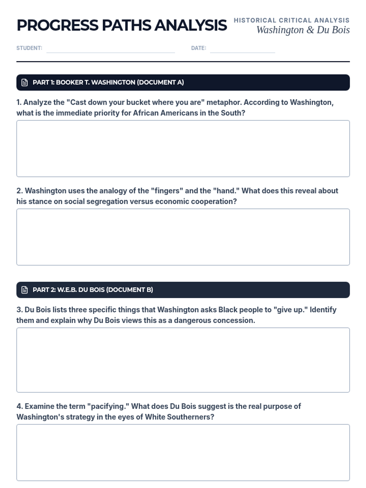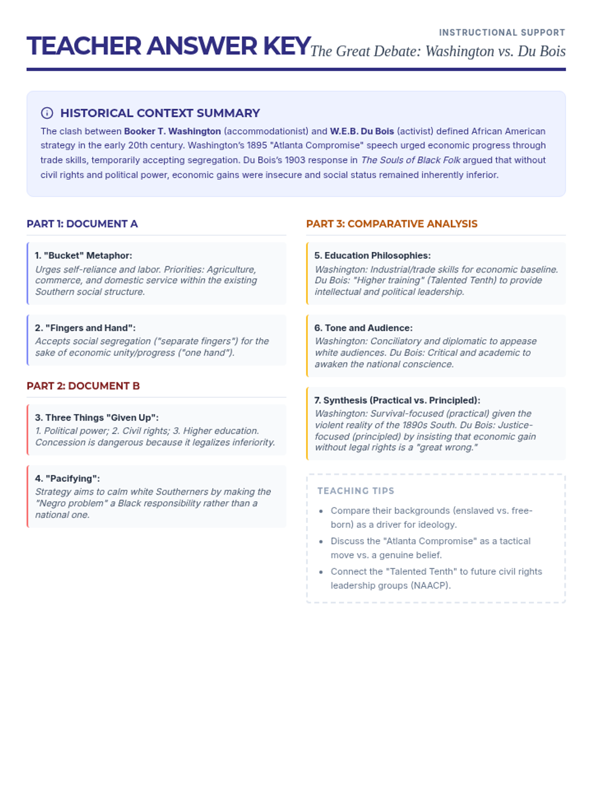 This lesson examines the ideological clash between Booker T. Washington and W.E.B. Du Bois regarding the best path for African American progress in the post-Reconstruction South. Students will perform a critical analysis of primary sources and compare their distinct strategies for civil rights, education, and social status.