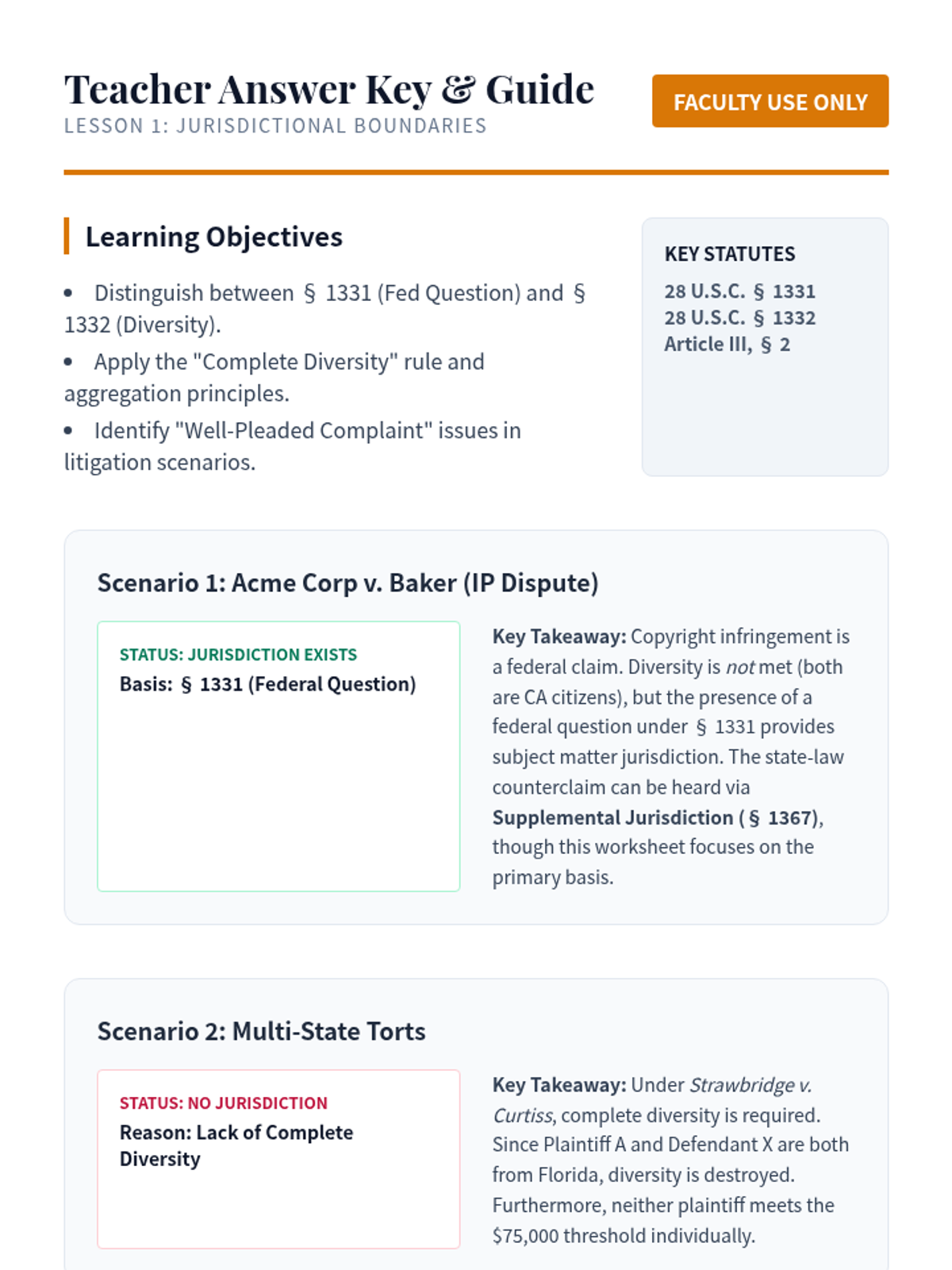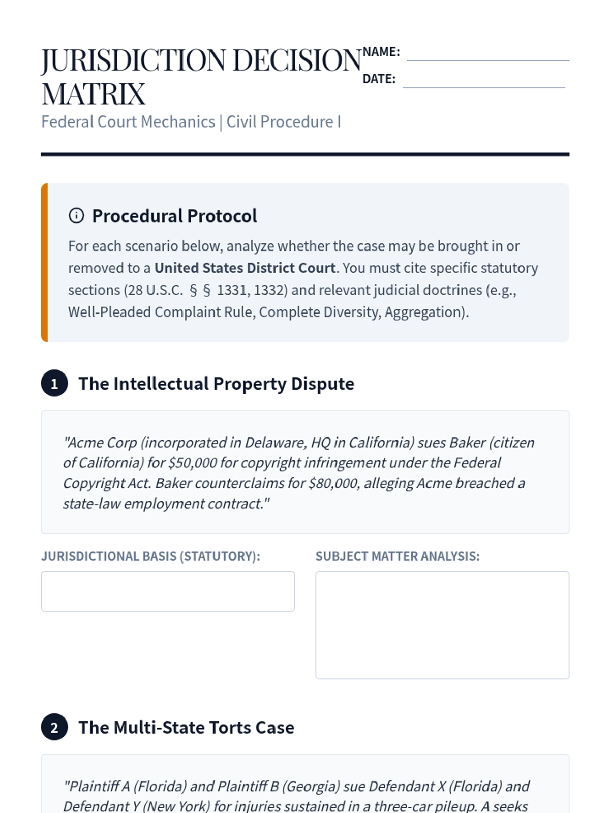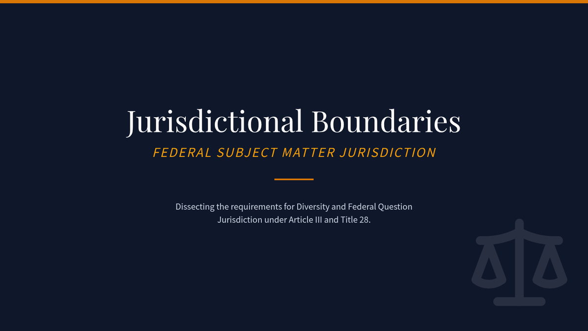 Students analyze the requirements for diversity and federal question jurisdiction under Article III and 28 U.S.C. §§ 1331-1332, including the well-pleaded complaint rule.