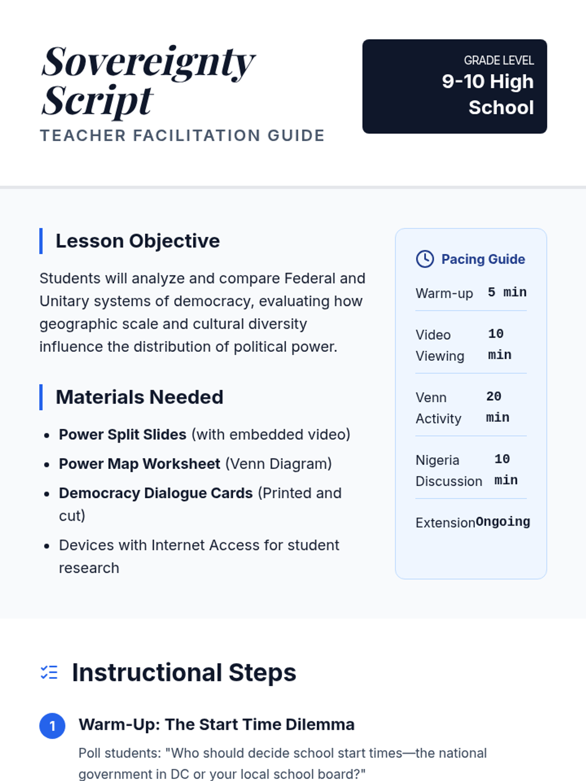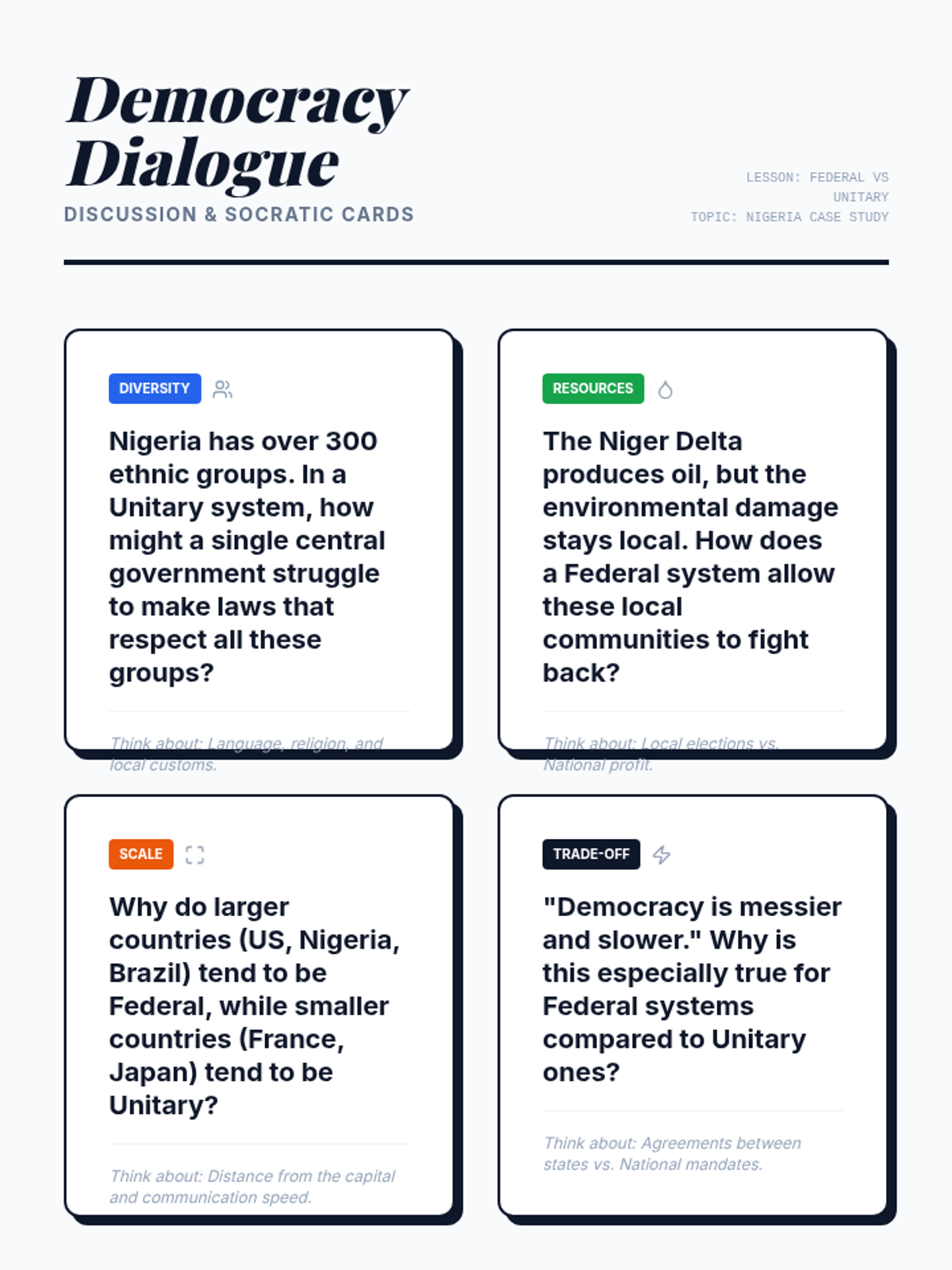 A comprehensive lesson comparing Federal and Unitary democratic systems, using the US and Nigeria as key examples of power distribution and geographic challenges.