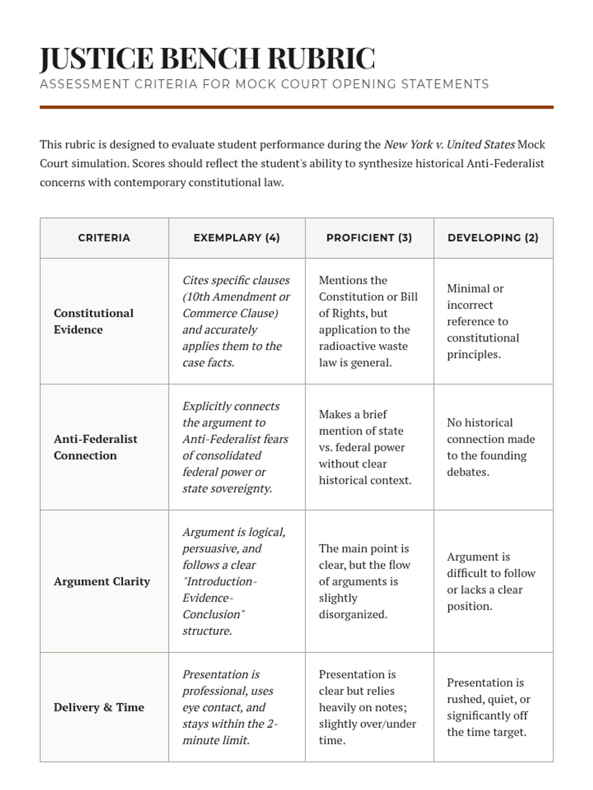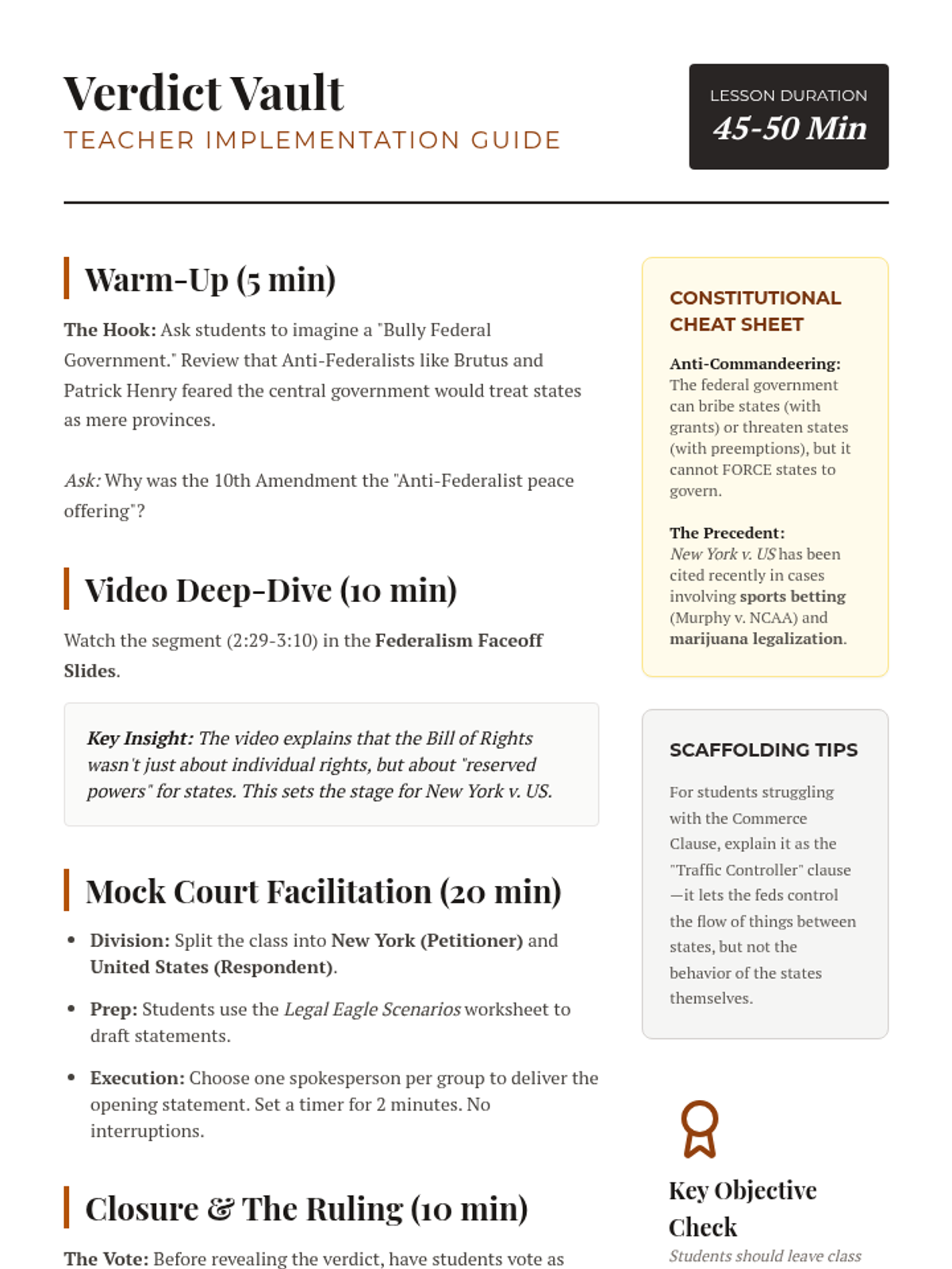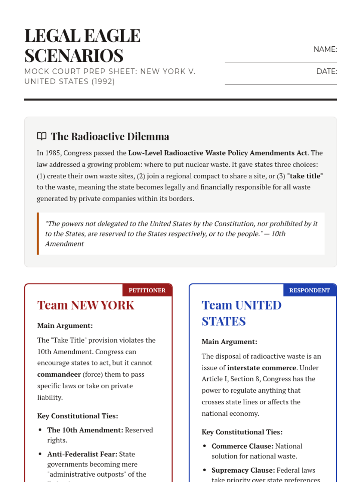 This lesson explores the tension between state and federal power by connecting Anti-Federalist fears to the landmark Supreme Court case *New York v. United States* (1992). Students will engage in a Mock Court activity to argue the limits of federal authority under the 10th Amendment.