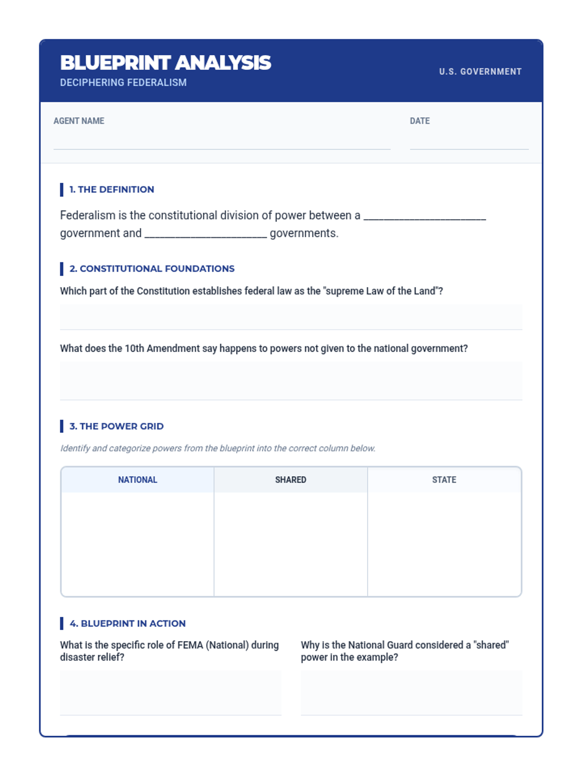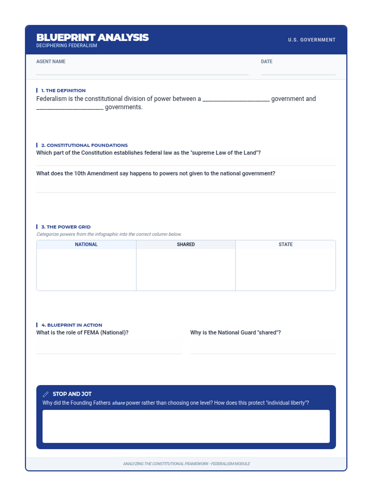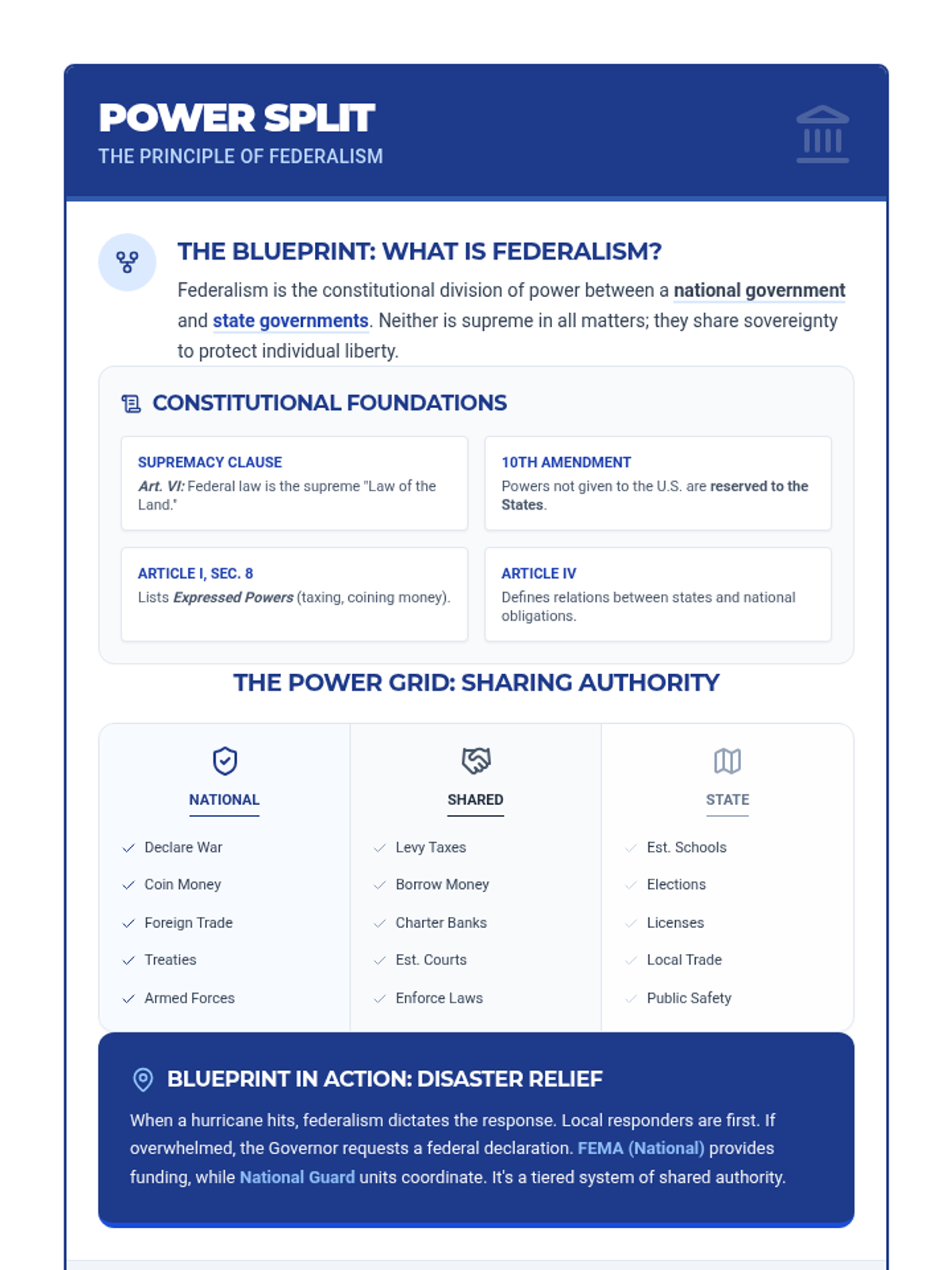 A lesson exploring the principle of Federalism in the U.S. government, including the distribution of power between national and state levels, constitutional foundations, and real-world applications.