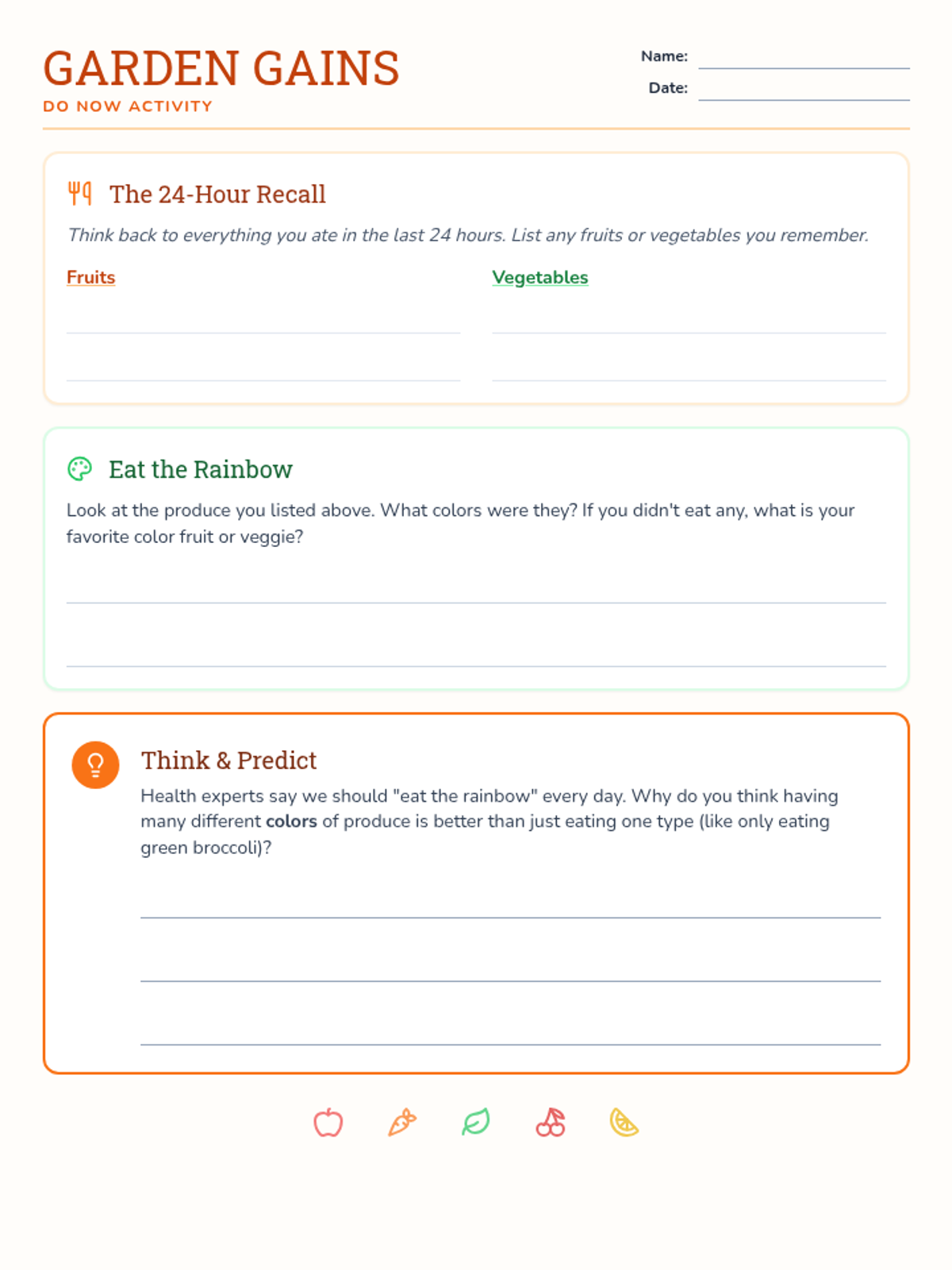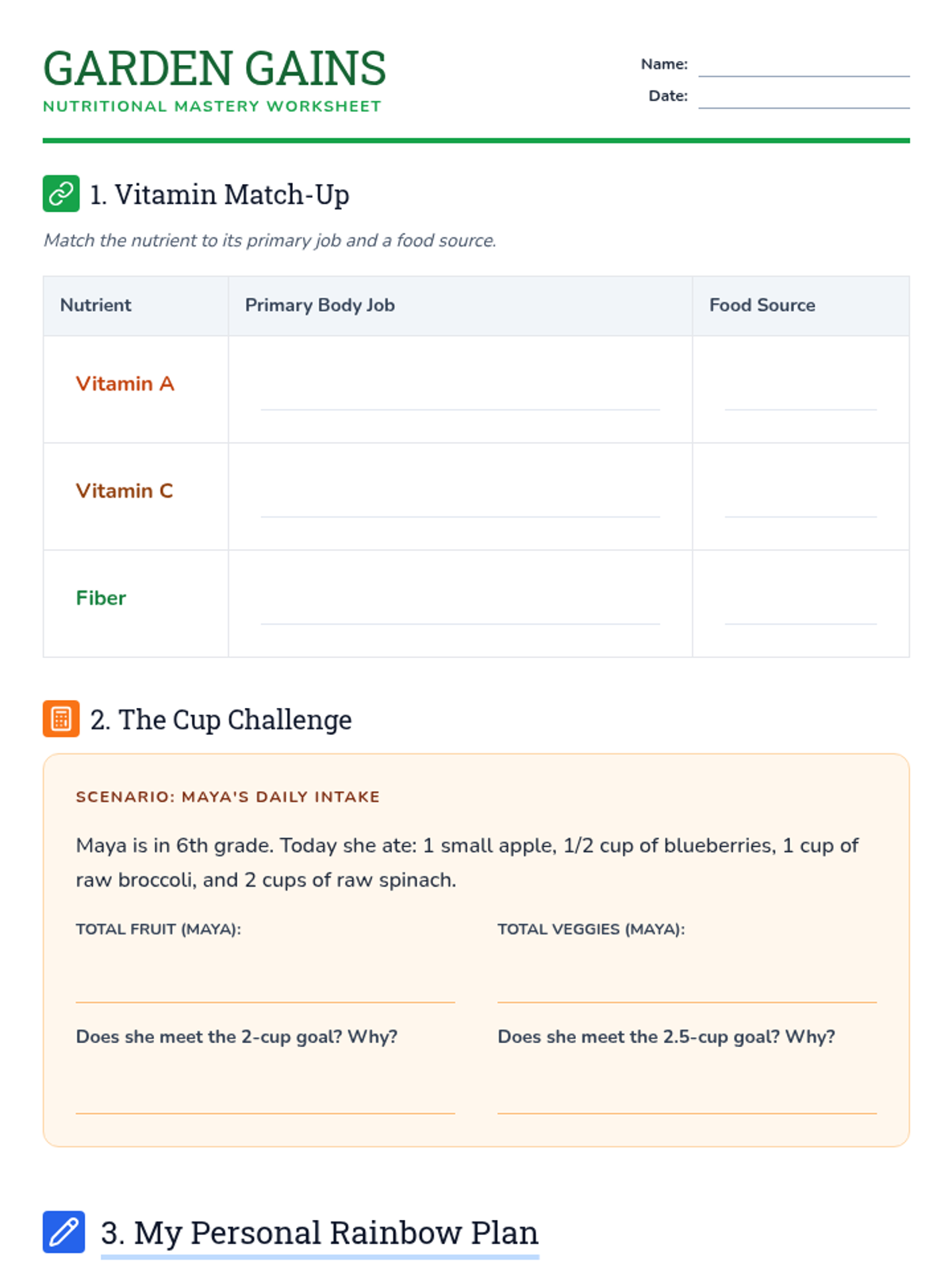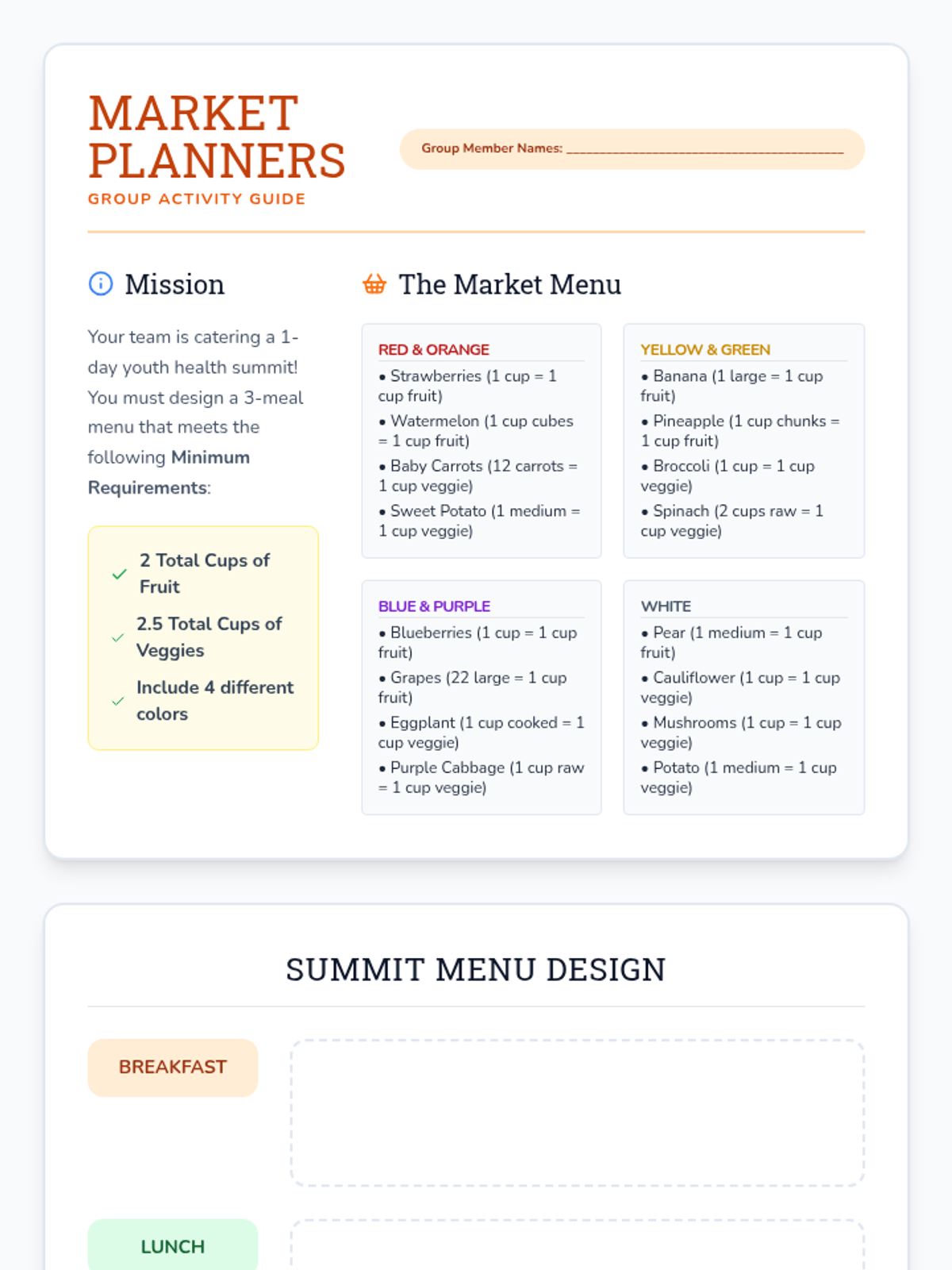 A comprehensive health lesson for 6th graders focusing on the nutritional benefits of fruits and vegetables, daily serving requirements according to MyPlate, and the importance of eating a variety of colors.
