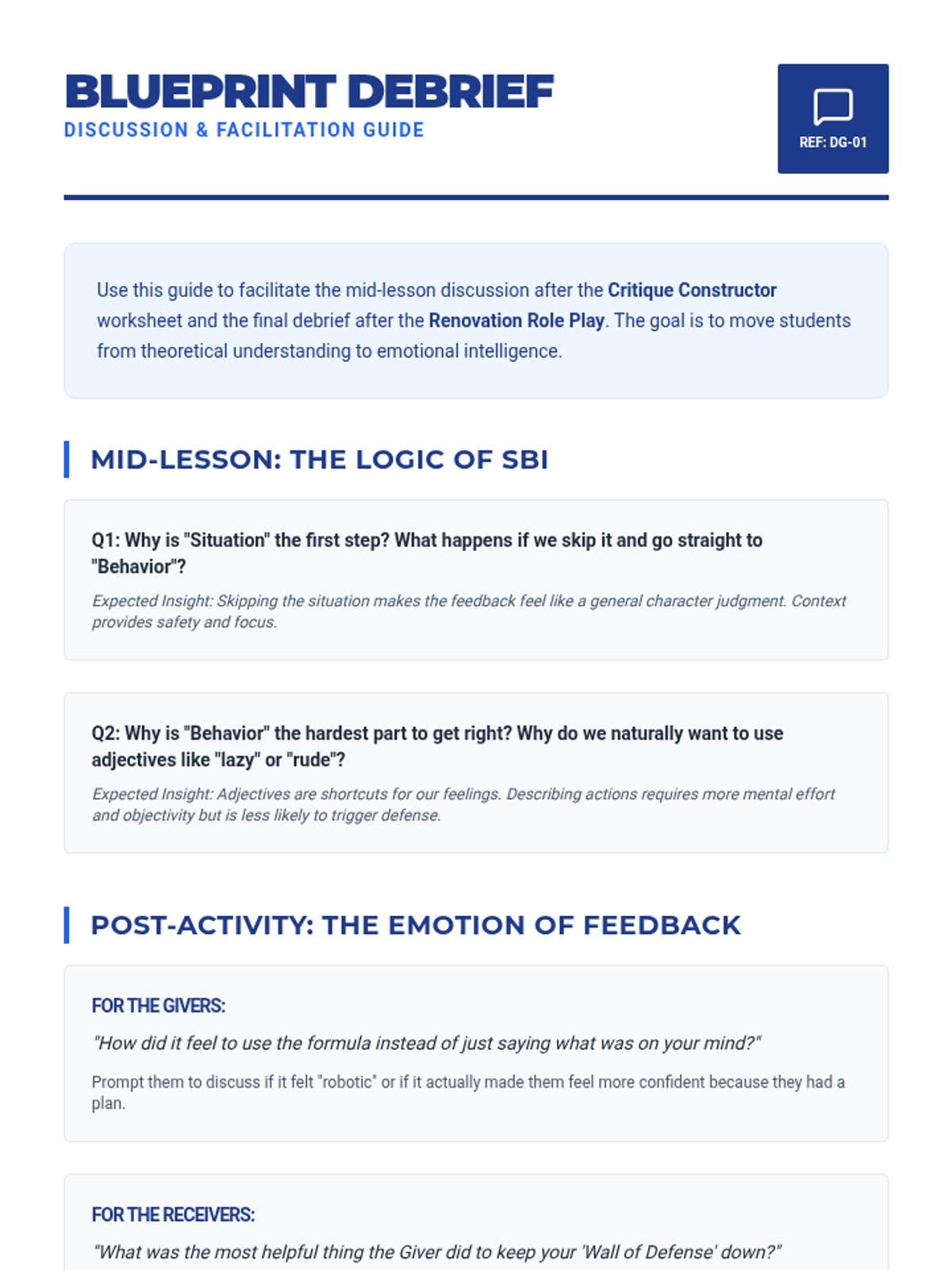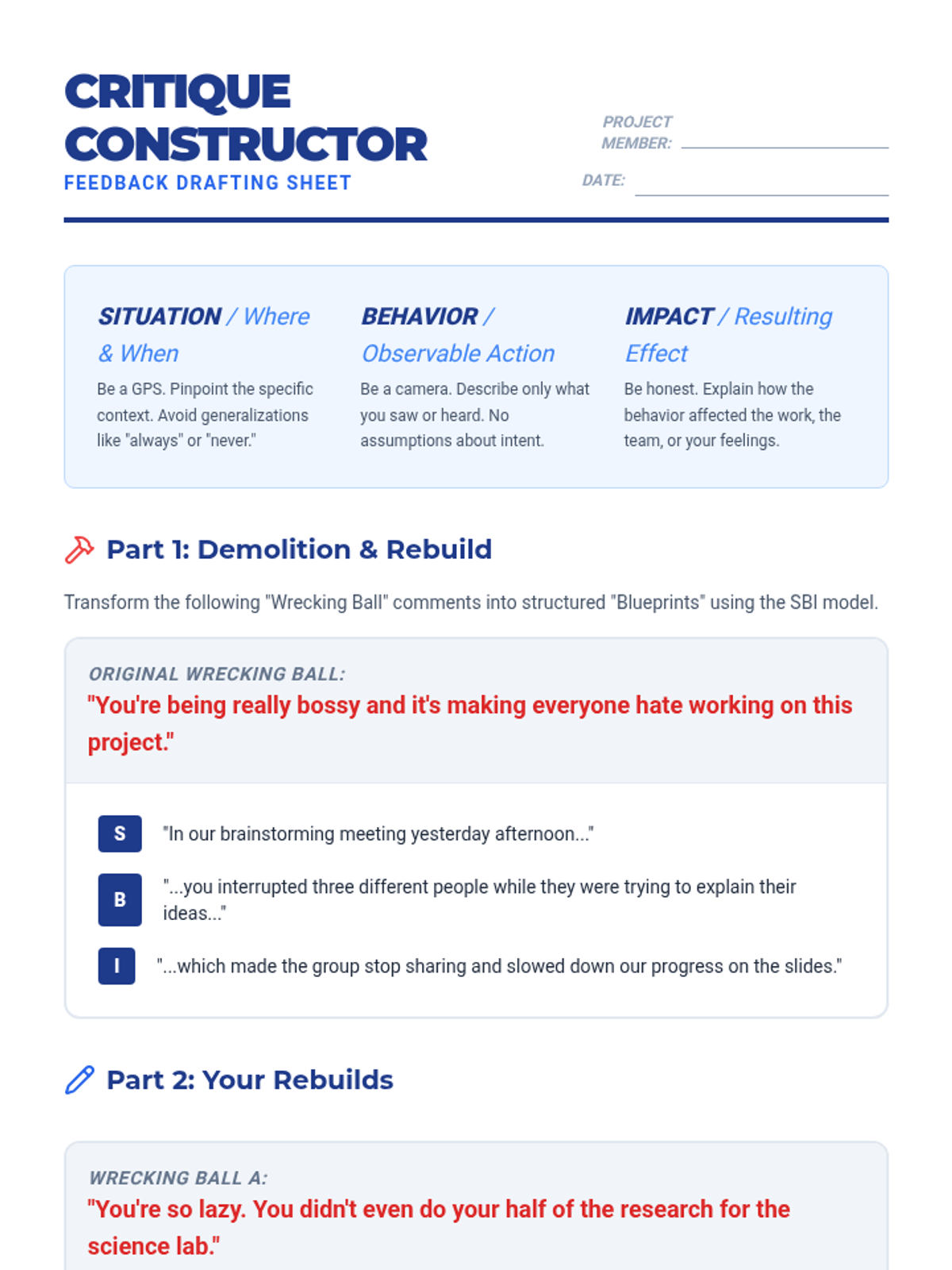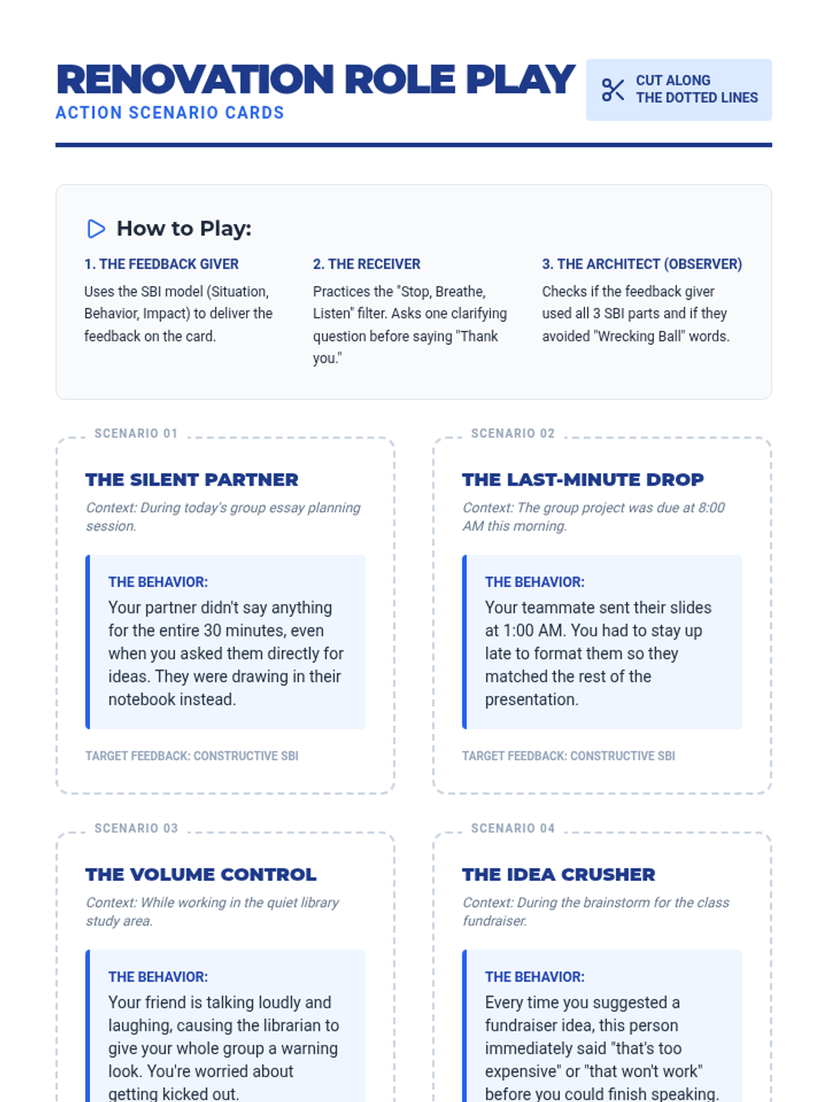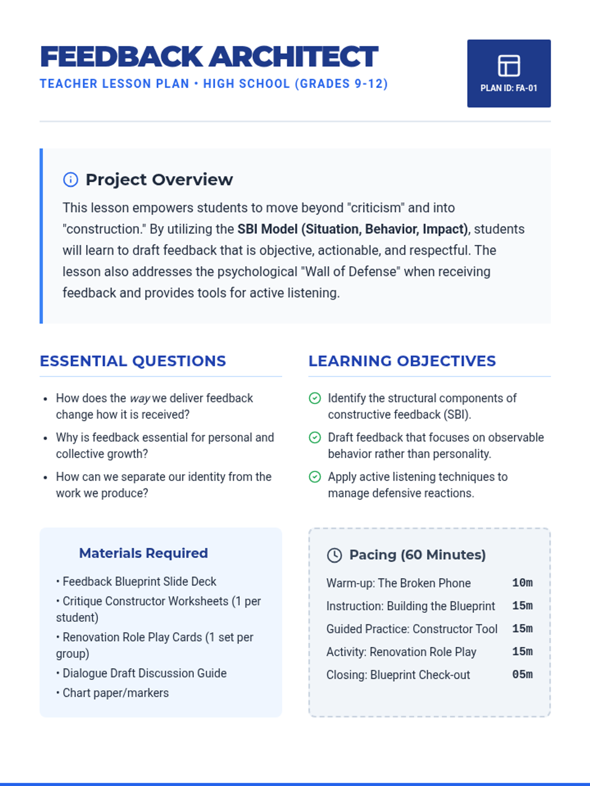 High school students learn the structural elements of constructive feedback using the SBI framework and active listening to build a culture of growth and mutual respect.