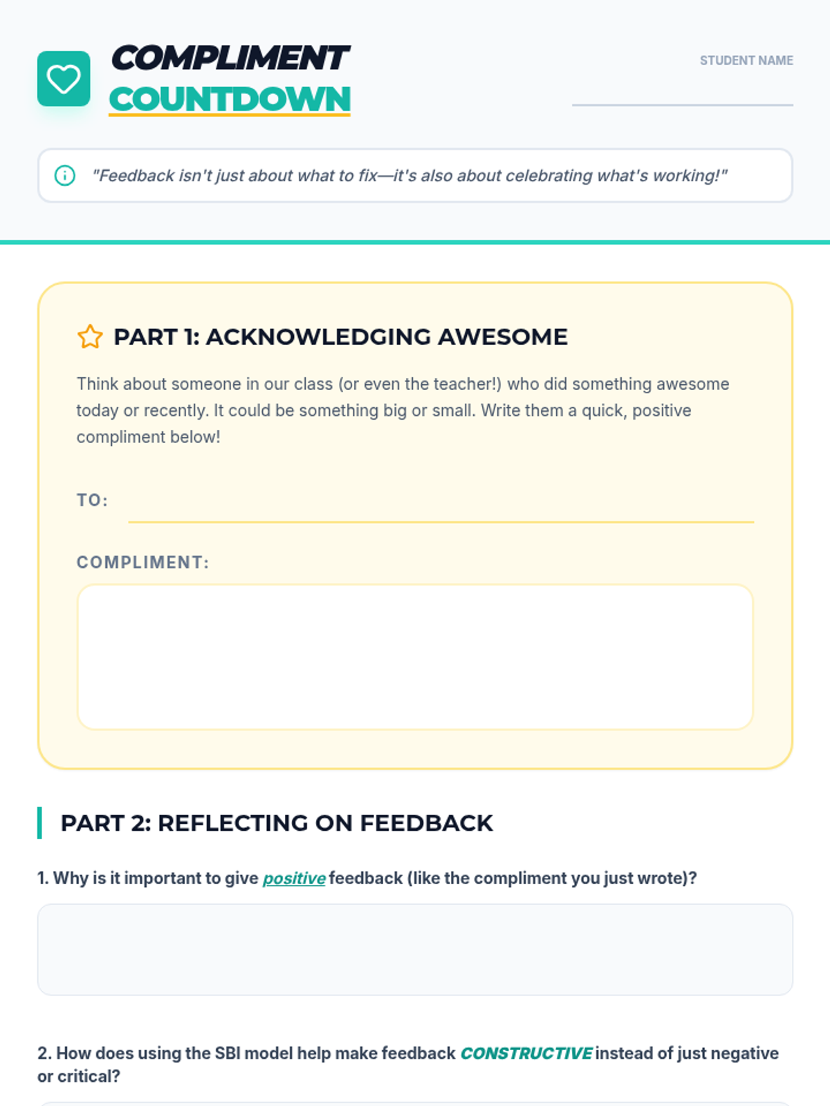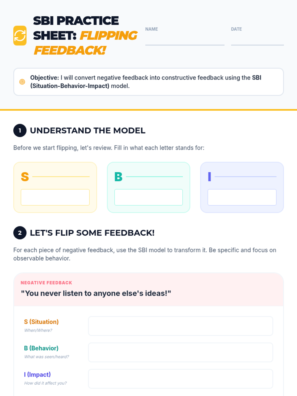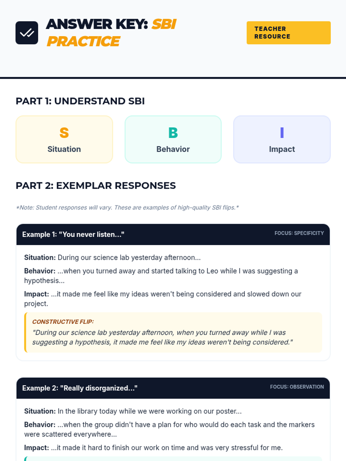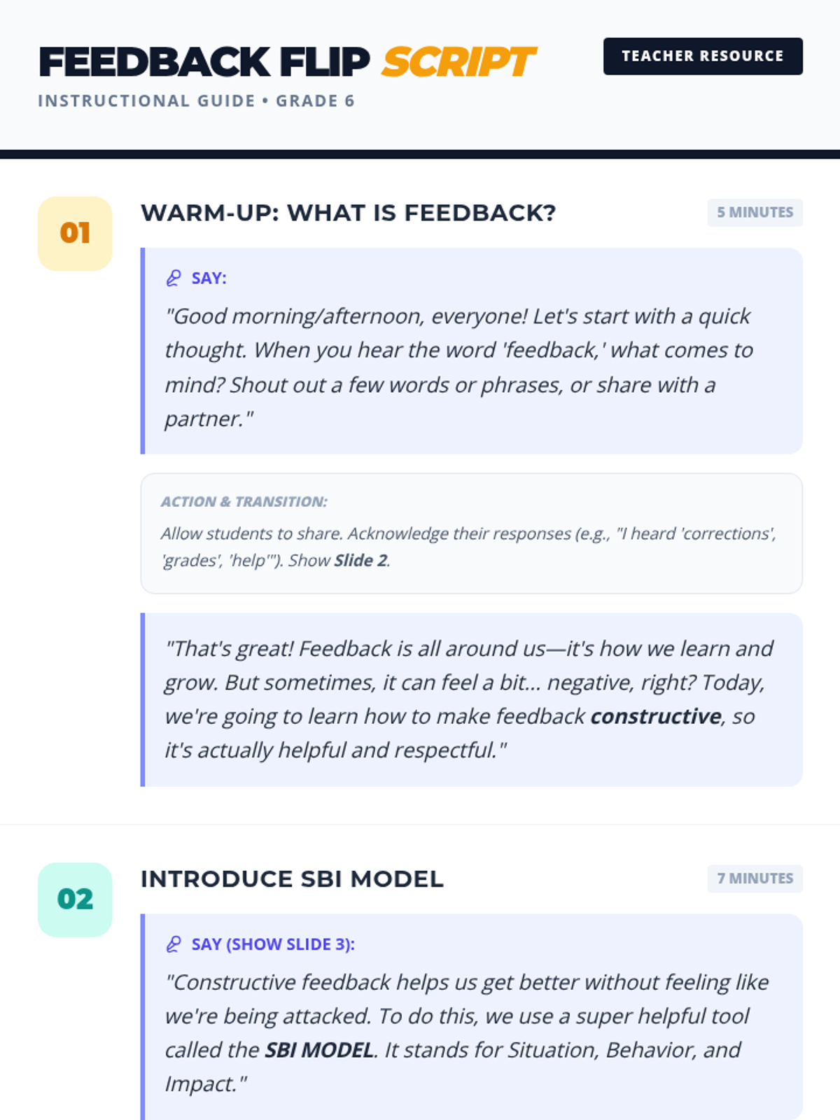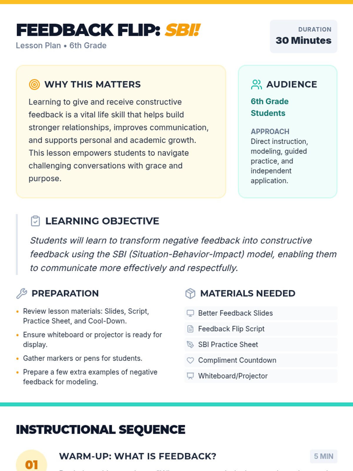 A 30-minute lesson teaching 6th graders to transform negative feedback into constructive growth using the Situation-Behavior-Impact (SBI) model. Students learn to communicate respectfully while fostering a positive classroom environment.