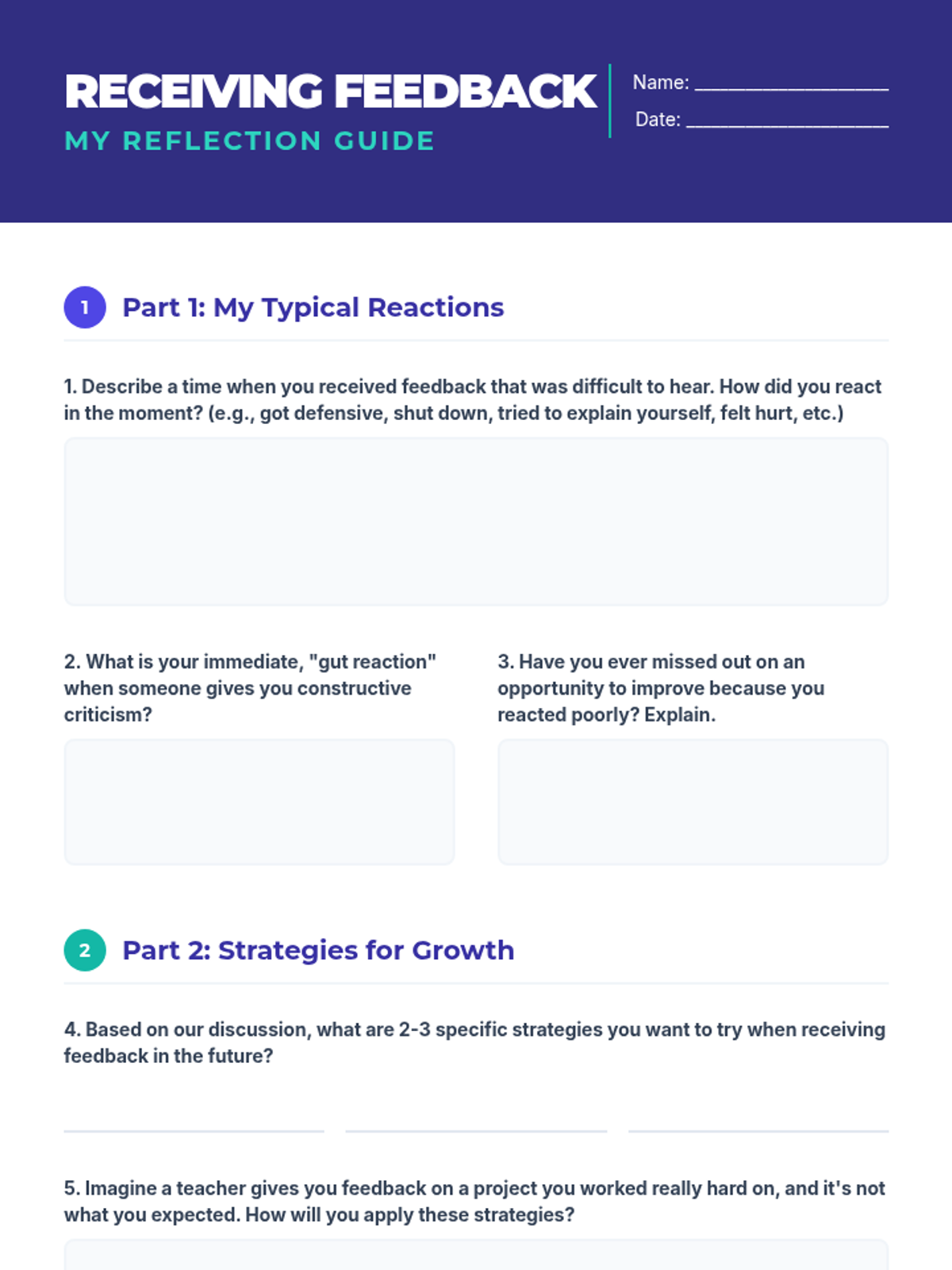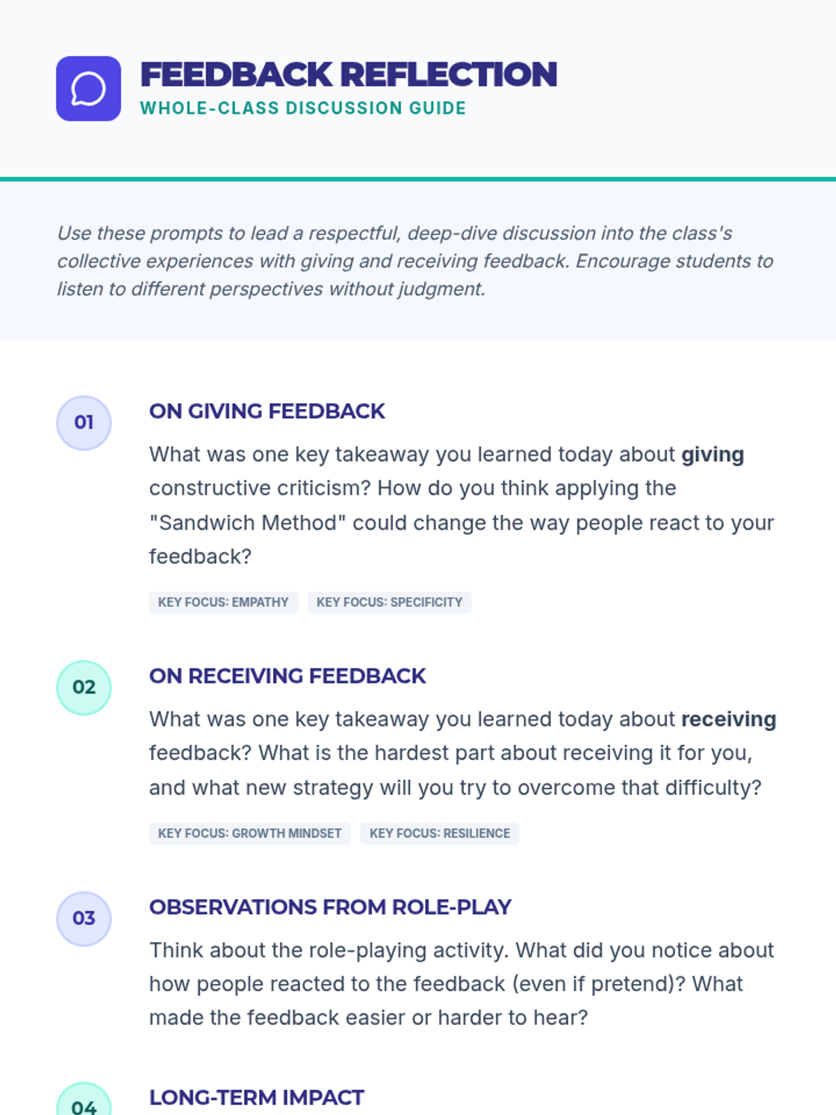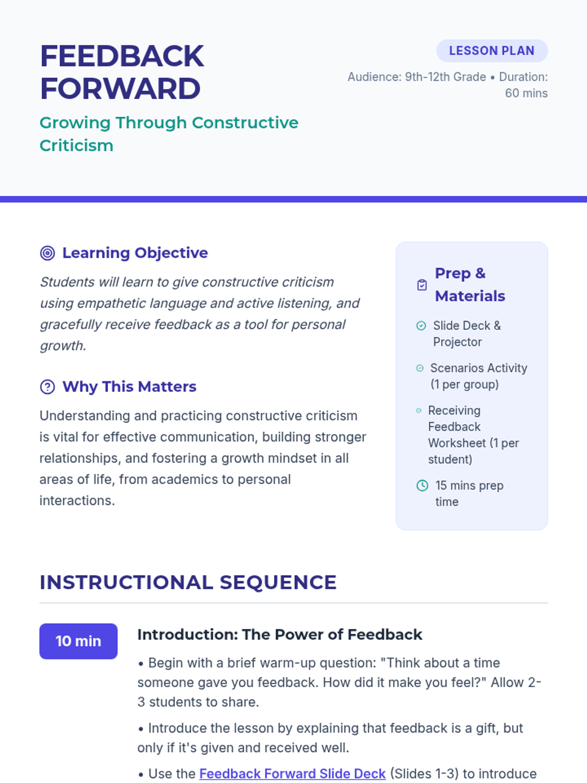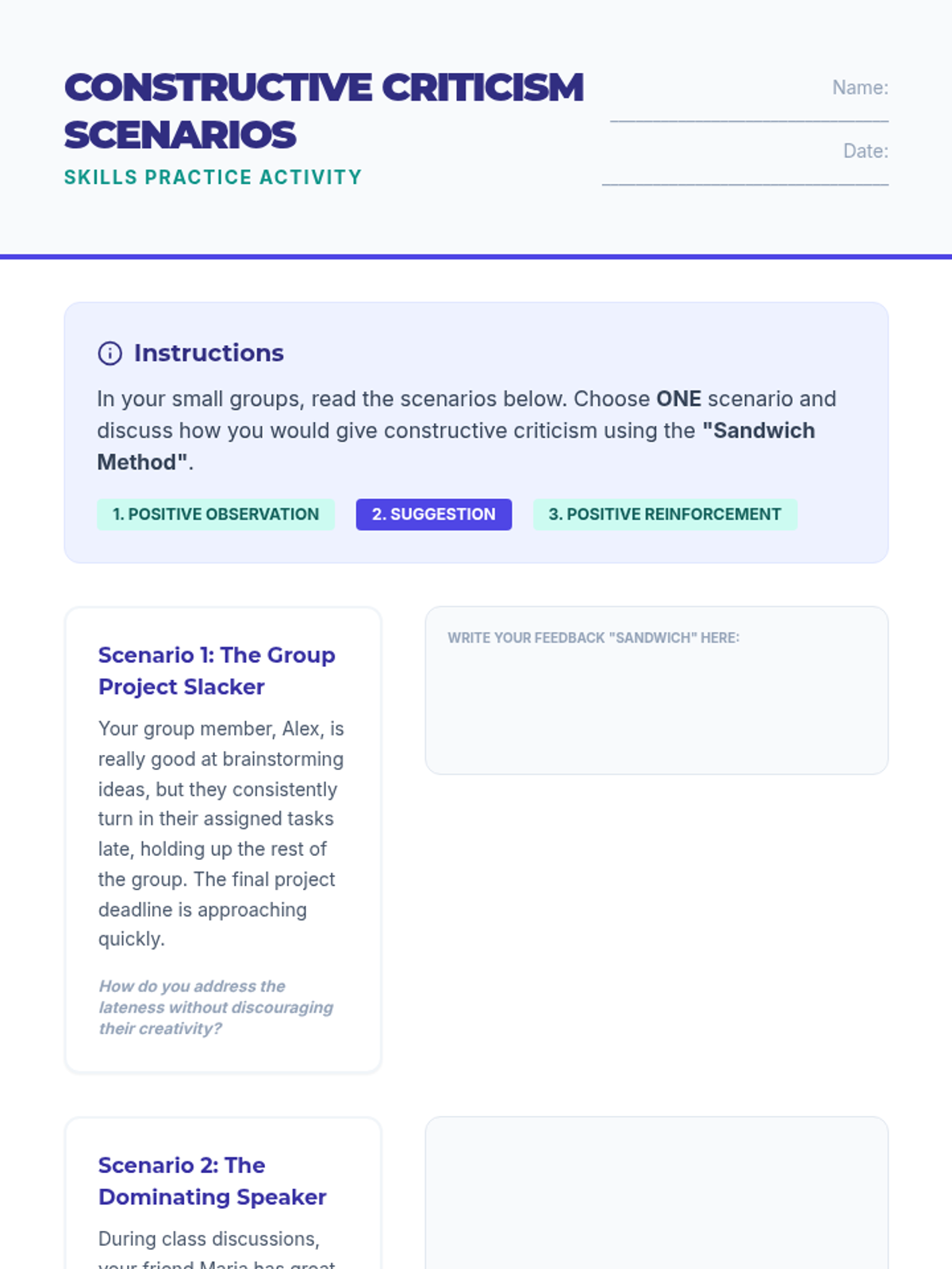 A 60-minute lesson for 9th-12th graders focused on the art of giving and receiving constructive criticism. Students will practice the 'Sandwich Method' for empathetic feedback and develop strategies for staying open to growth during difficult conversations.