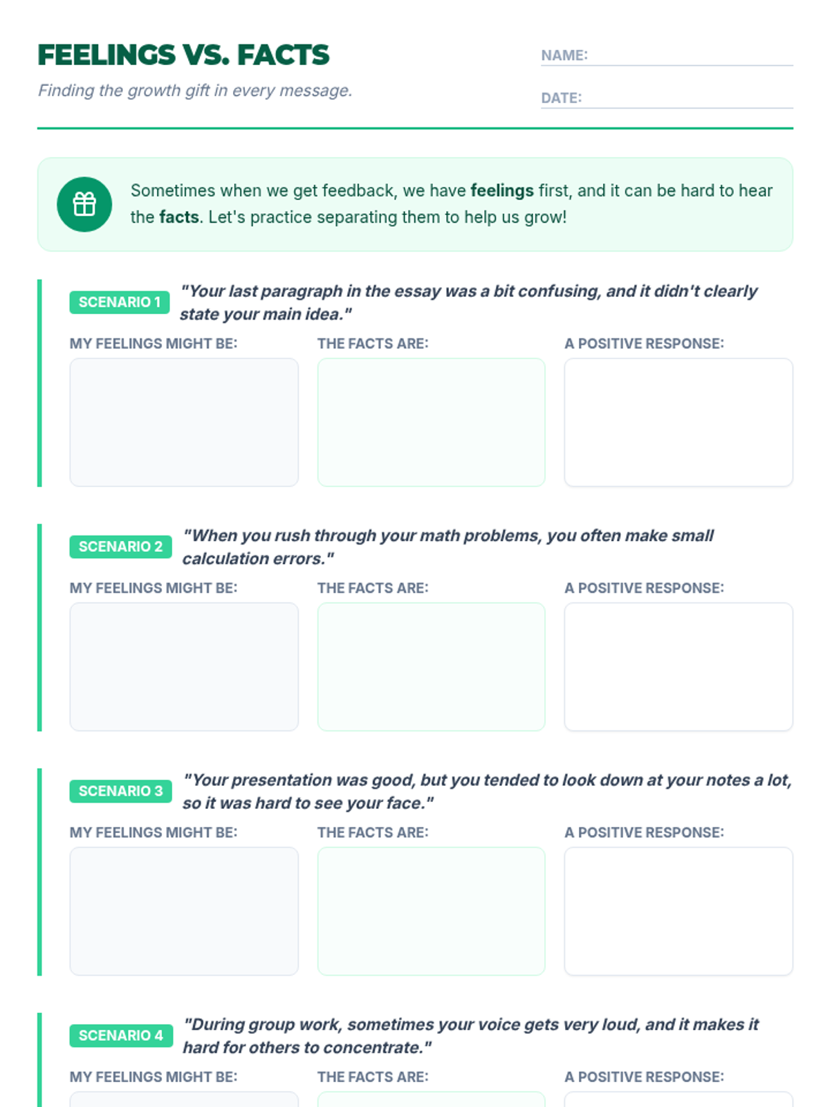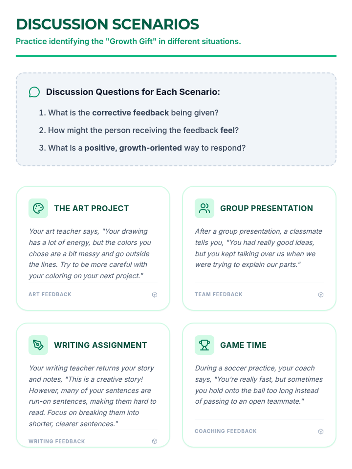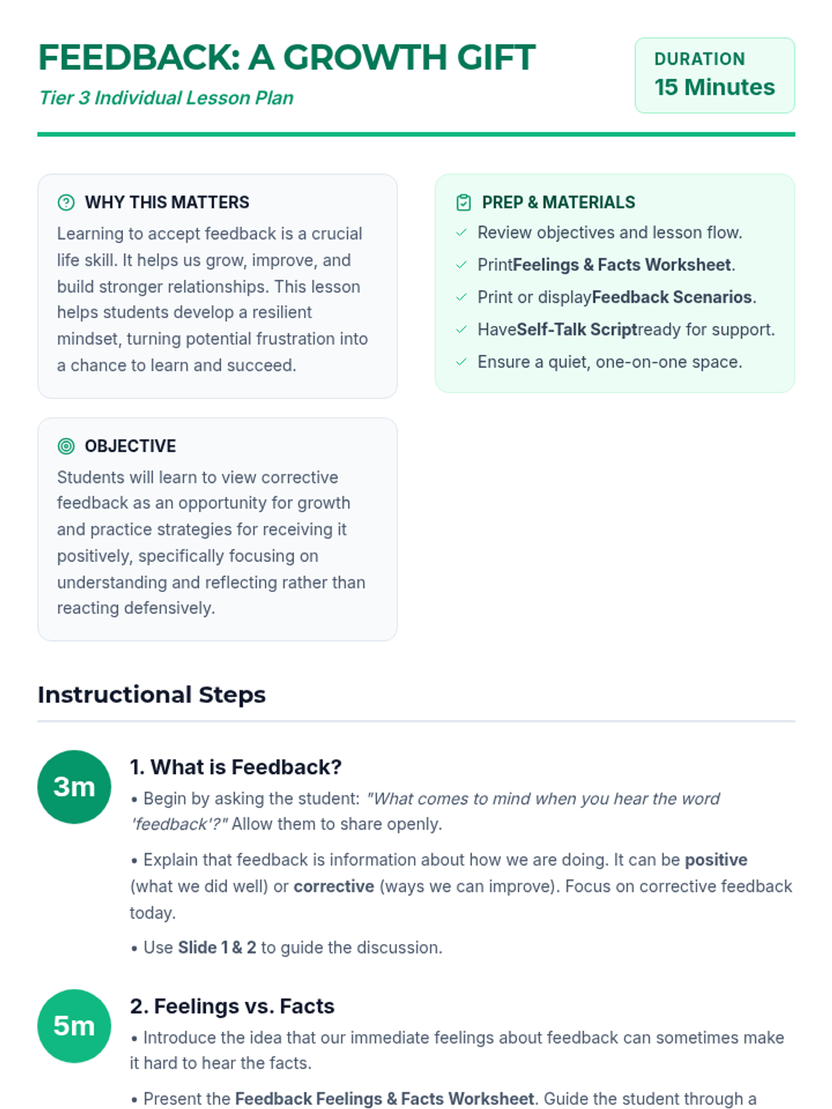 A 15-minute Tier 3 individual lesson for 5th graders focused on transforming corrective feedback into an opportunity for growth through resilience and self-reflection.