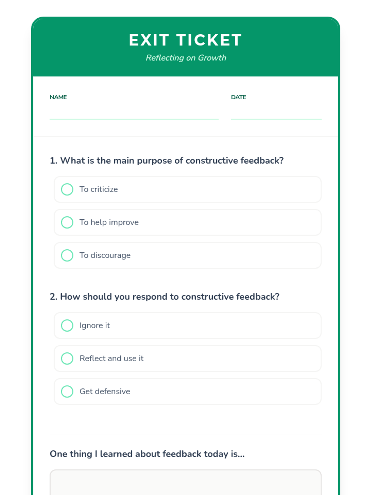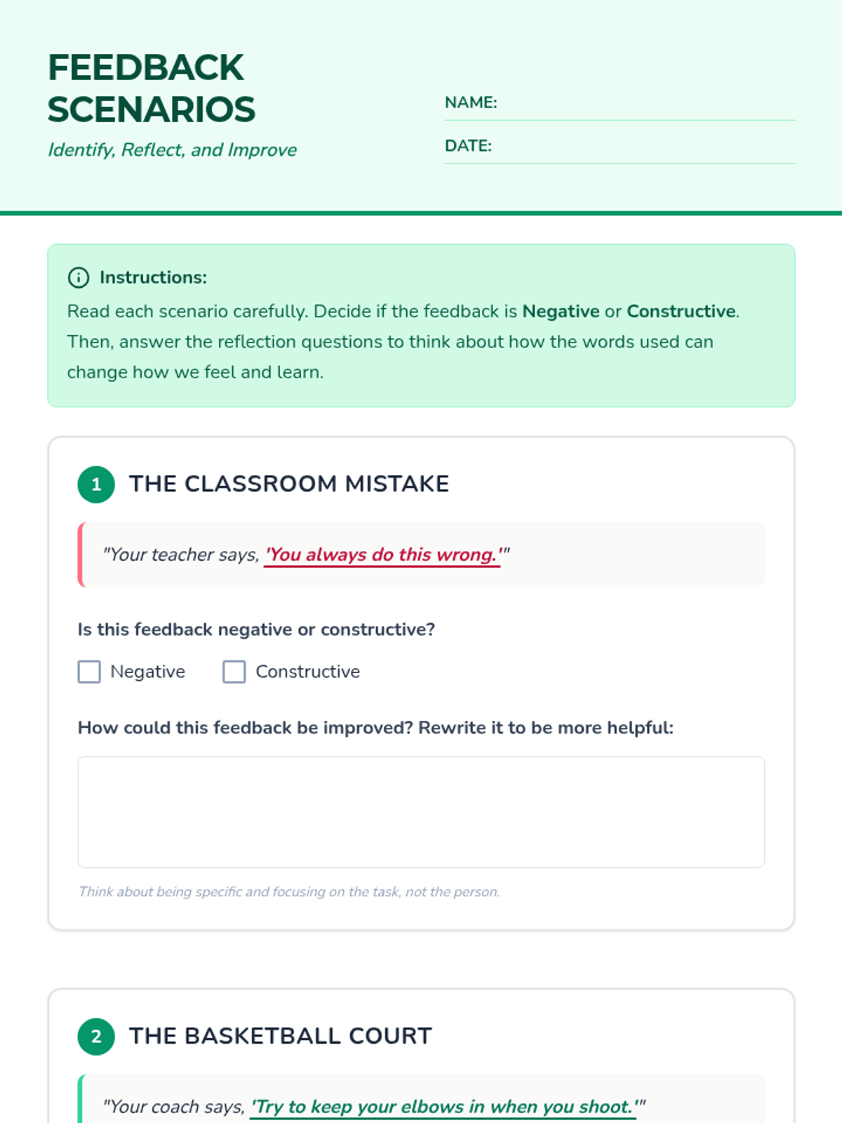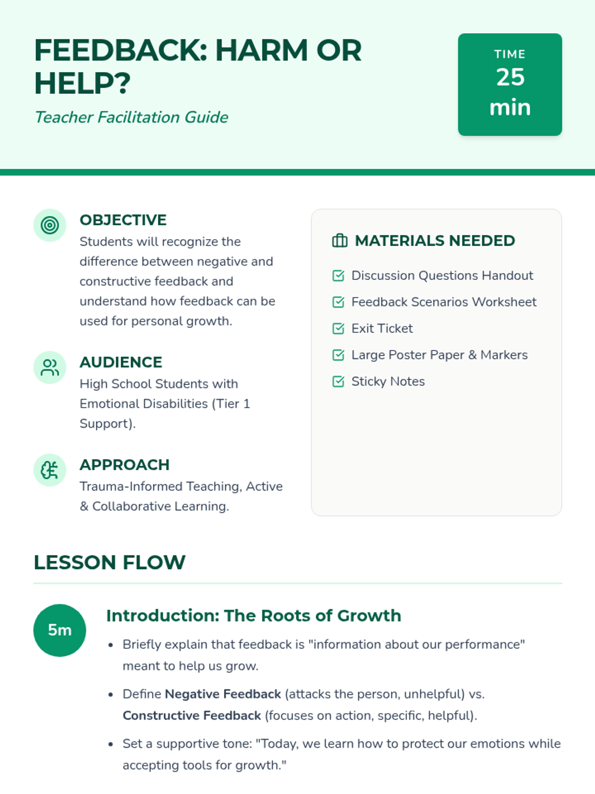 A 25-minute lesson for high school students with emotional disabilities to distinguish between negative and constructive feedback, fostering a growth mindset and emotional resilience.
