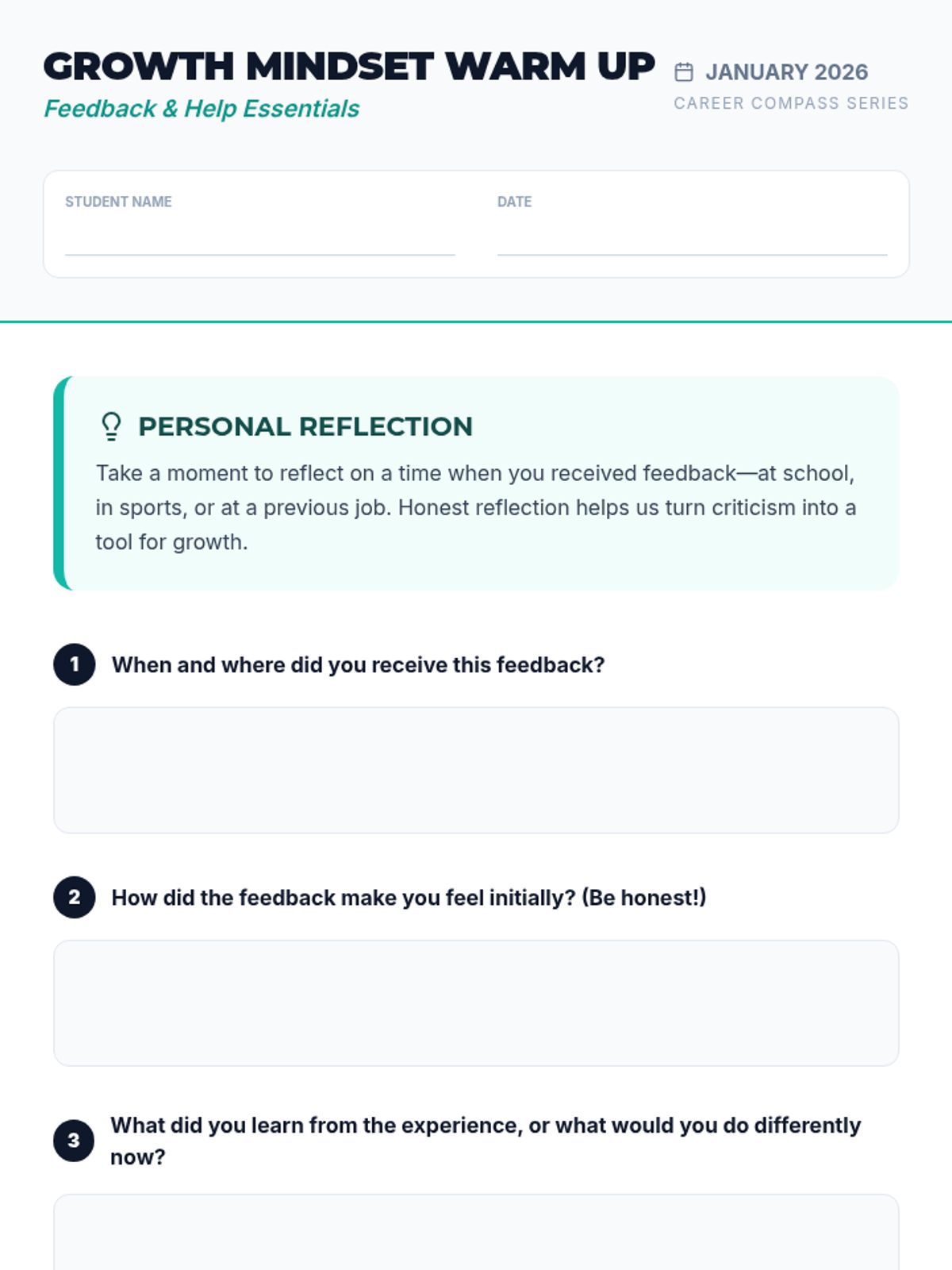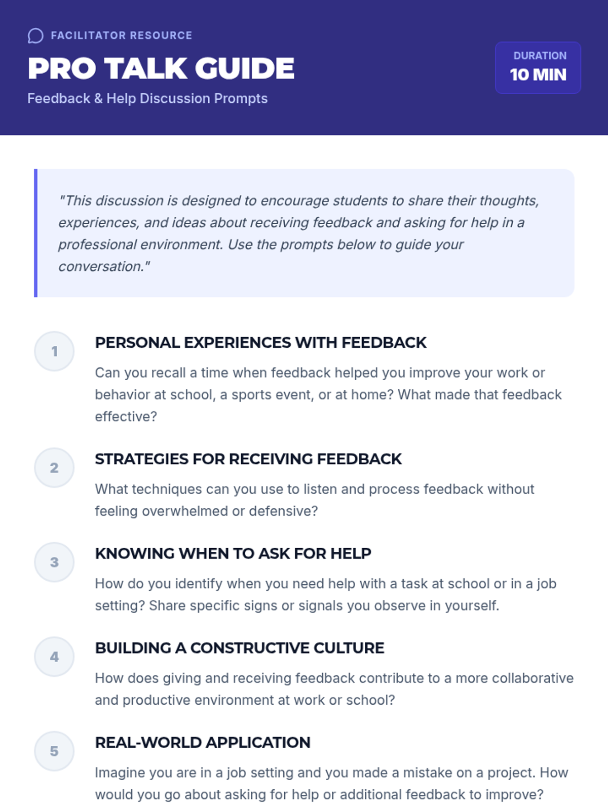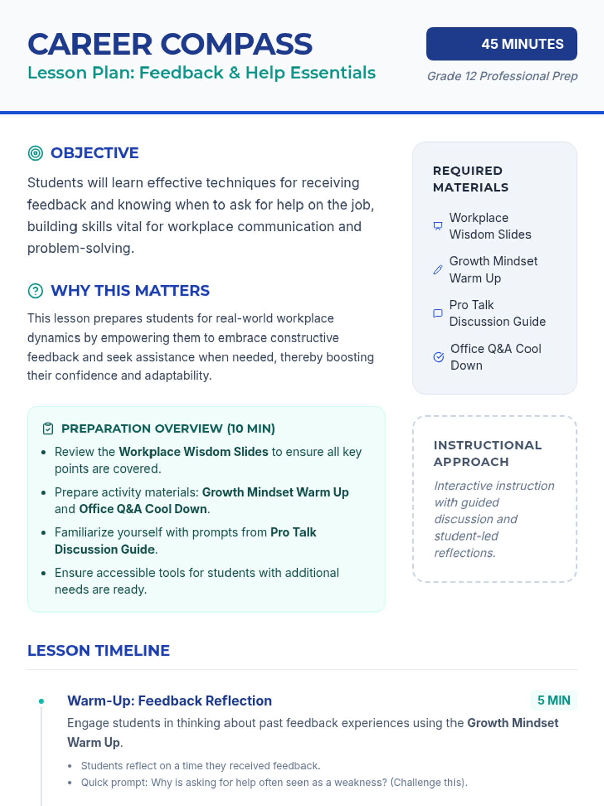 This 45-minute lesson prepares 12th-grade students for professional environments by teaching them how to receive constructive feedback and when to ask for help. Through interactive slides, reflections, and discussions, students build the communication skills necessary for workplace success.