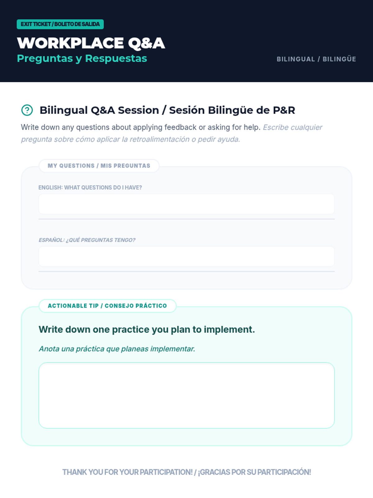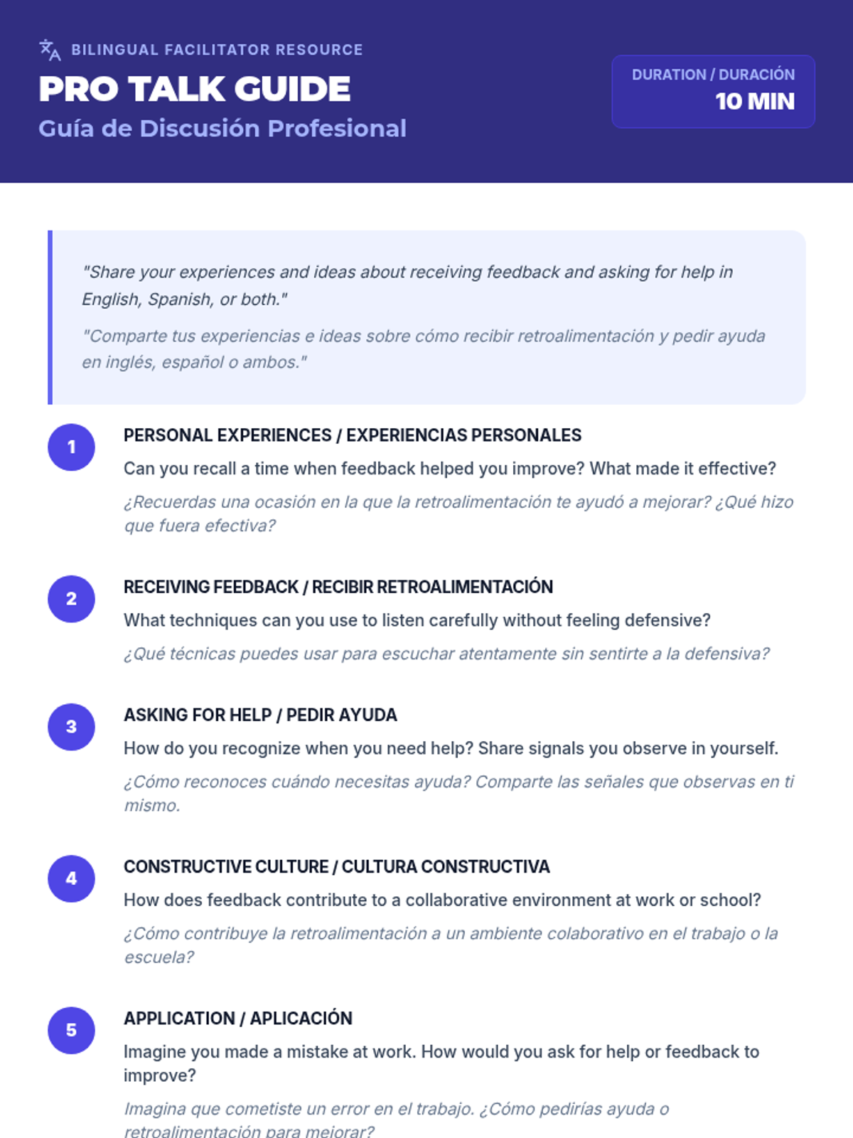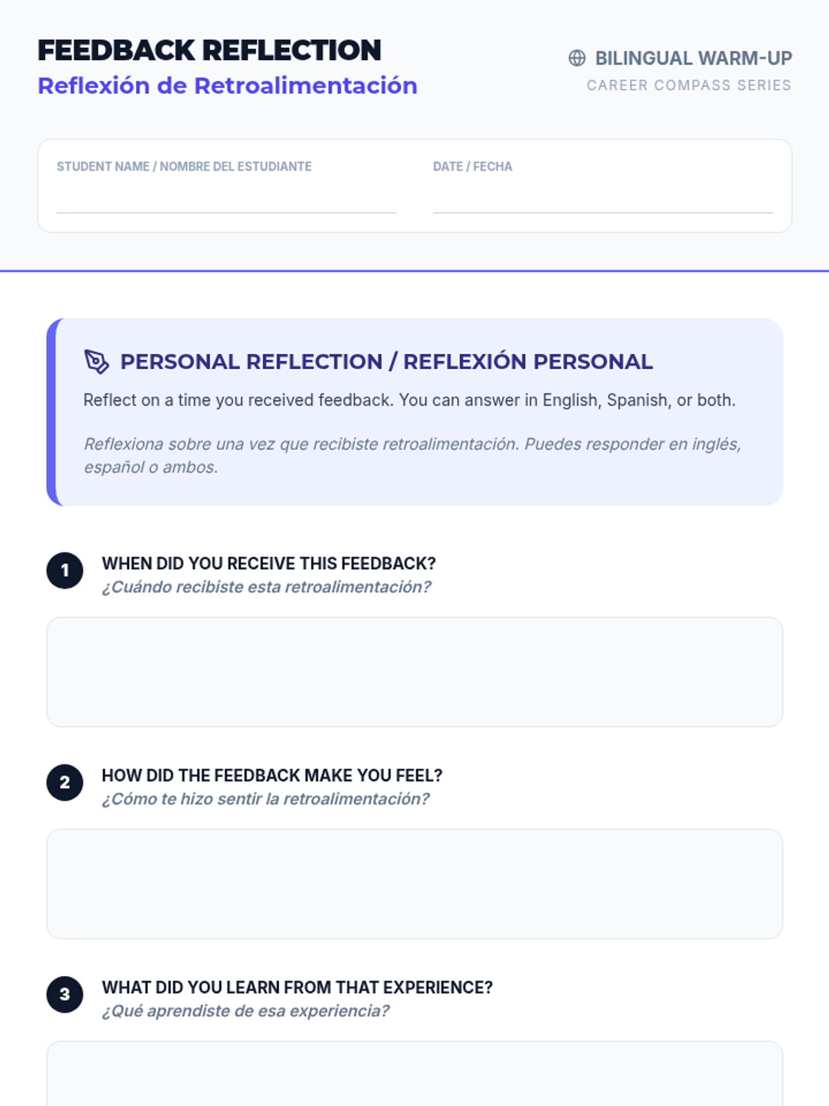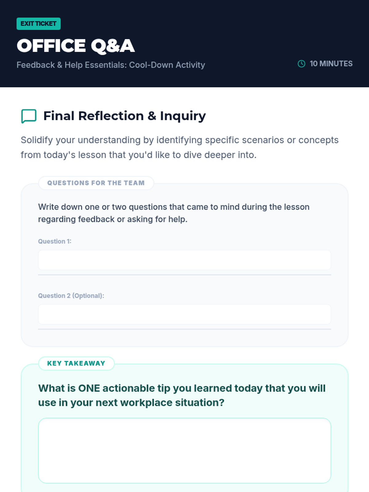 This 45-minute lesson prepares 12th-grade students for professional environments by teaching them how to receive constructive feedback and when to ask for help. Through interactive slides, reflections, and discussions, students build the communication skills necessary for workplace success.