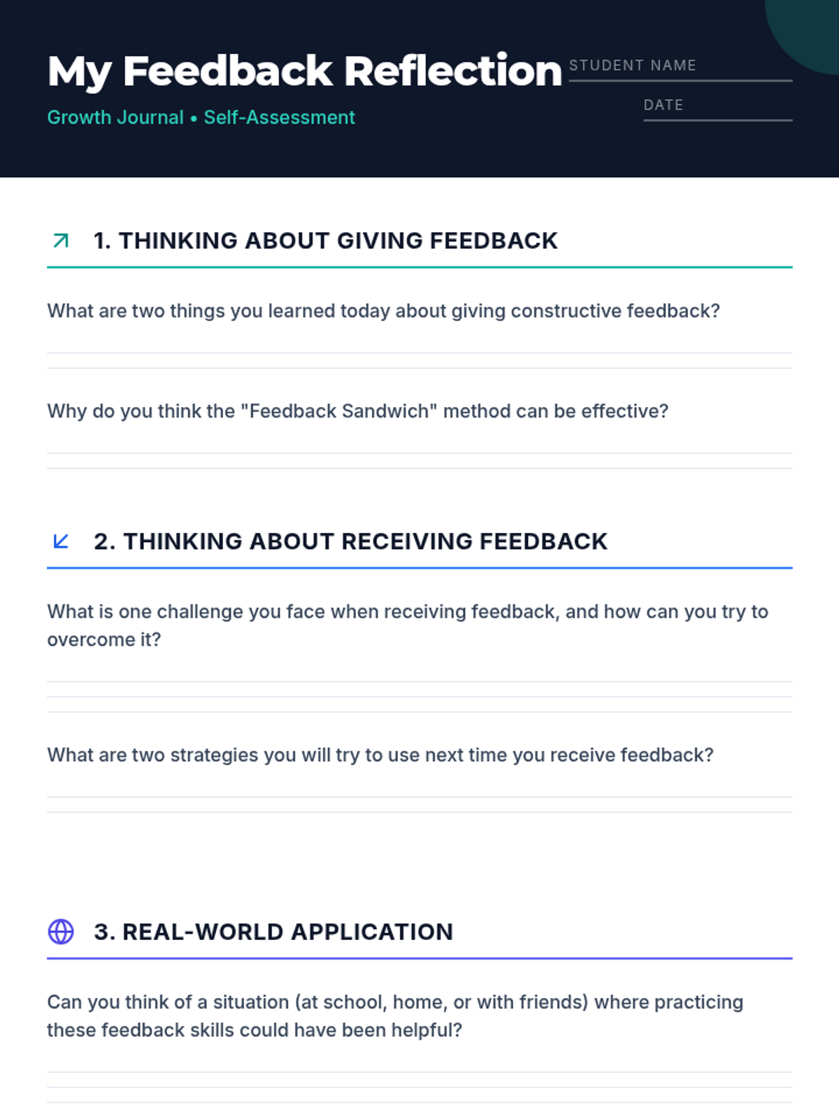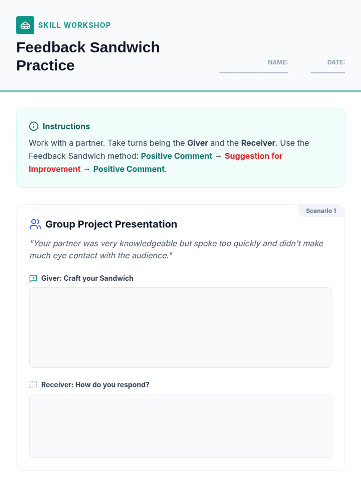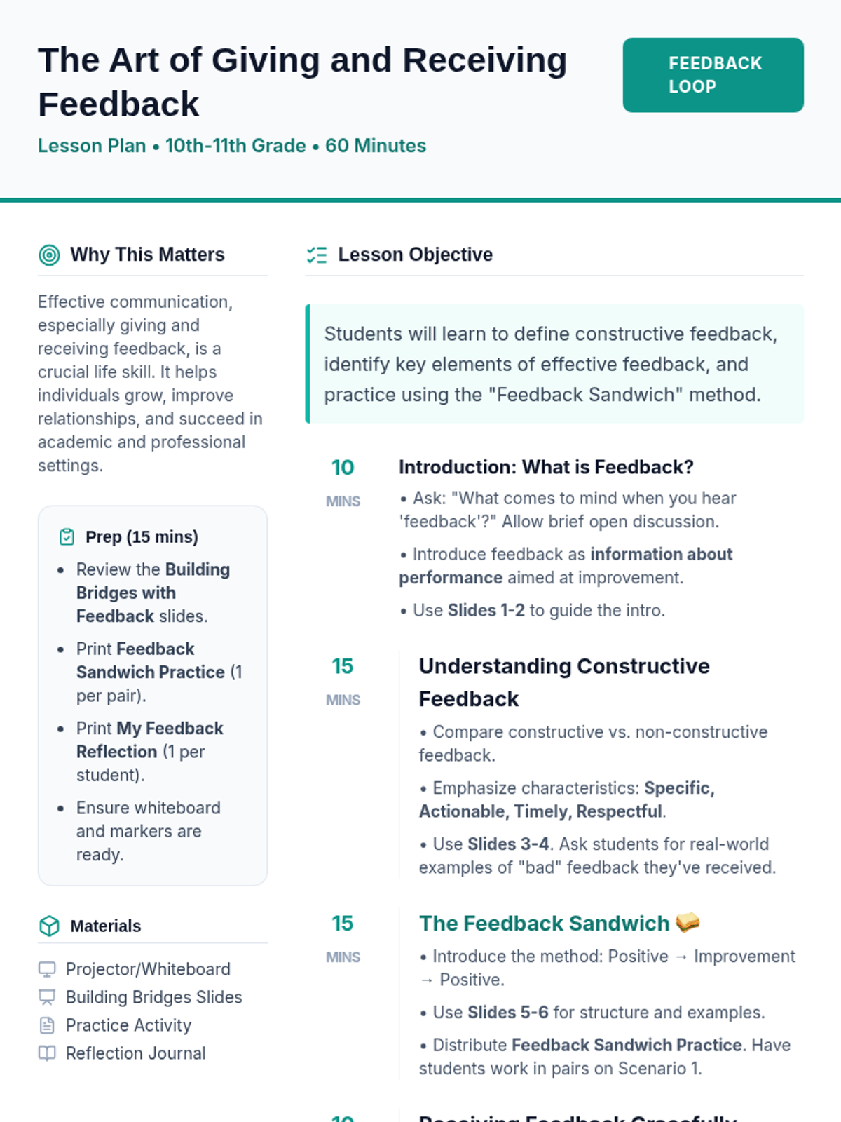 A 60-minute lesson for 10th-11th grade students on mastering the art of constructive feedback. Students will learn the 'Feedback Sandwich' method and practice both giving and receiving feedback gracefully.
