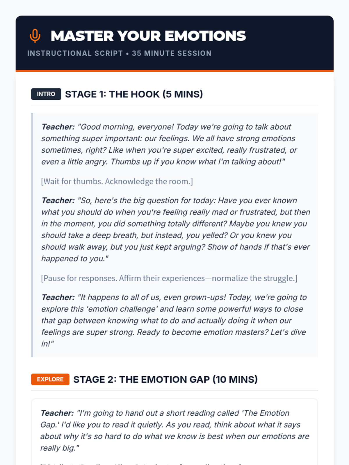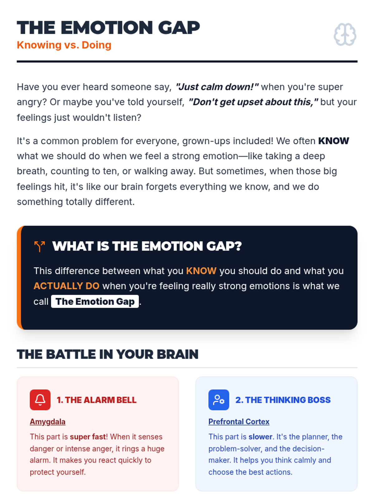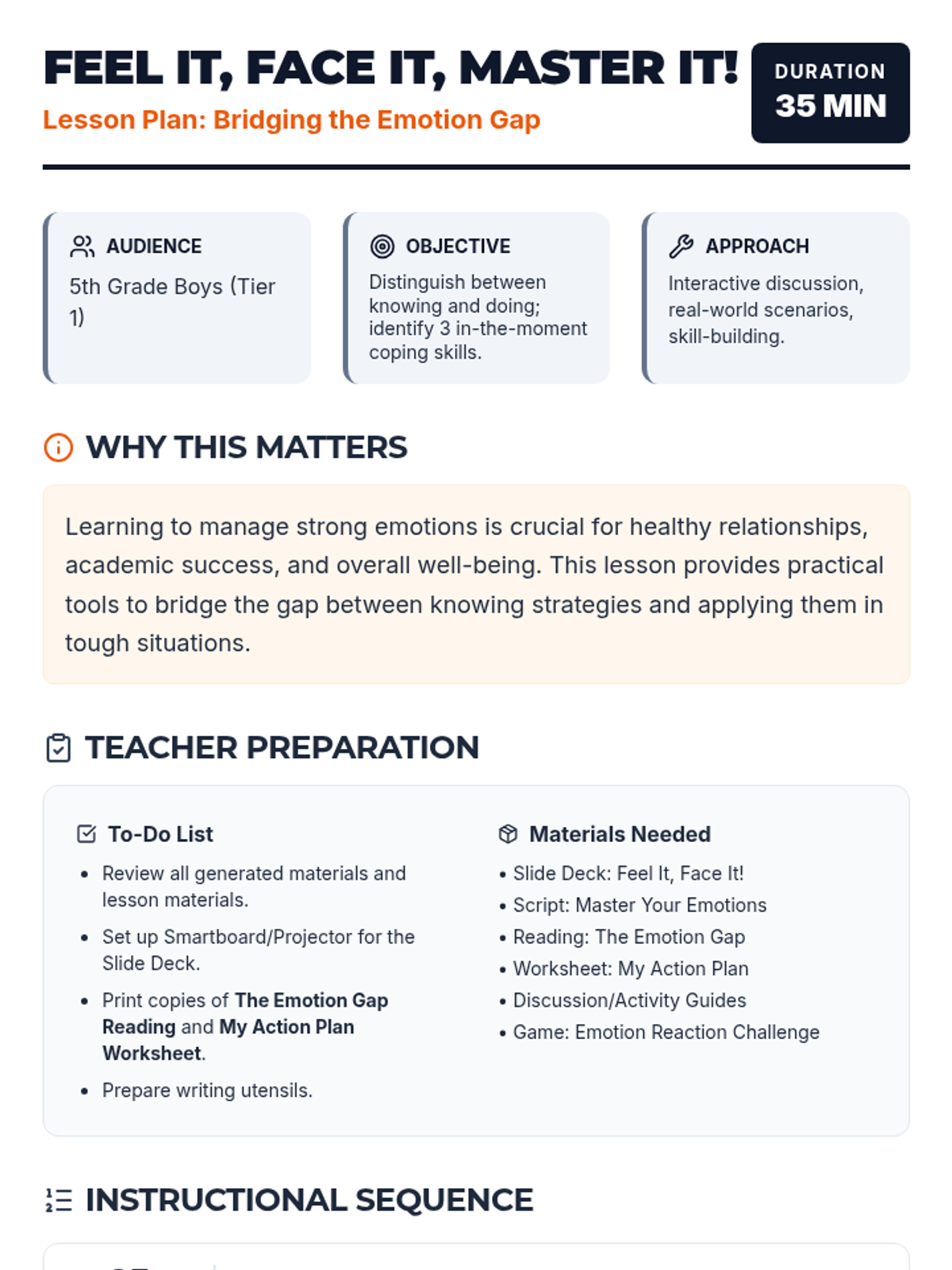A 35-minute lesson for 5th-grade boys focused on bridging the gap between knowing emotional regulation strategies and applying them in the moment. Students explore the 'Emotion Gap' through a reading, discussion, and interactive game.