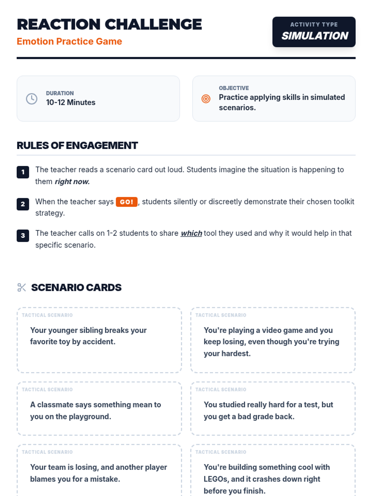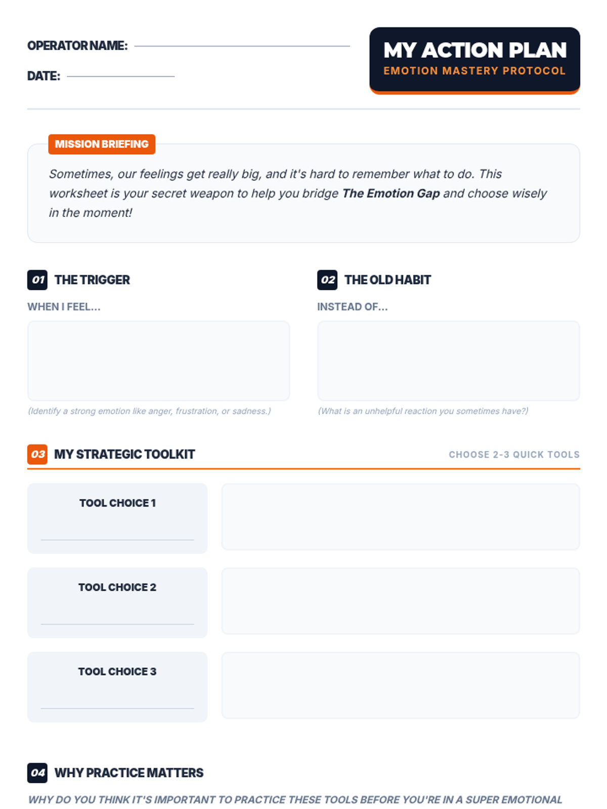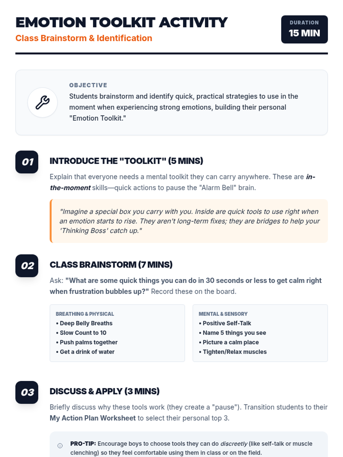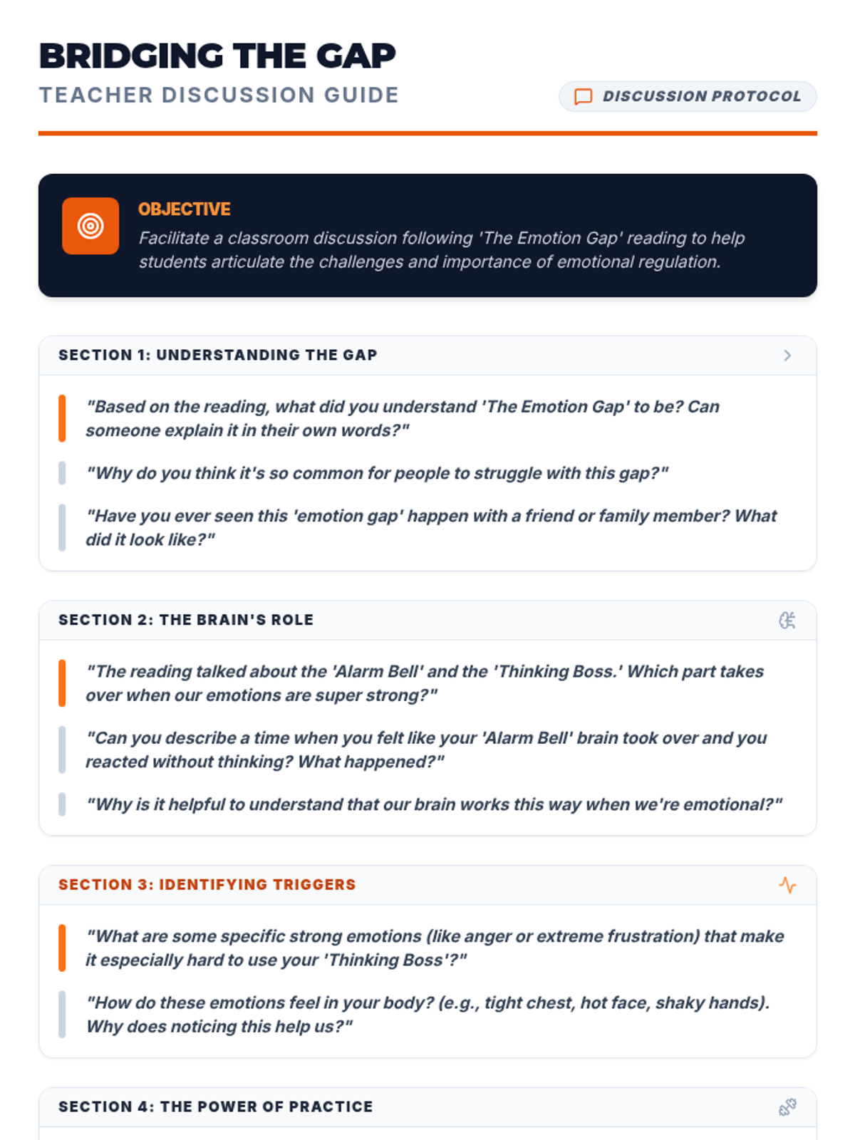 A 35-minute lesson for 5th-grade boys focused on bridging the gap between knowing emotional regulation strategies and applying them in the moment. Students explore the 'Emotion Gap' through a reading, discussion, and interactive game.