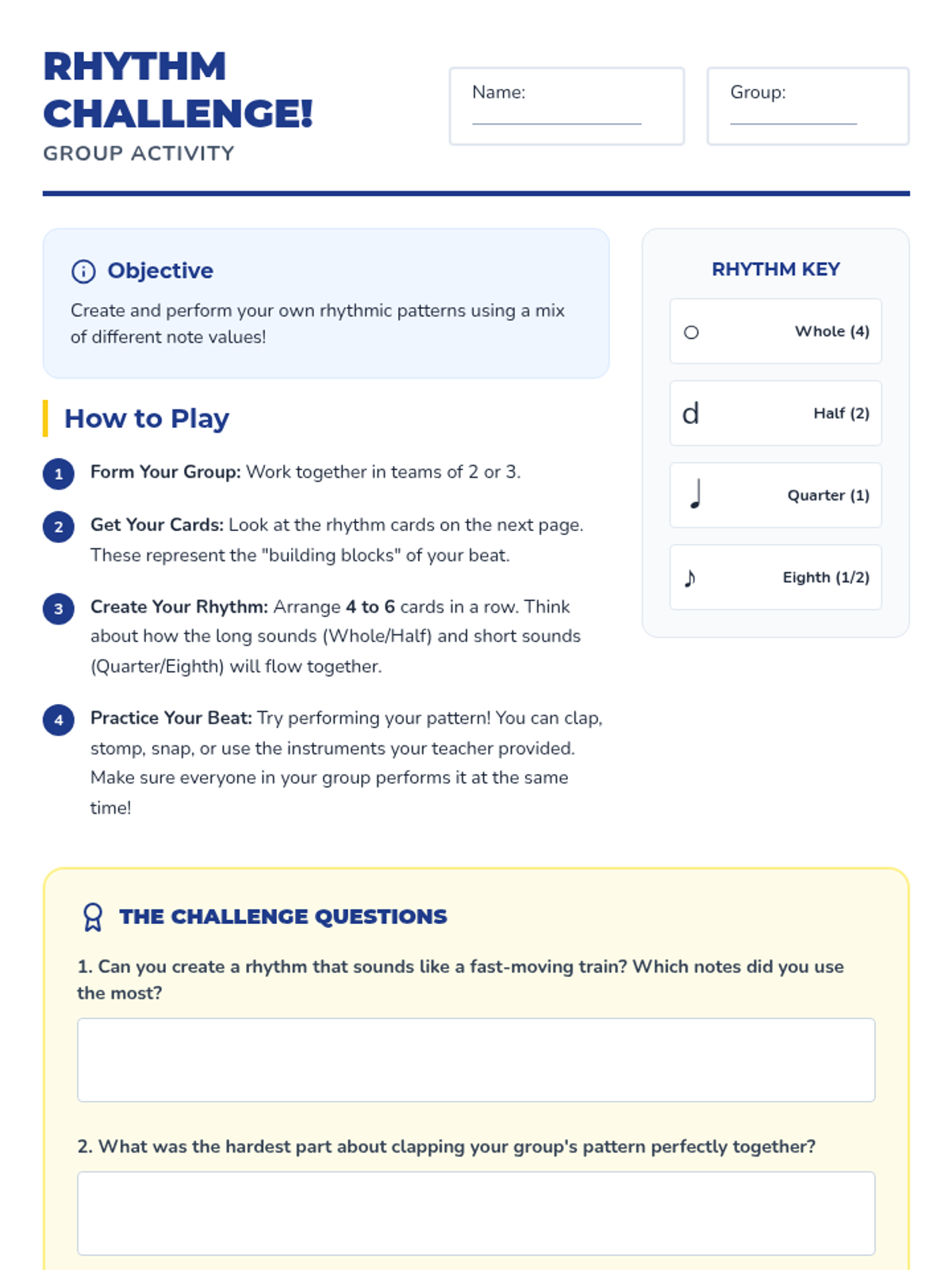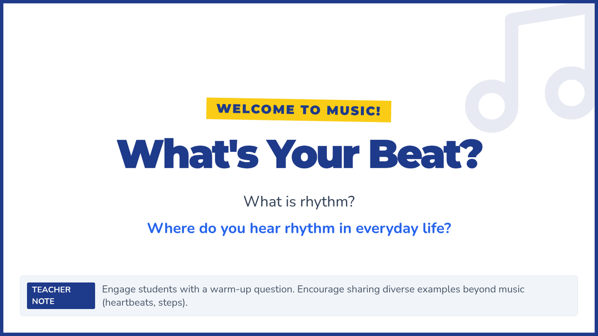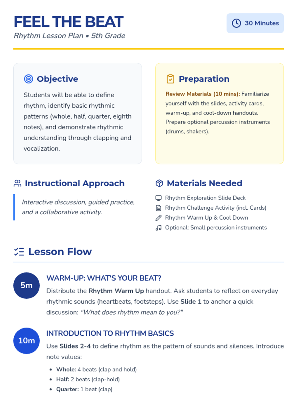 A high-energy 30-minute introduction to rhythm for 5th graders, covering note values from whole to eighth notes through interactive clapping and creation.