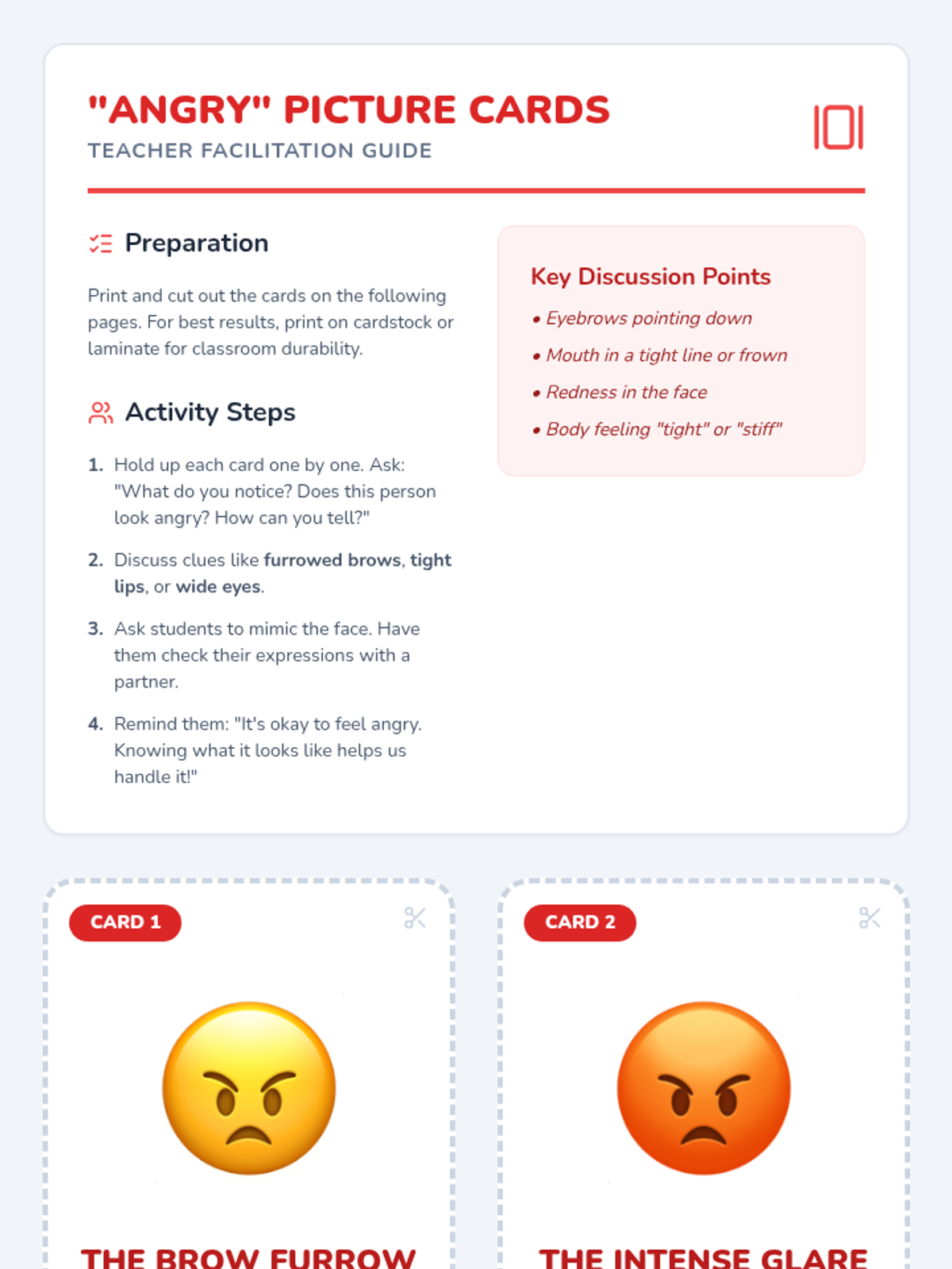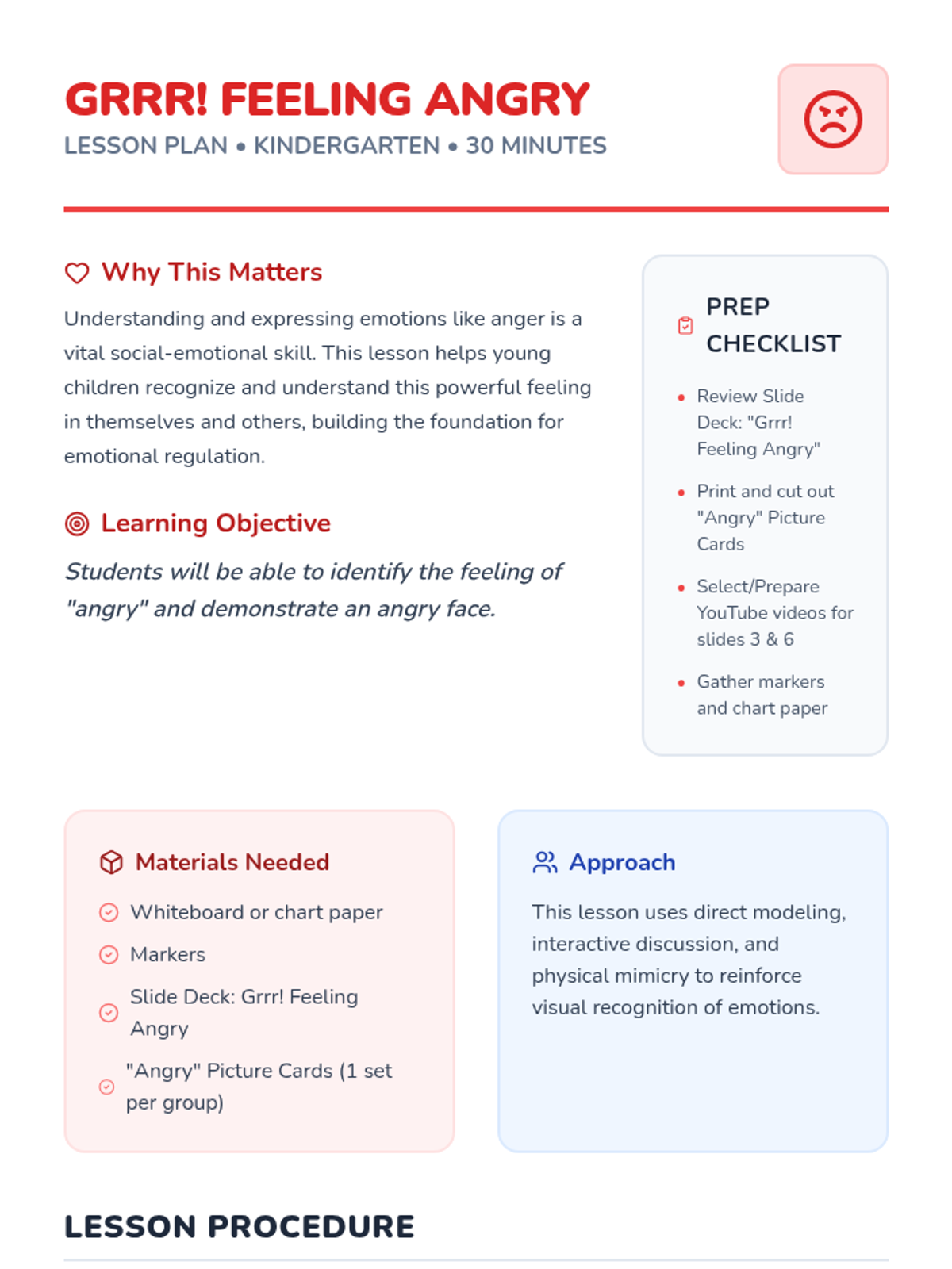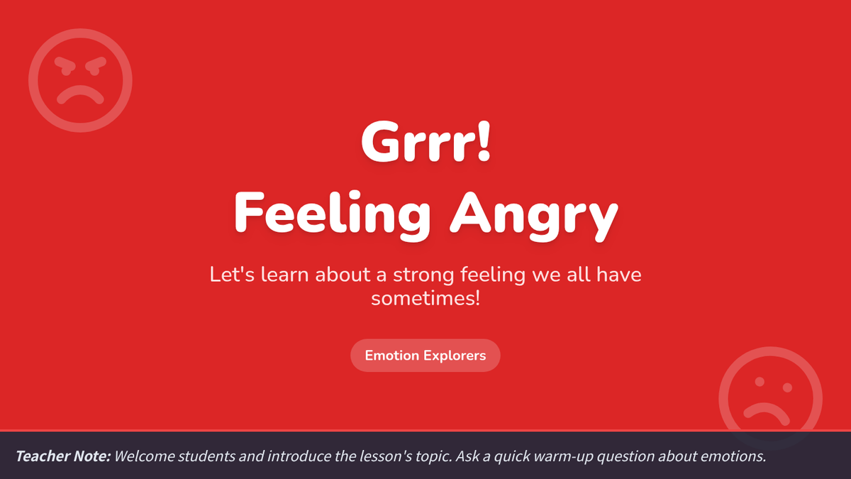A 30-minute social-emotional learning lesson for Kindergarten students to help them recognize, identify, and express the feeling of anger through facial expressions and discussion.