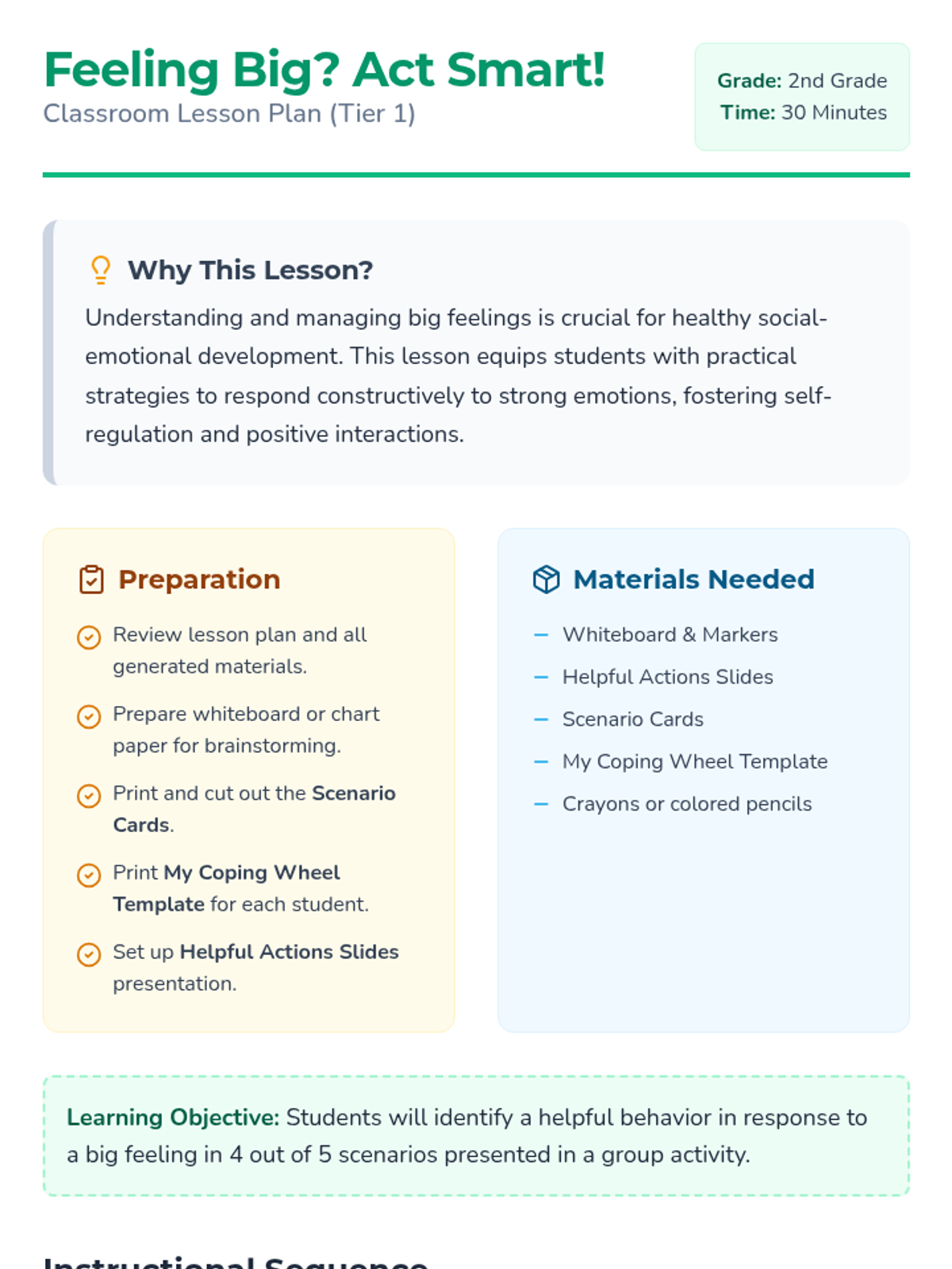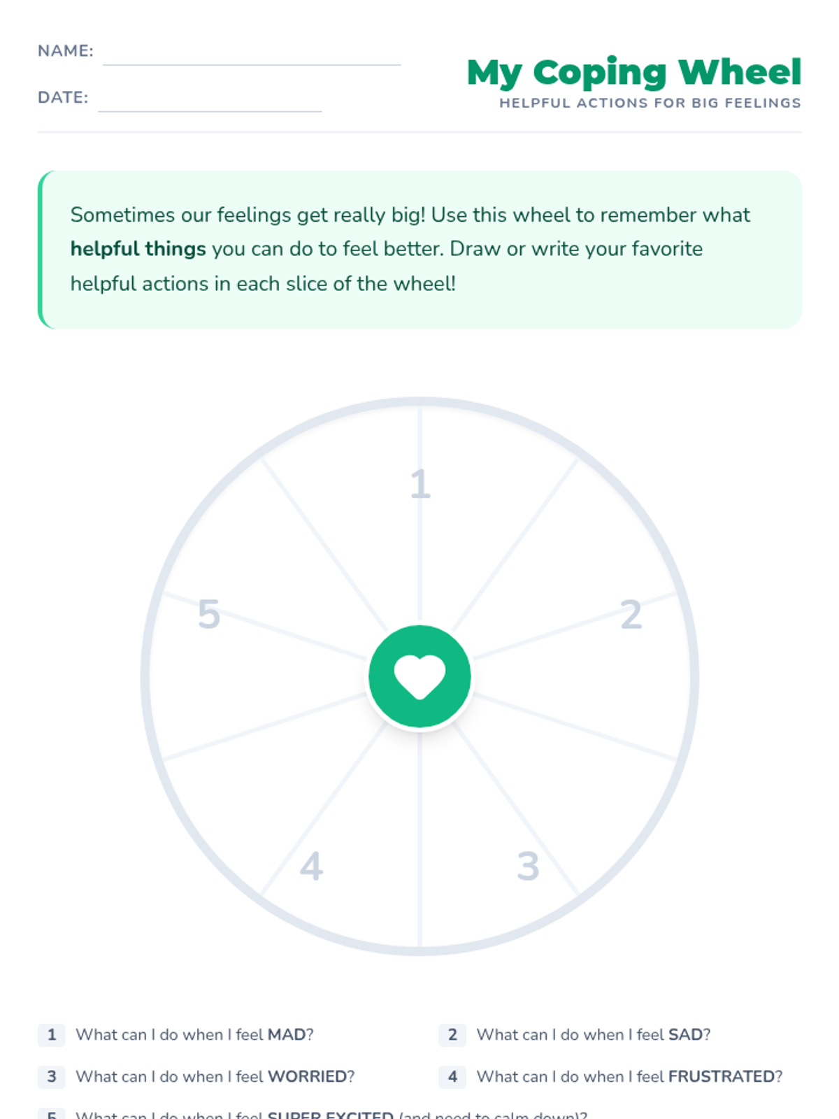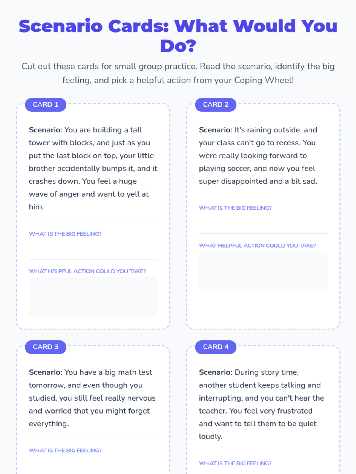 A 30-minute SEL lesson for 2nd graders to help them identify intense emotions and choose constructive coping strategies. Students create a personalized 'Coping Wheel' and practice applying it to real-world scenarios.
