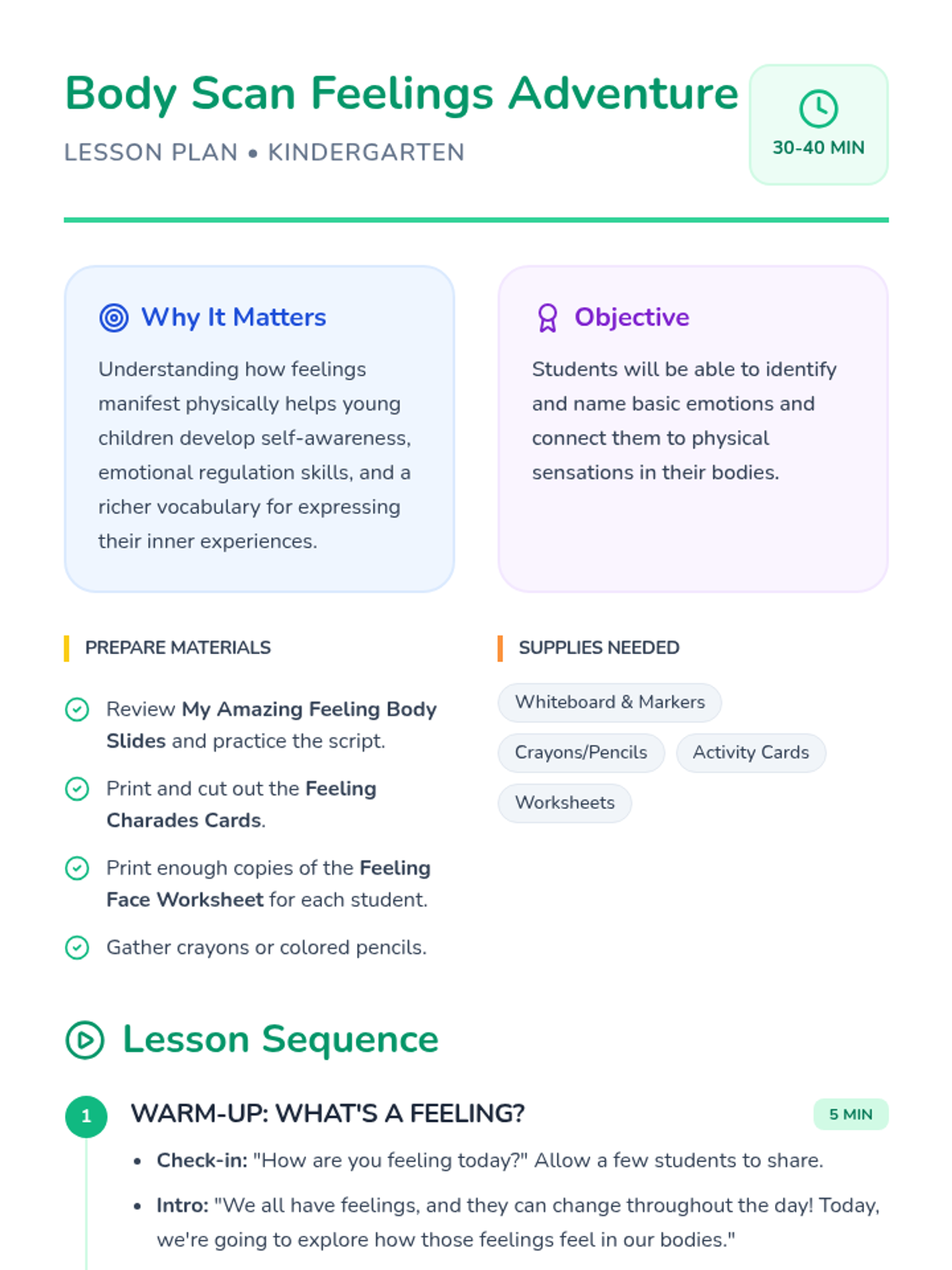 This interactive lesson introduces kindergarteners to the connection between emotions and physical sensations, helping them build self-awareness and emotional vocabulary through a body scan adventure, charades, and drawing.