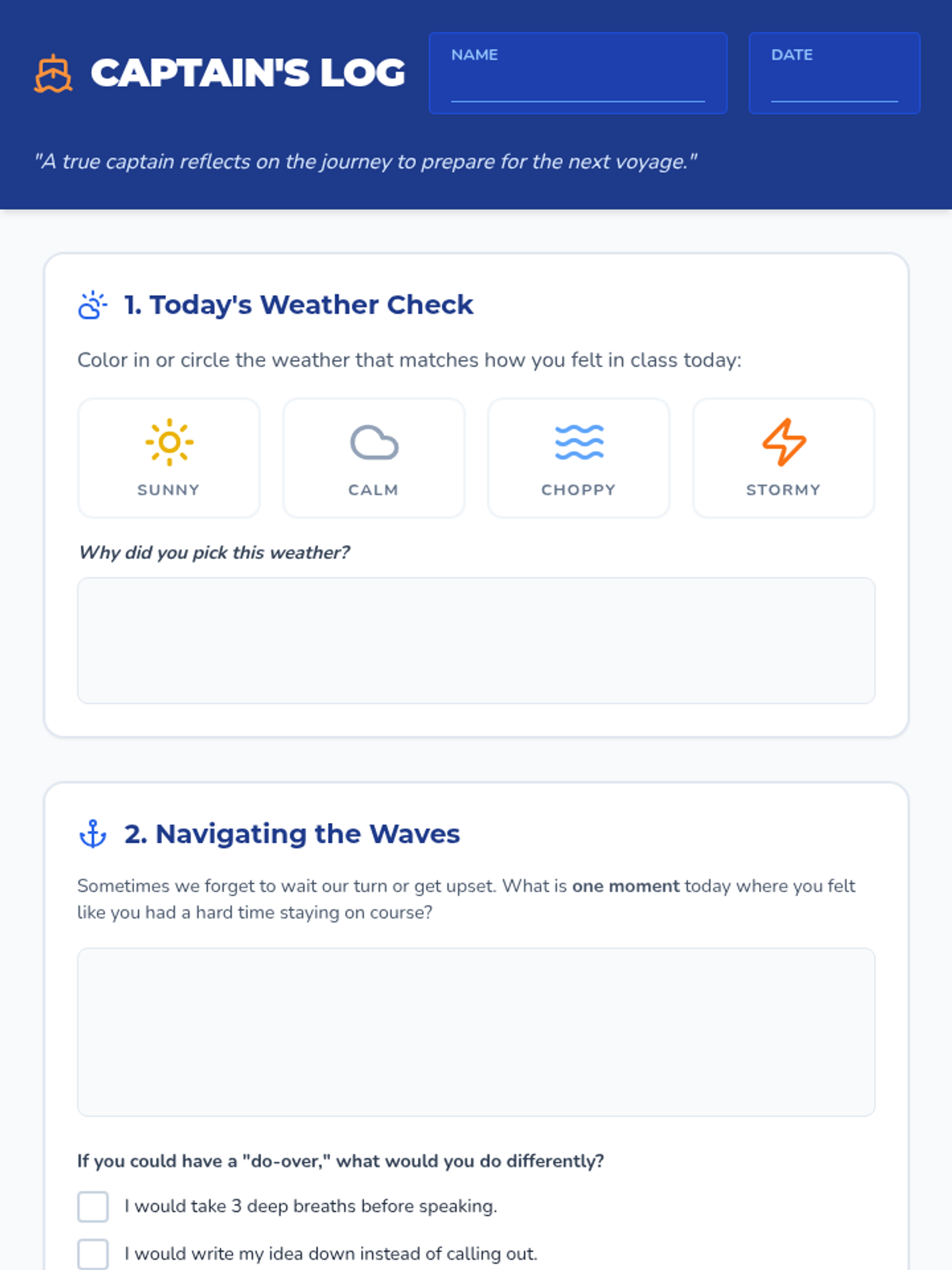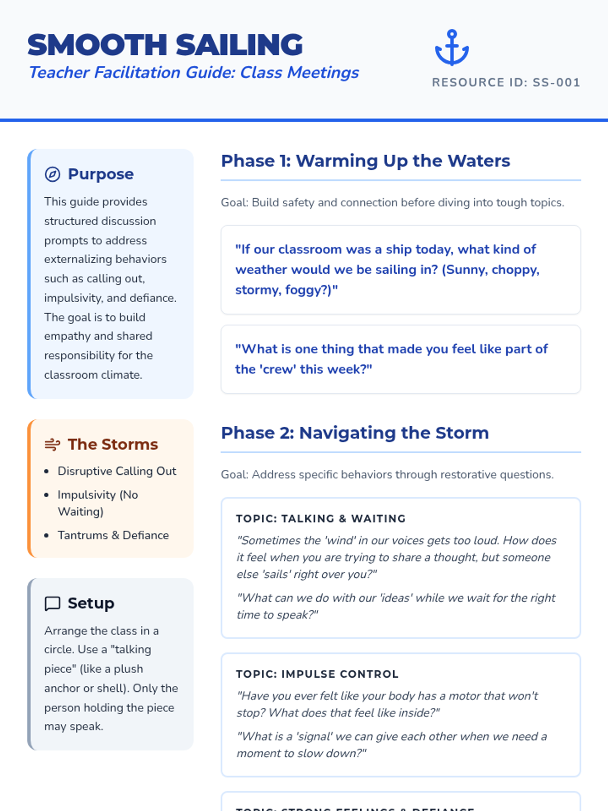 A lesson designed to help 3rd graders navigate externalizing behaviors like calling out and impulsivity through restorative class meetings and self-reflection tools.