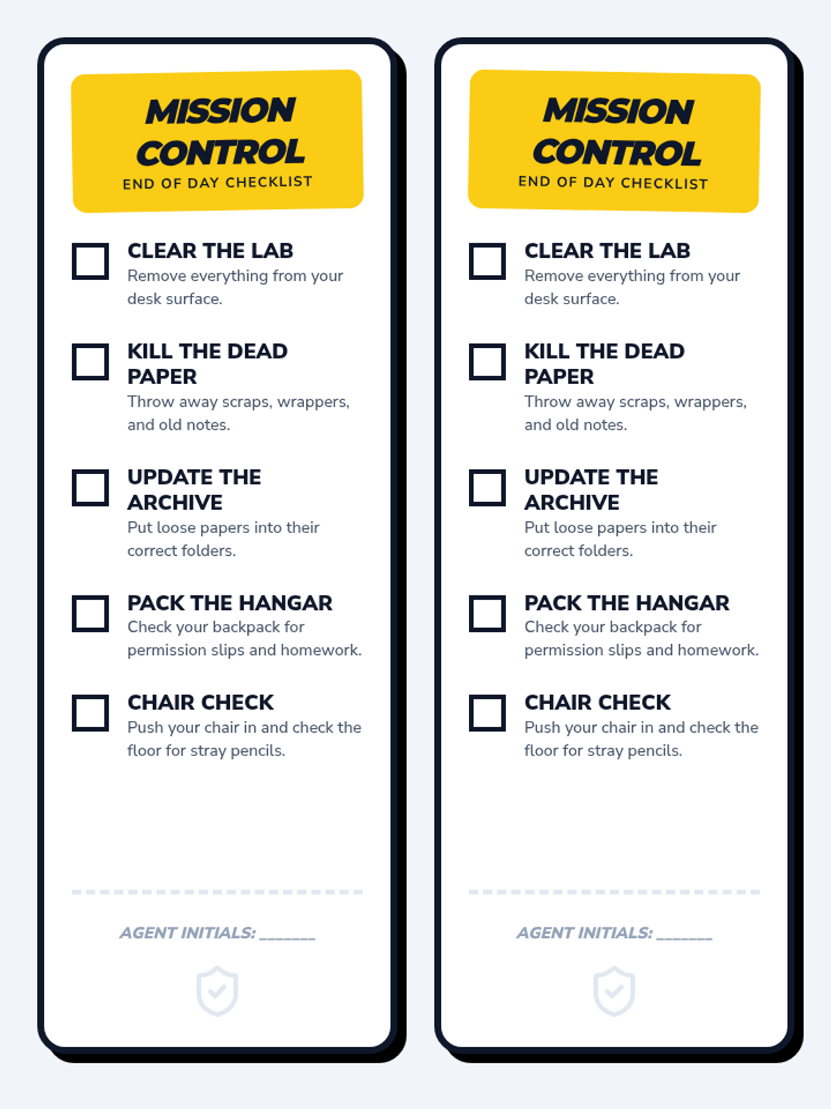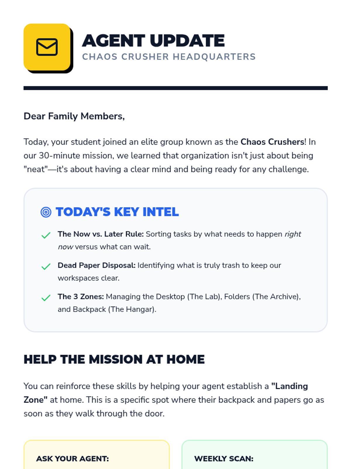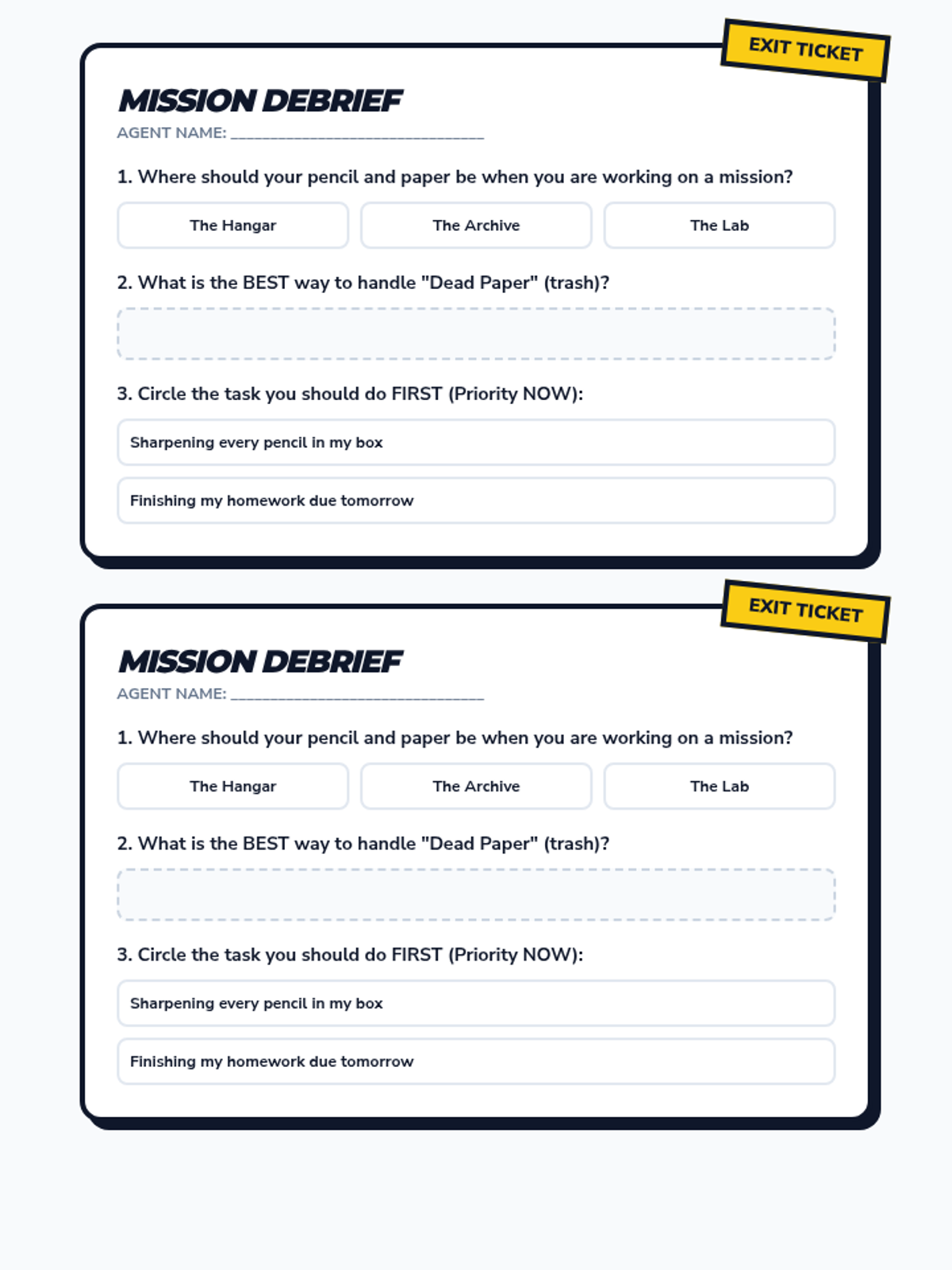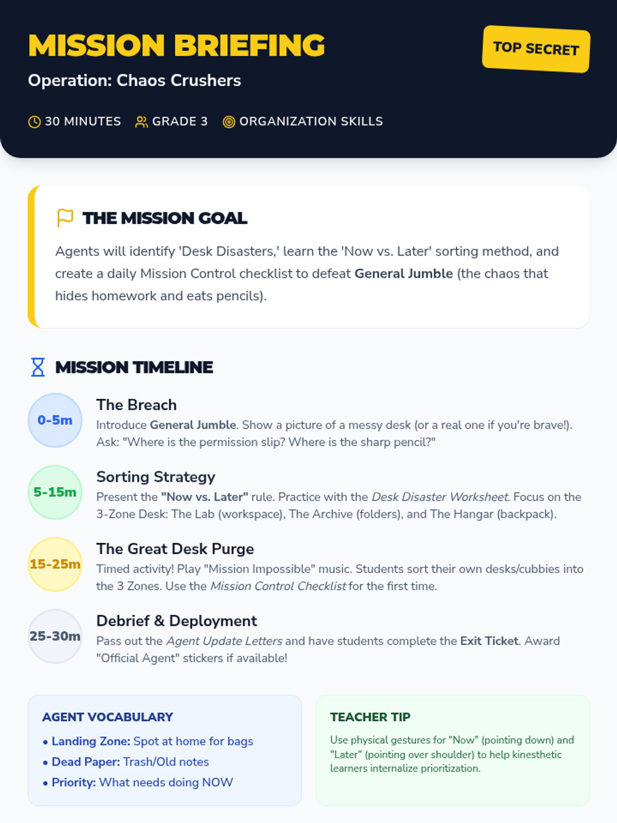 A high-energy, 30-minute mission-based lesson where 3rd graders learn to defeat 'General Jumble' by mastering desk organization and task prioritization. Students take on the role of Chaos Crusher Agents to organize their learning environments and schedules.