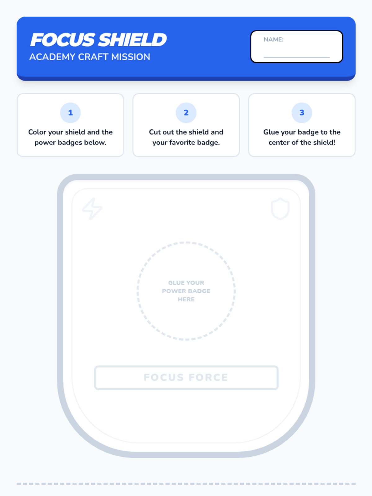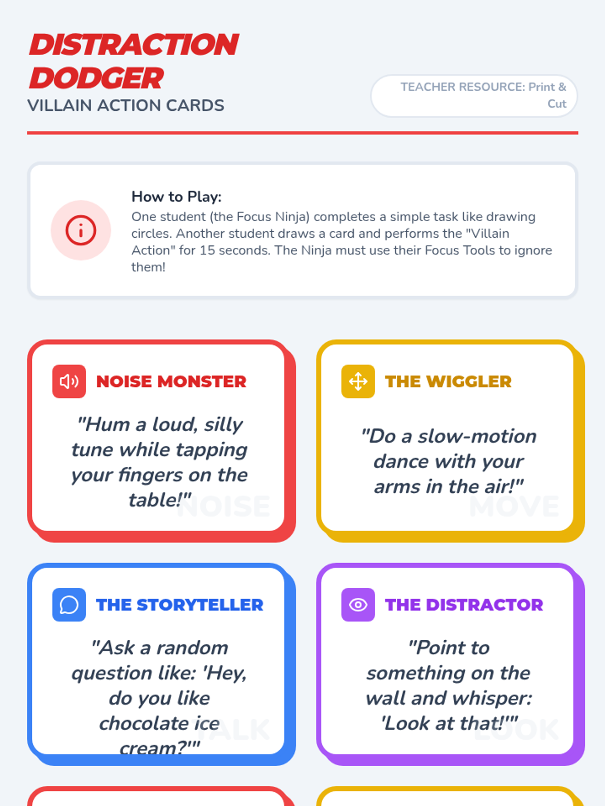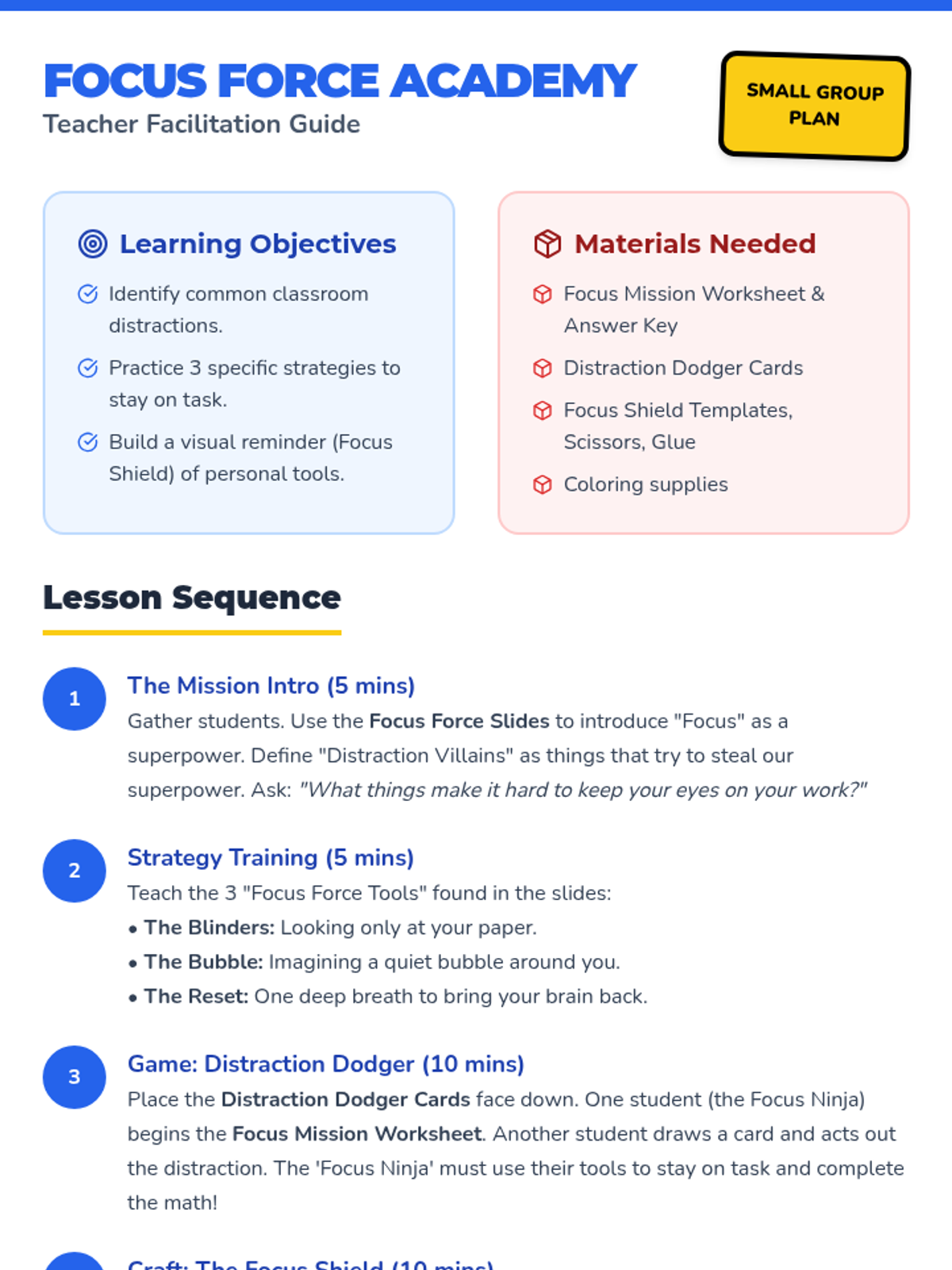 A small-group lesson for 2nd graders to learn focus strategies through the 'Focus Force' superhero theme. Includes a mini-lesson, a 'Distraction Dodger' game, and a 'Focus Shield' craft activity.