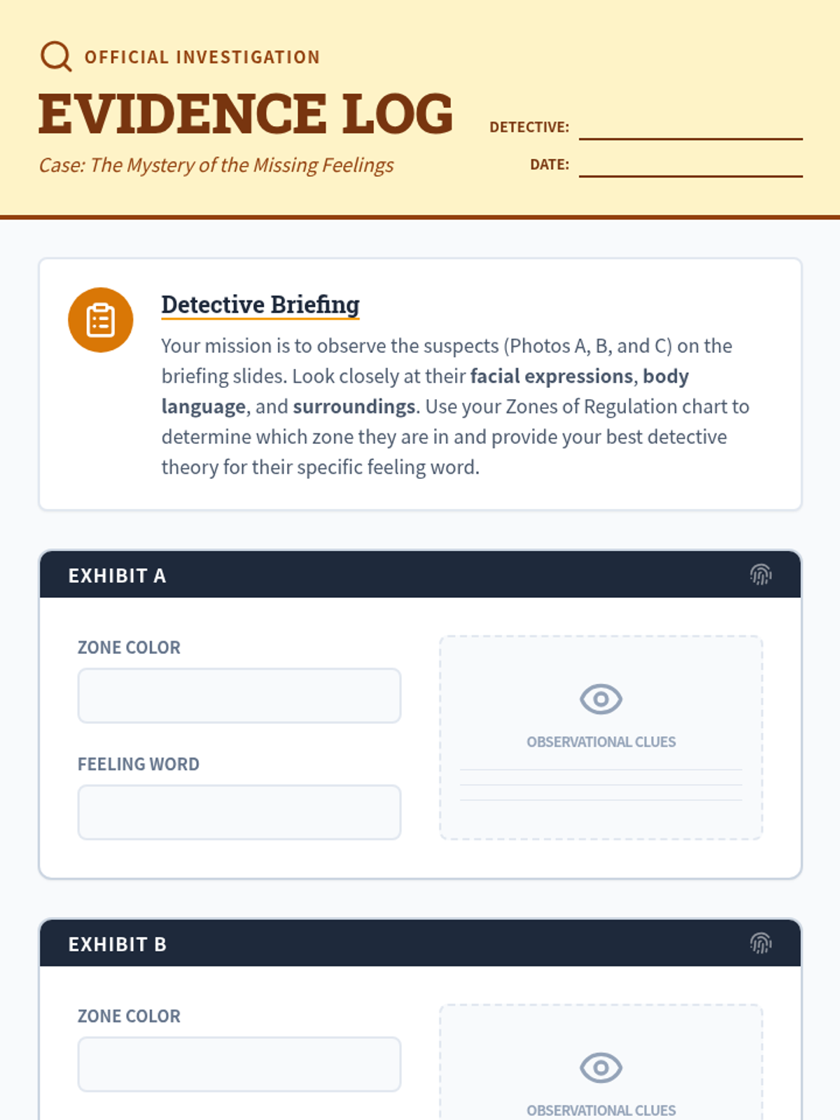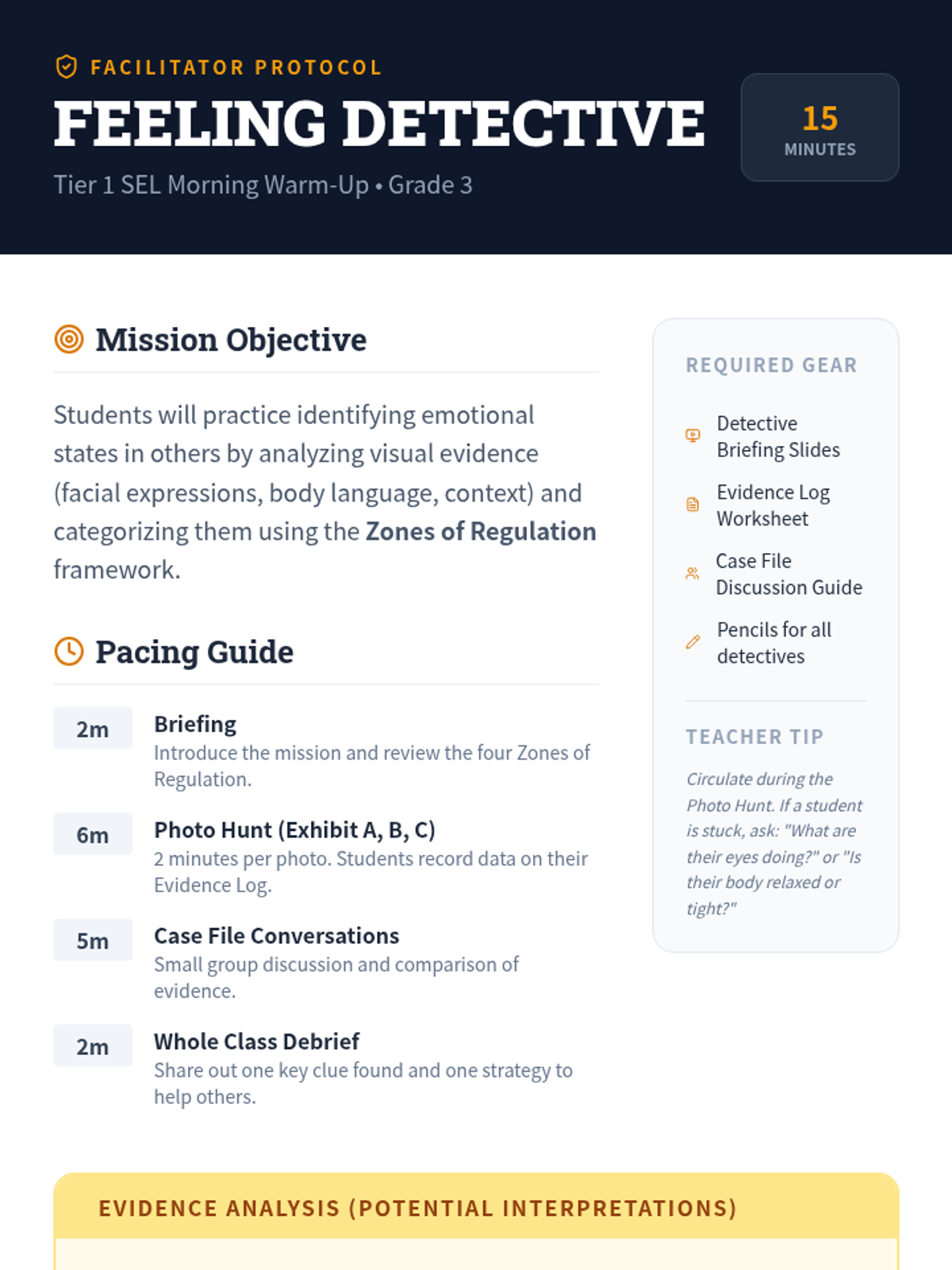 A 15-minute Tier 1 SEL warm-up where 3rd graders act as emotion detectives, using the Zones of Regulation to identify feelings in others based on visual clues.