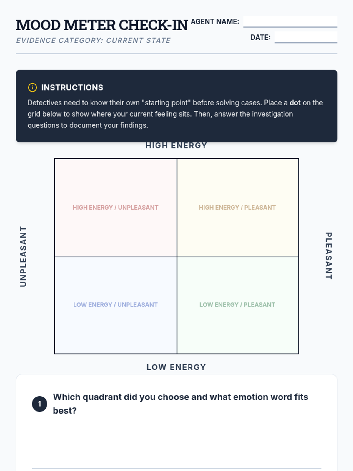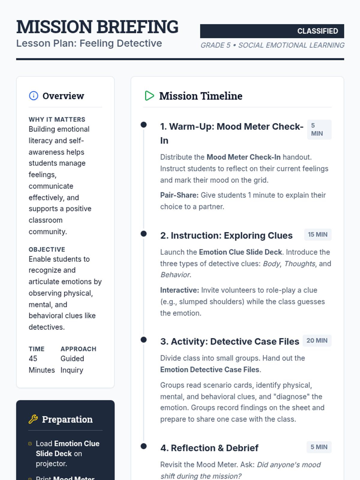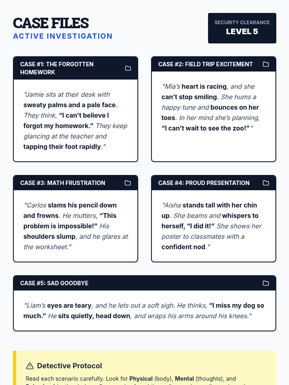 A detective-themed emotional literacy lesson for 5th graders to identify physical, mental, and behavioral clues of emotions.