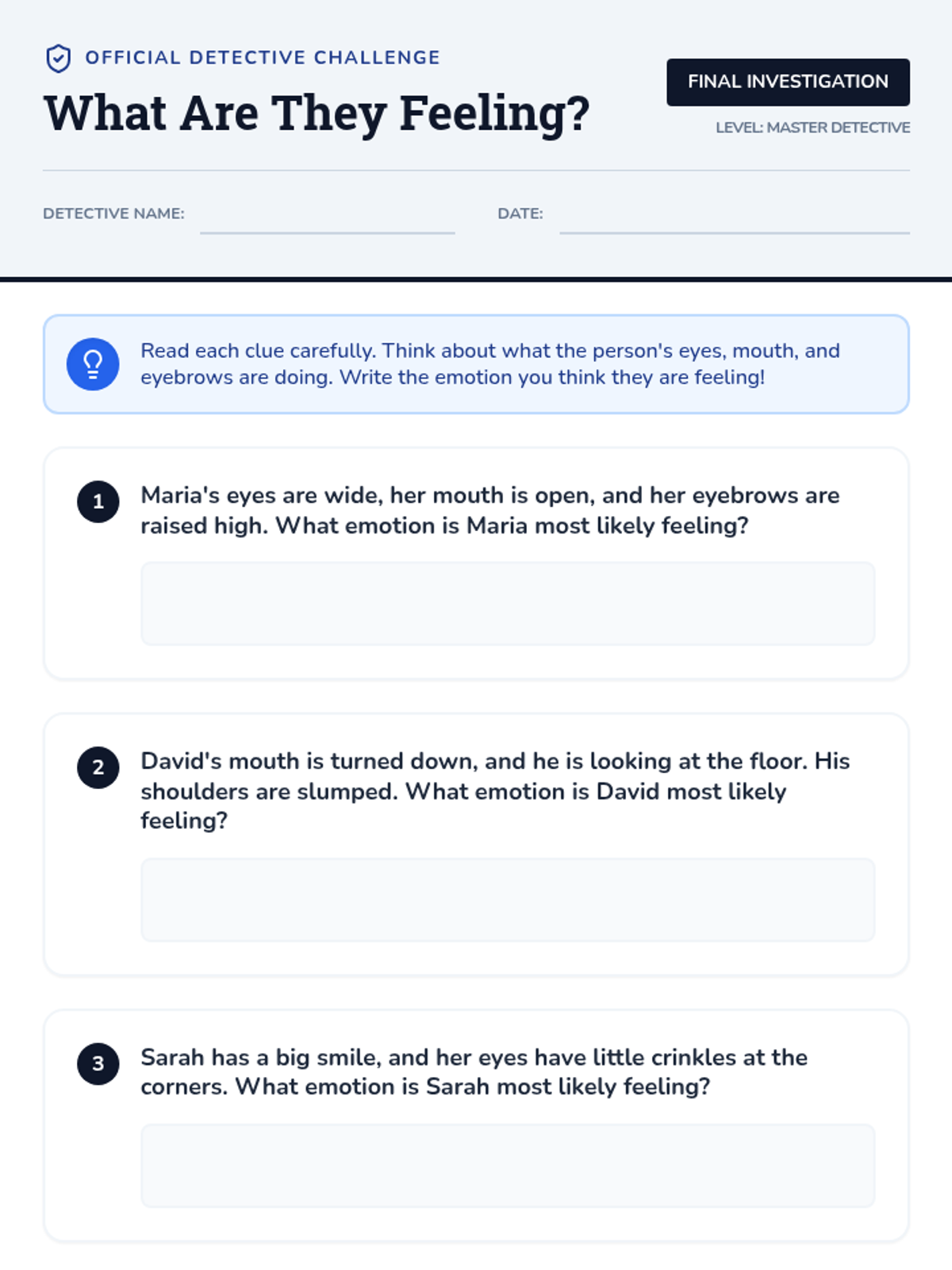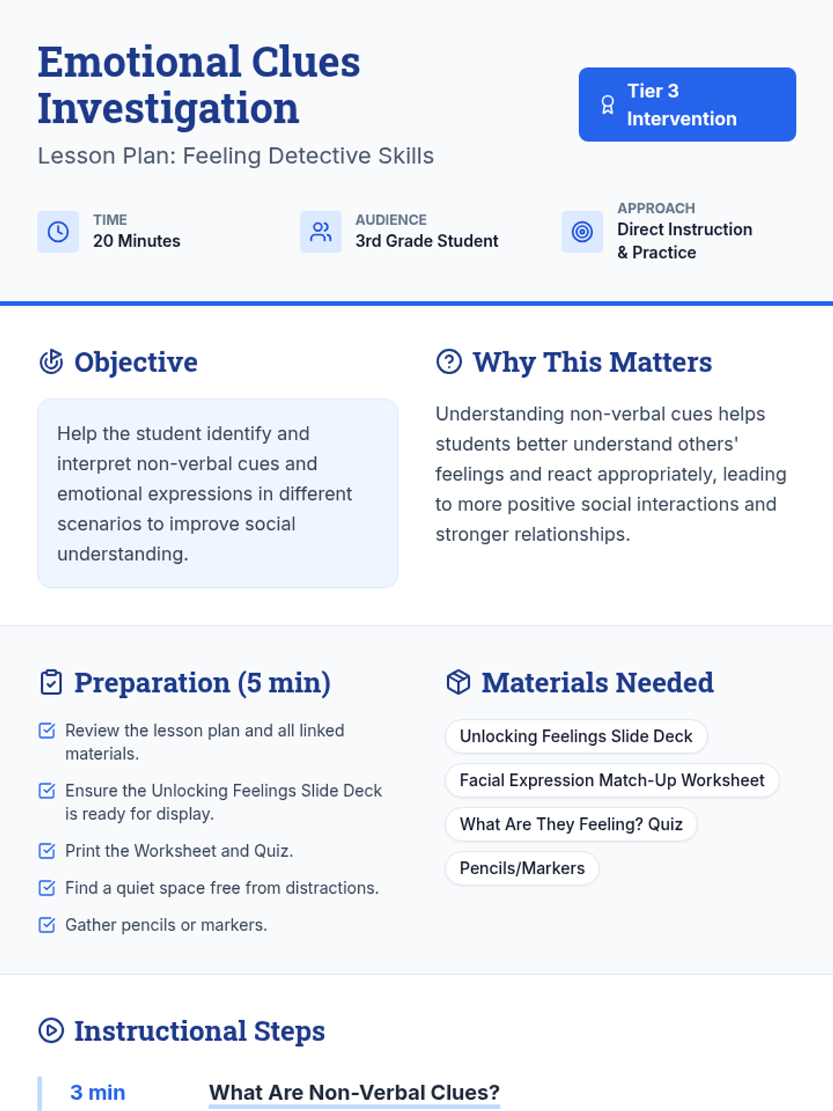 A 20-minute Tier 3 individualized lesson for 3rd graders focused on identifying and interpreting non-verbal cues and emotional expressions through facial features.