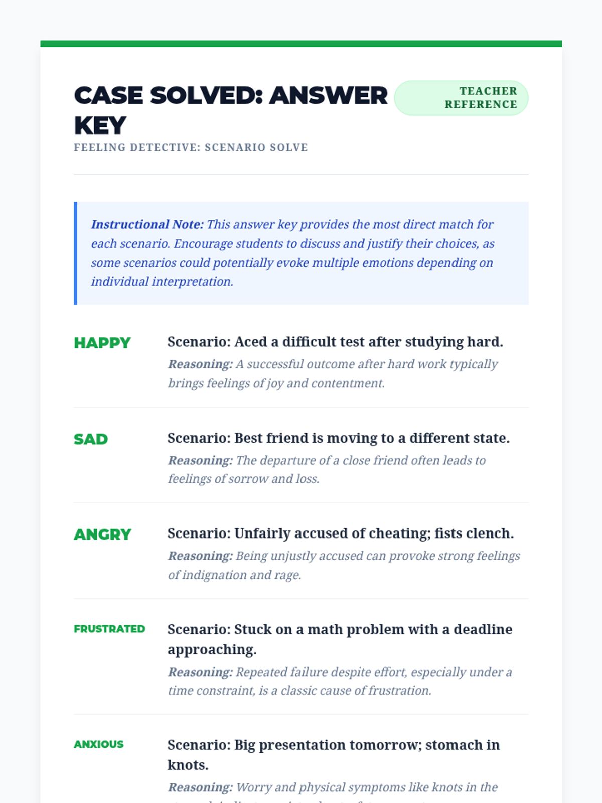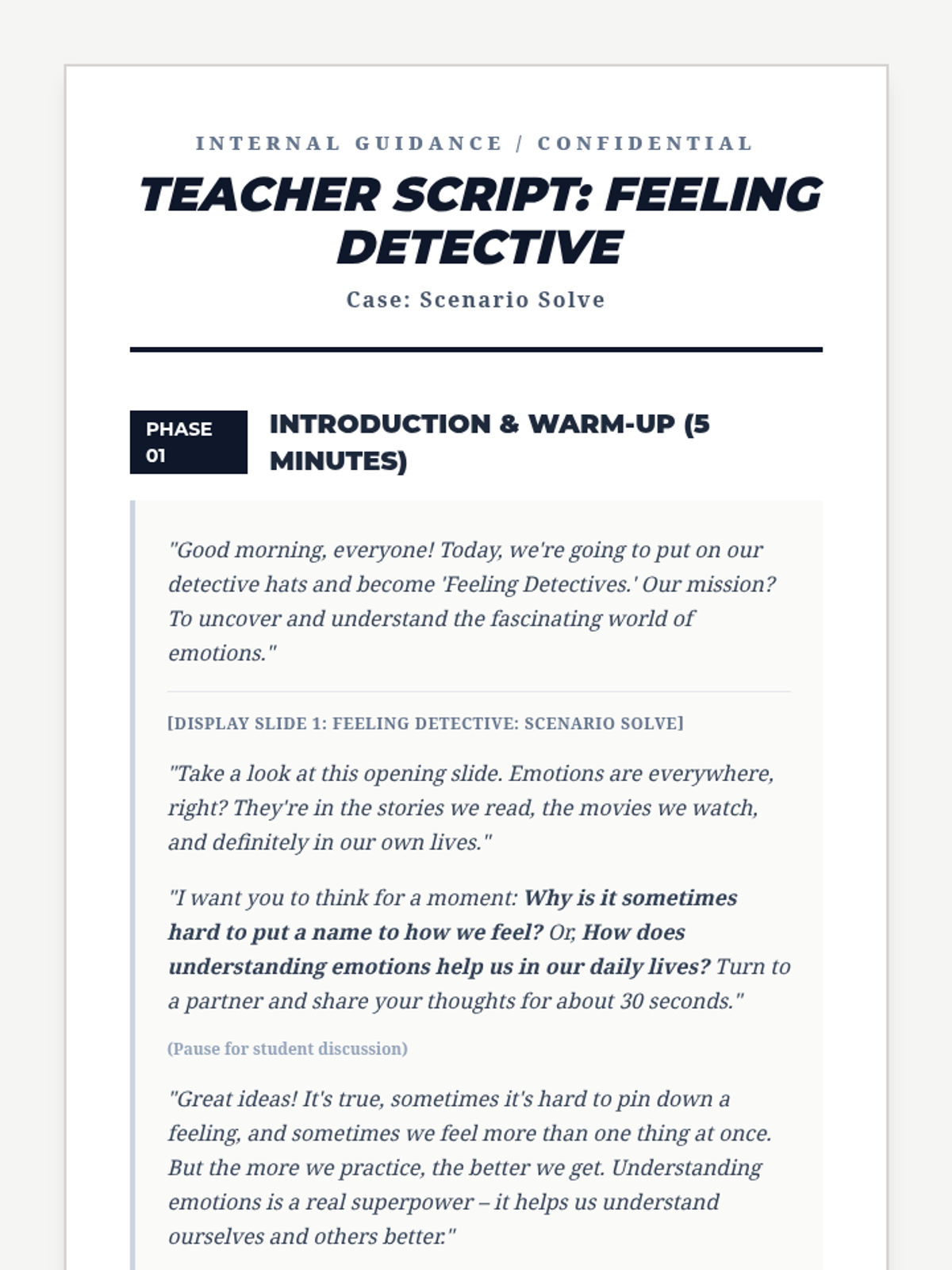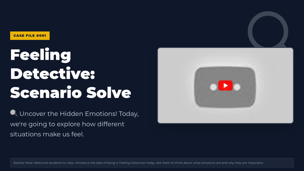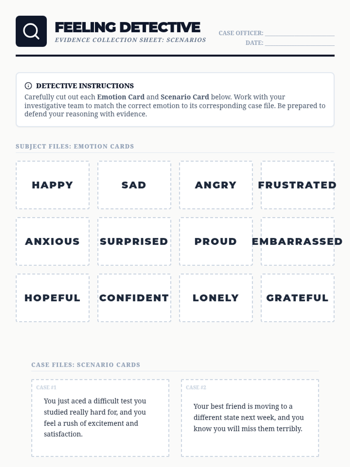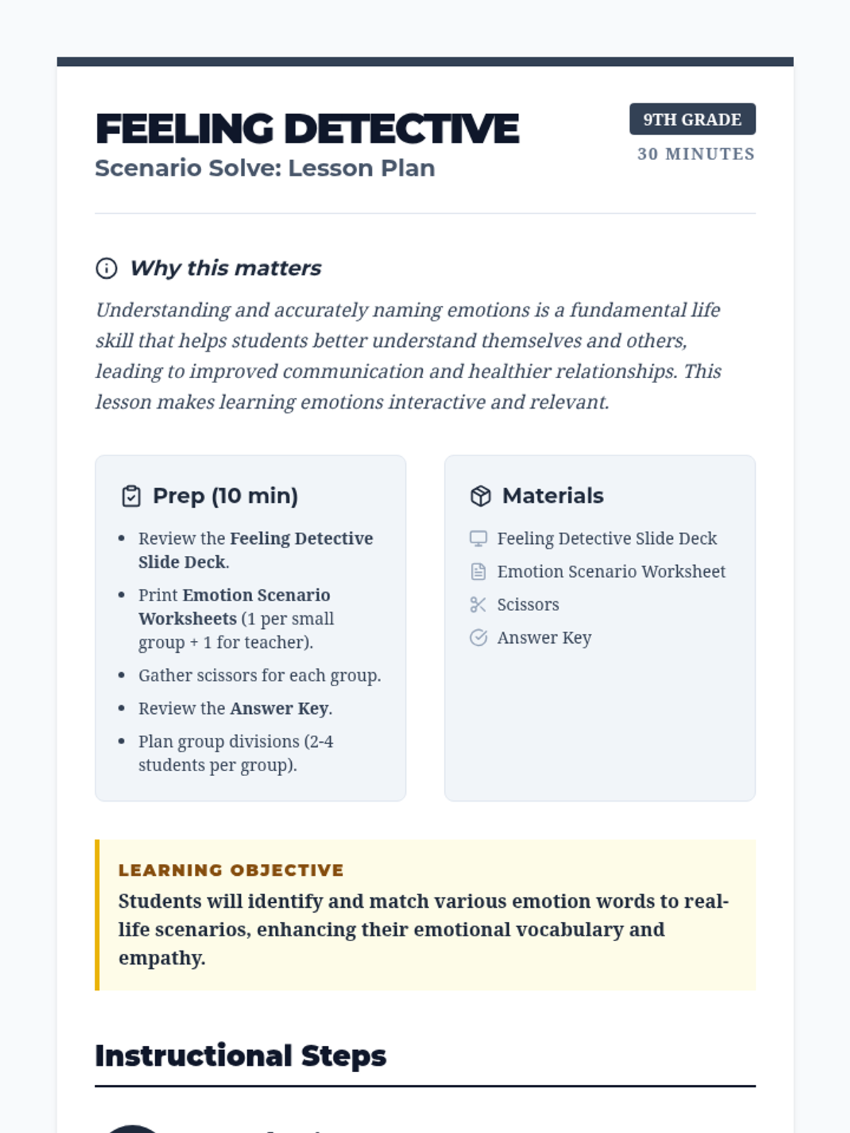 A 30-minute interactive lesson for 9th-graders to develop emotional literacy by matching complex emotion words to realistic life scenarios in a 'detective' format.