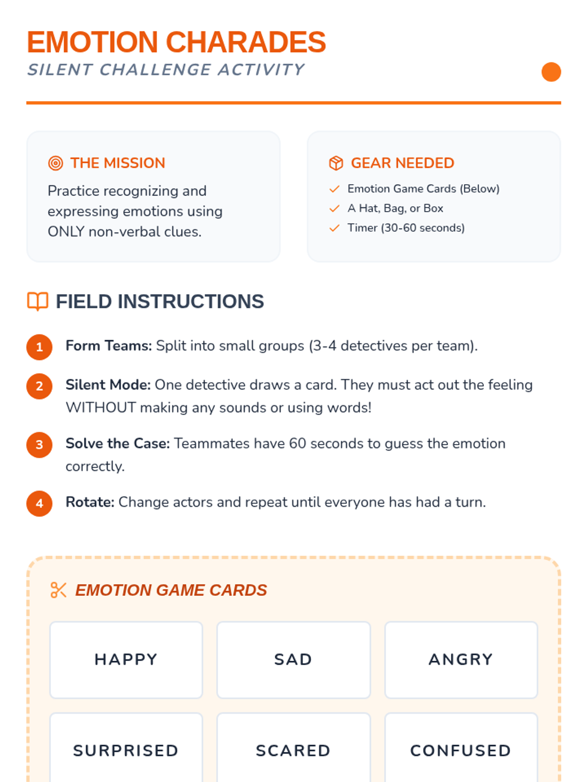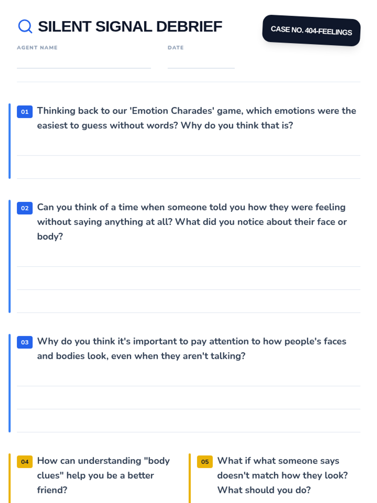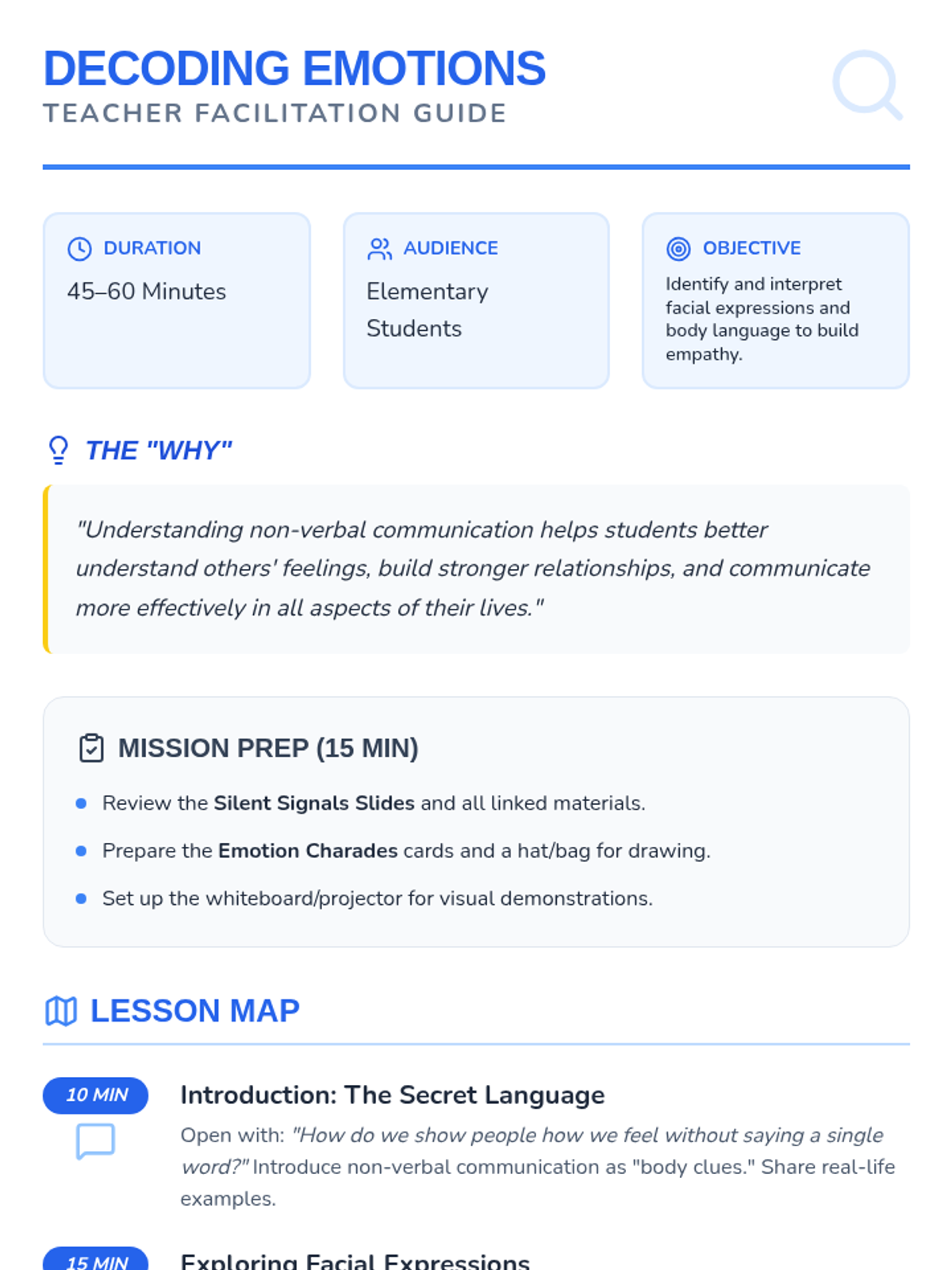 Students become 'Emotion Detectives' as they learn to decode non-verbal cues like facial expressions and body language to improve communication and empathy.