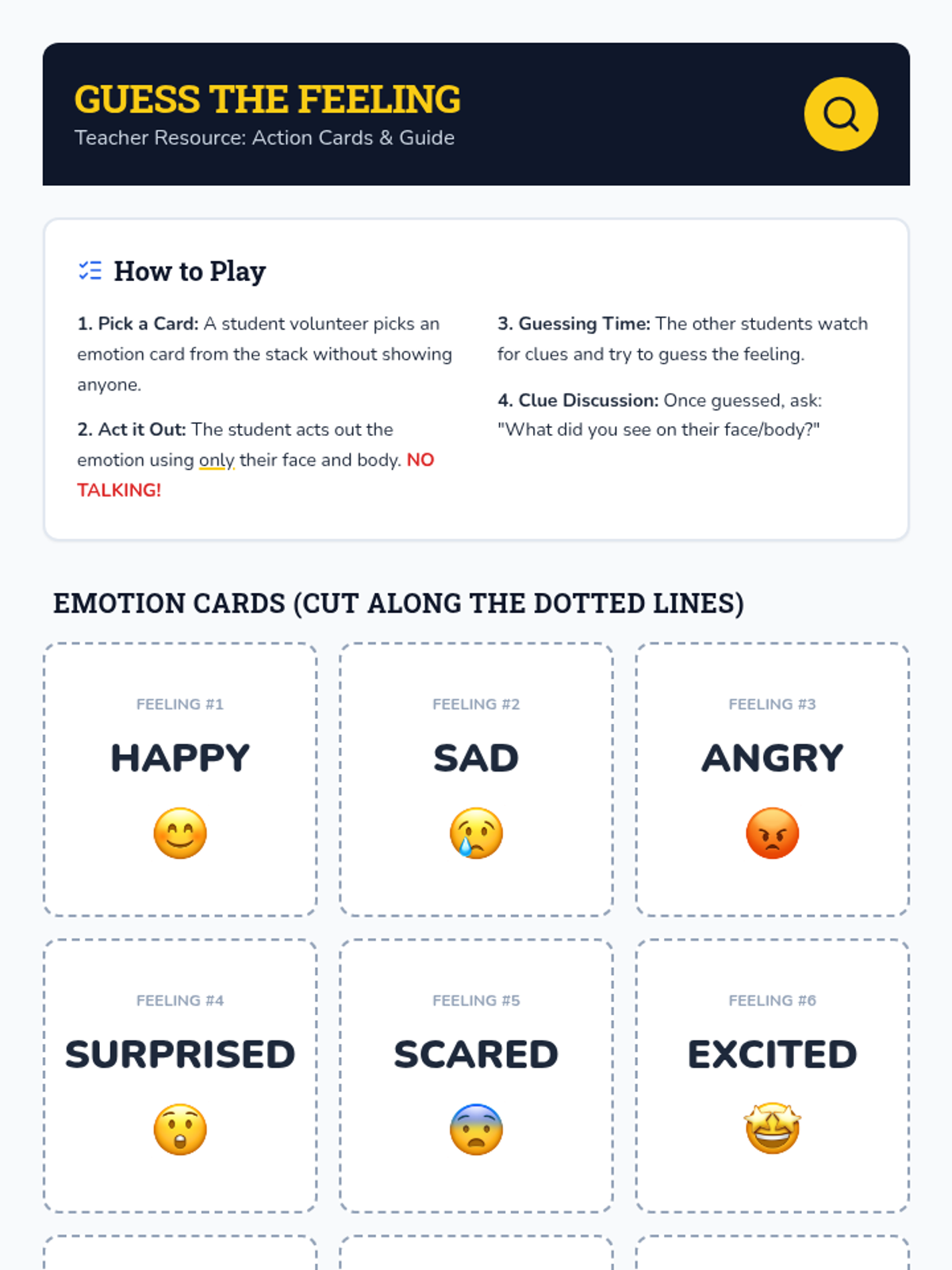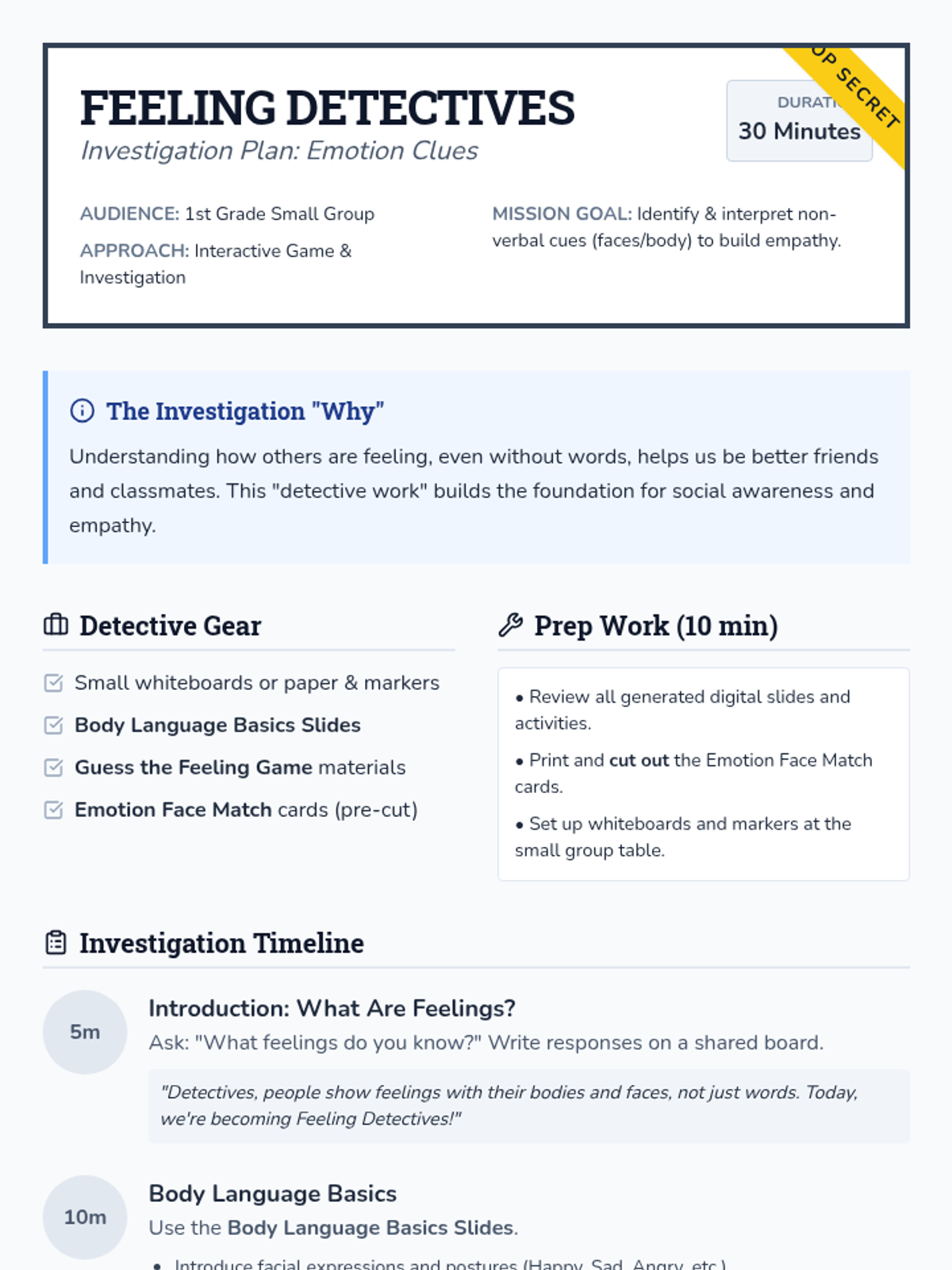 A 30-minute small group lesson for 1st graders focused on identifying and interpreting non-verbal cues to understand others' emotions and build empathy.
