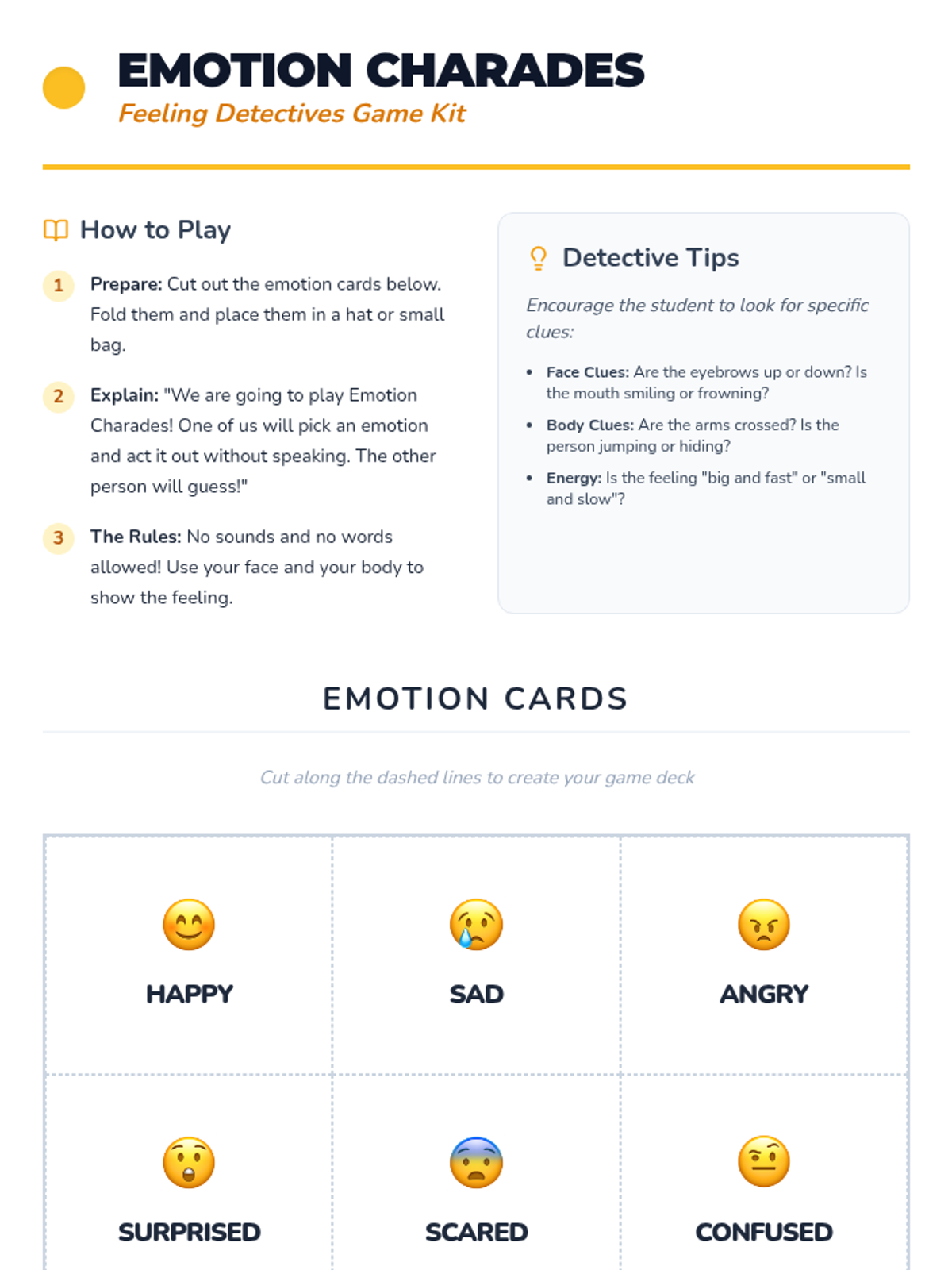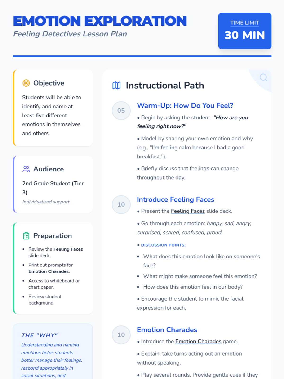 A 30-minute Tier 3 lesson for 2nd-grade students focused on identifying and naming emotions in themselves and others. Through interactive slides, a charades game, and journal prompts, students develop foundational emotional literacy and social-emotional skills.