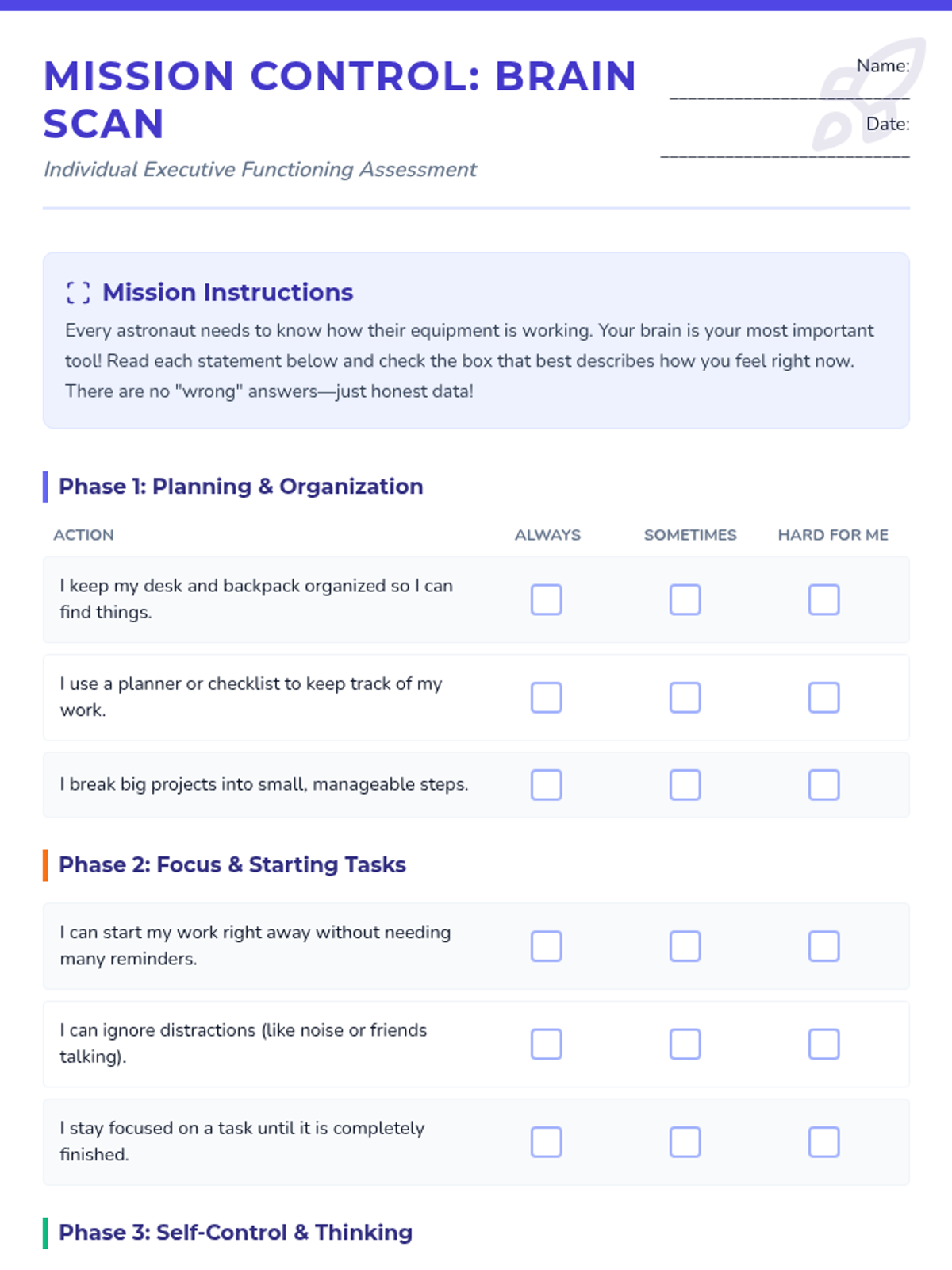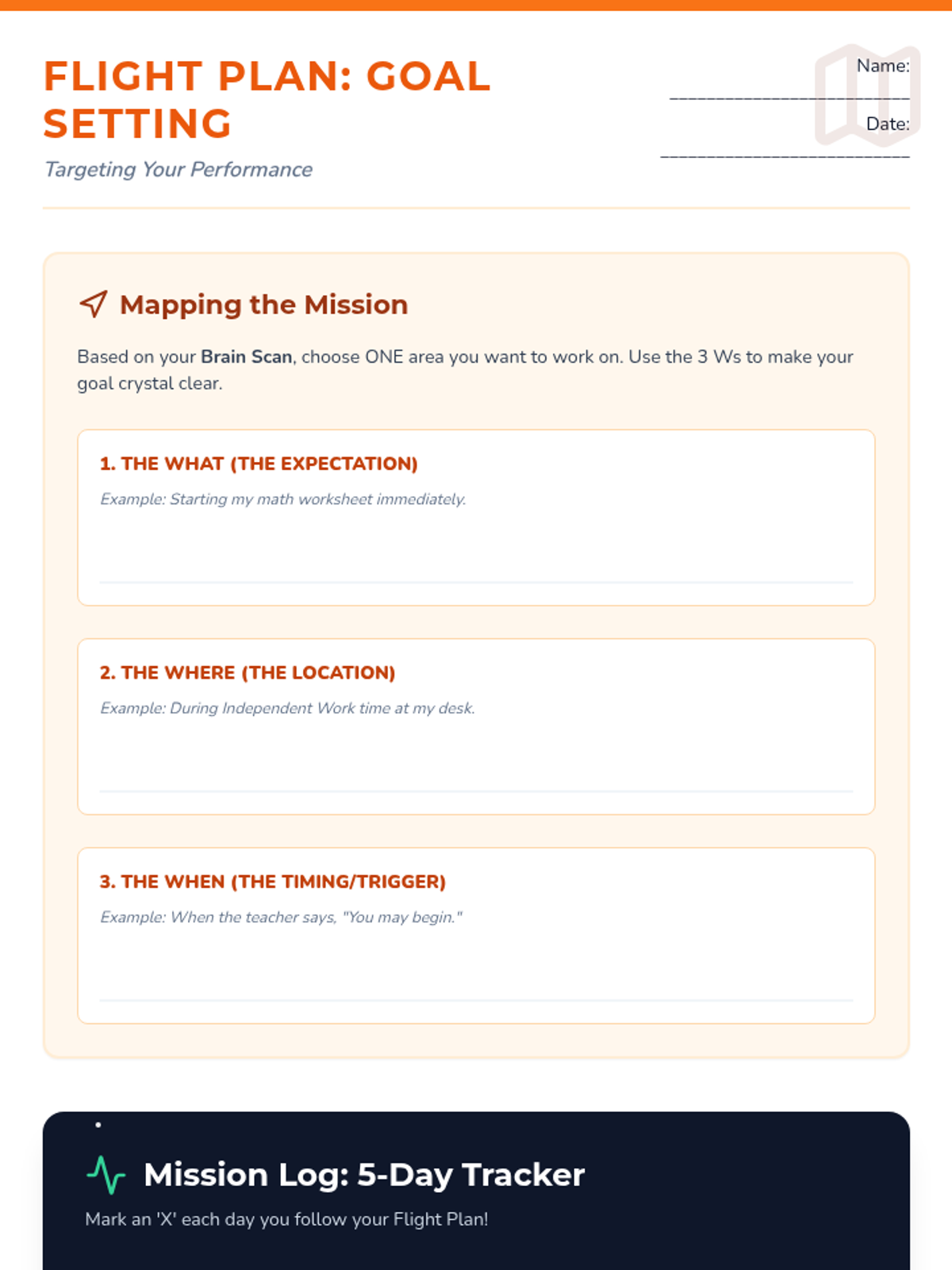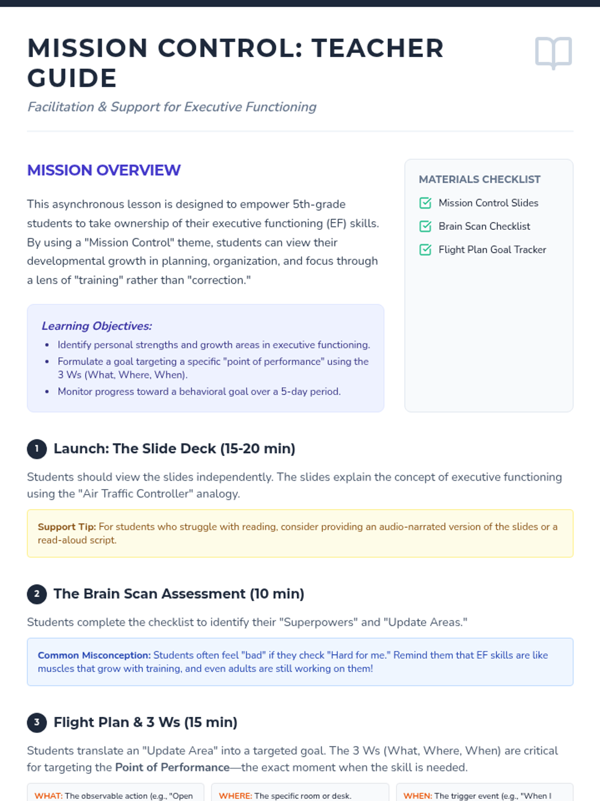 In this asynchronous lesson, 5th-grade students explore the concept of executive functioning through a 'Mission Control' theme. They conduct a personal 'Brain Scan' to identify strengths and growth areas before designing a 'Flight Plan' goal that targets a specific expectation, location, and time.