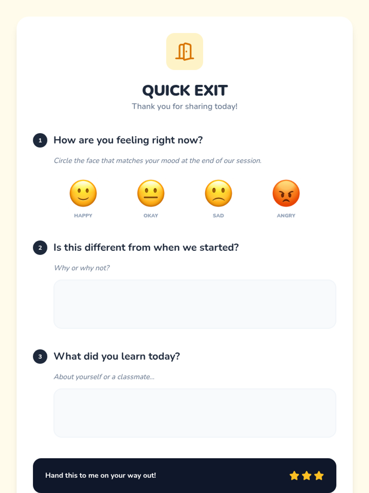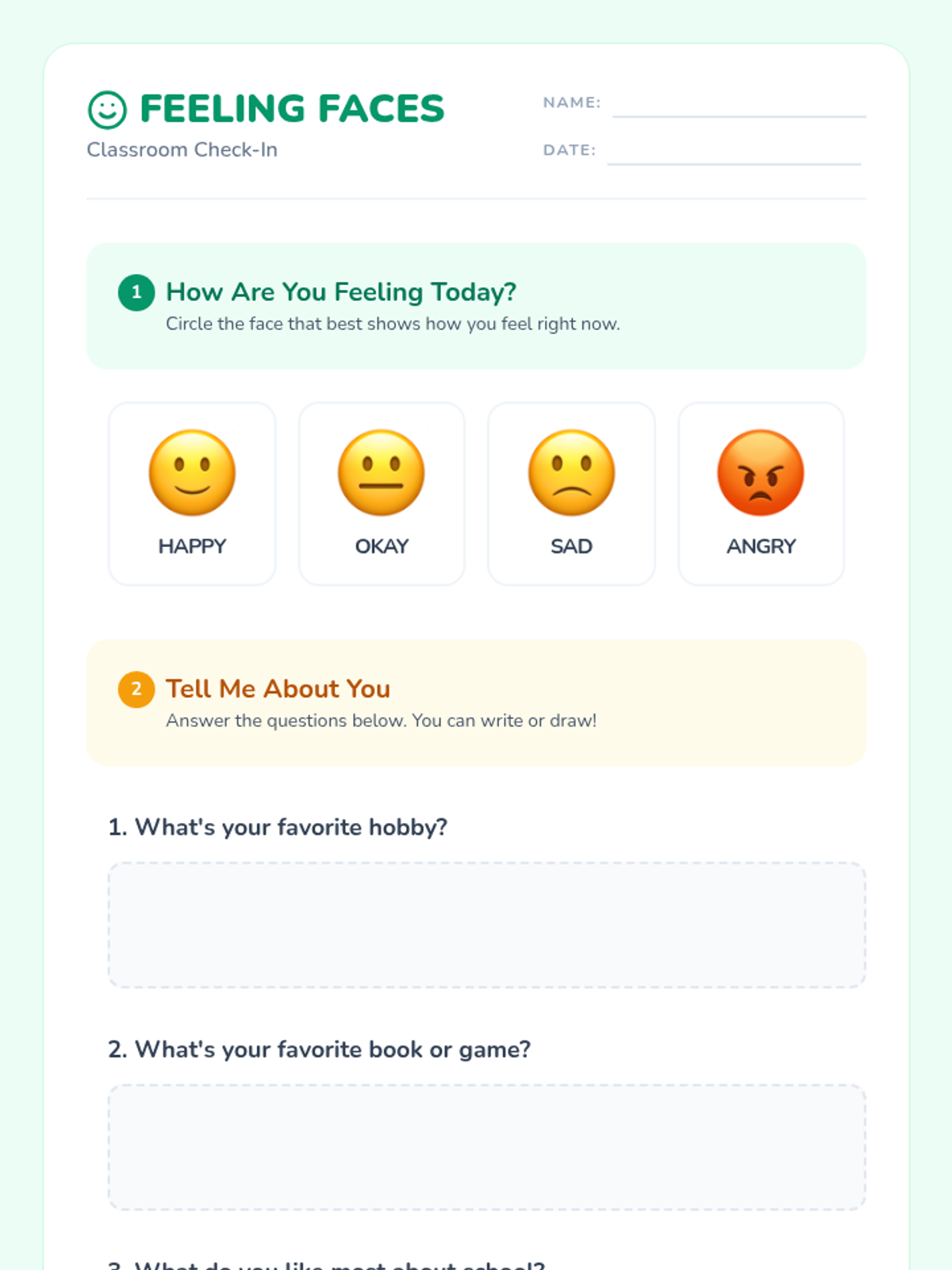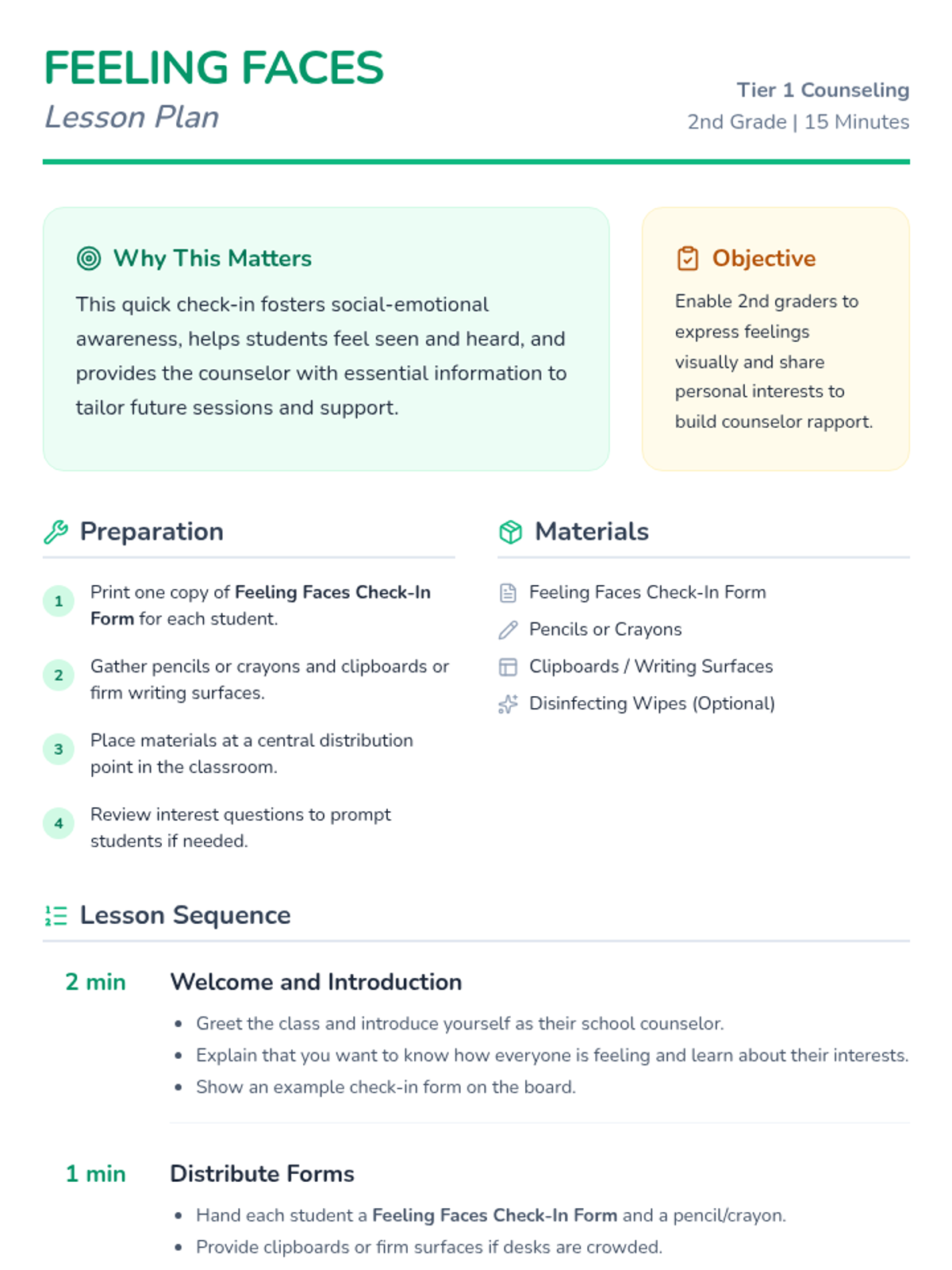A quick, 15-minute Tier 1 school counselor introductory session for 2nd graders to share feelings and interests using visual check-ins.
