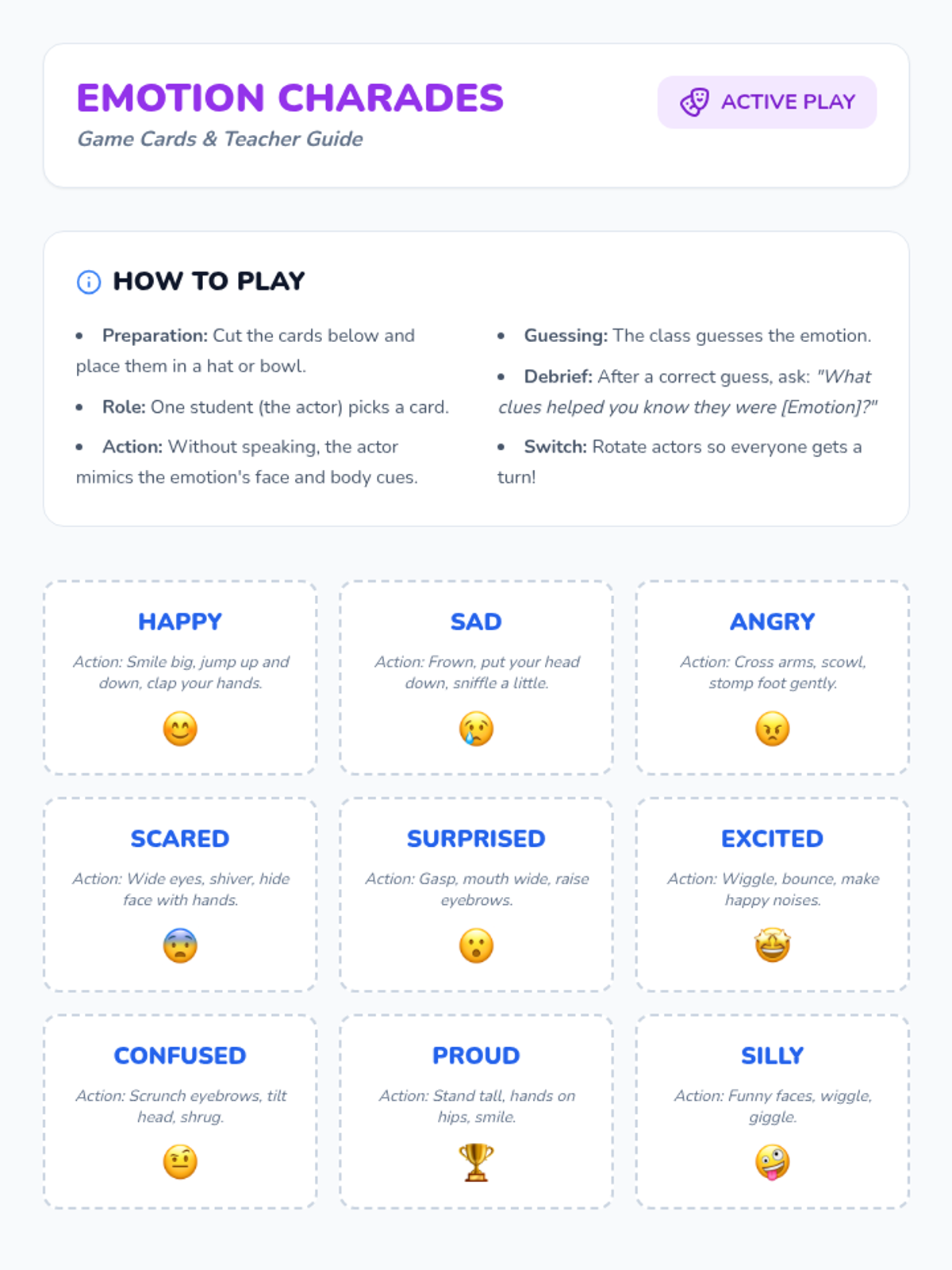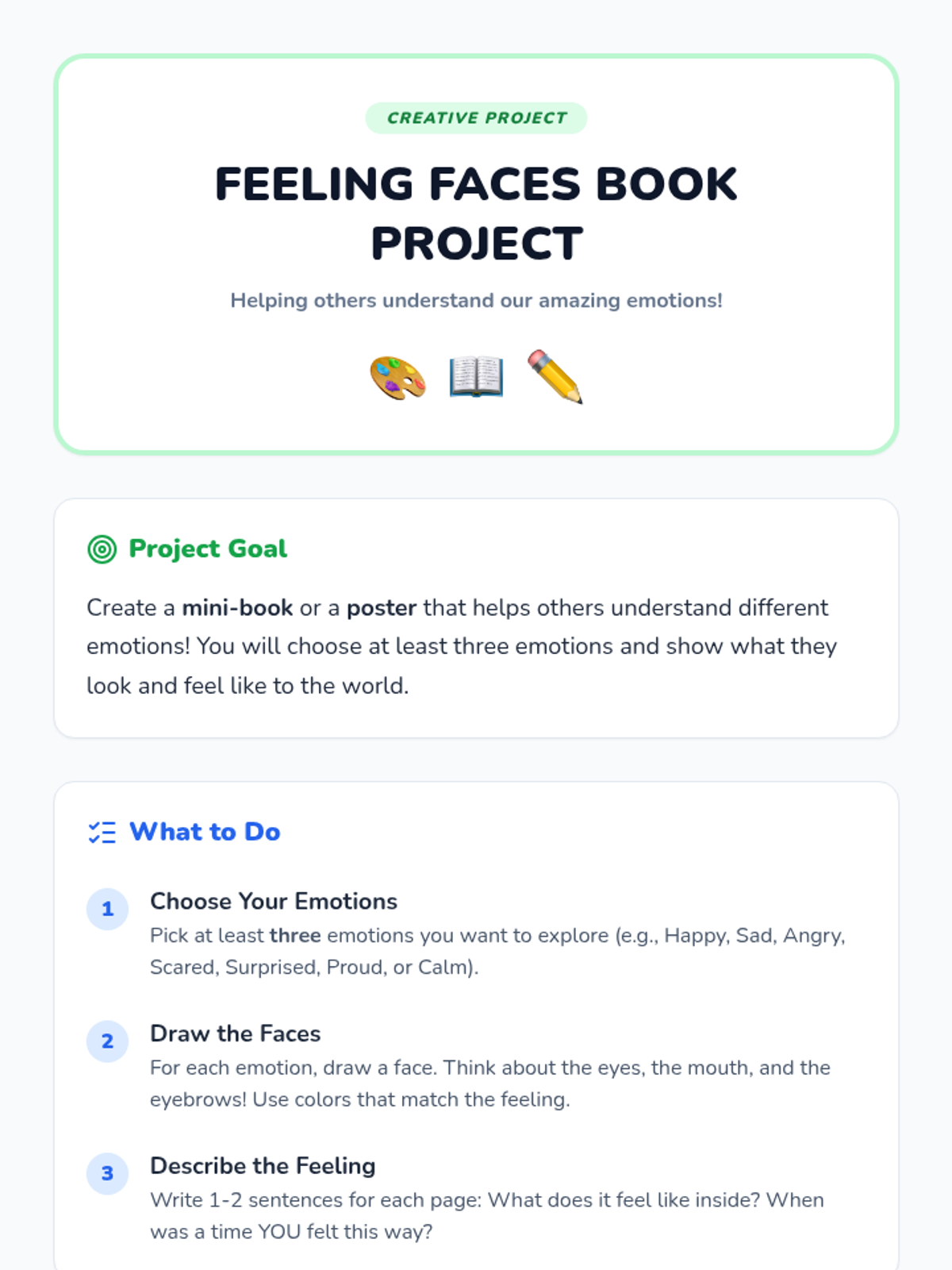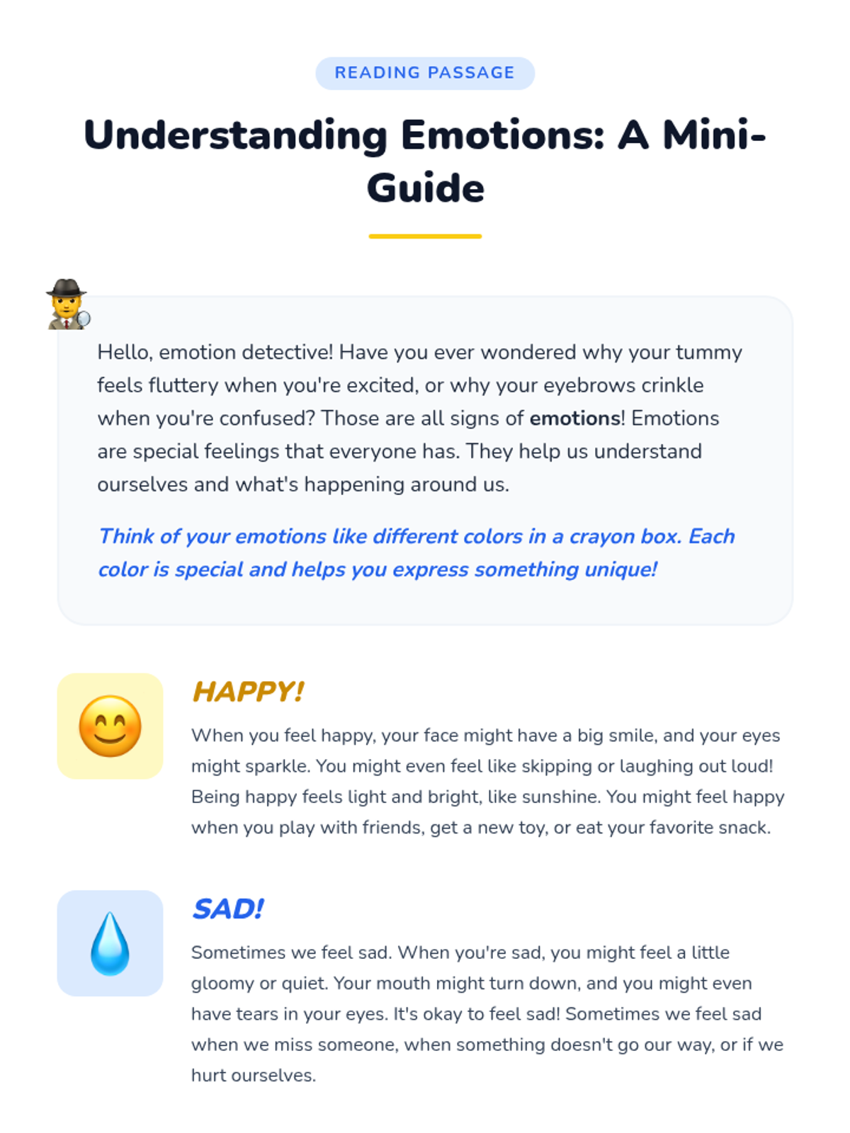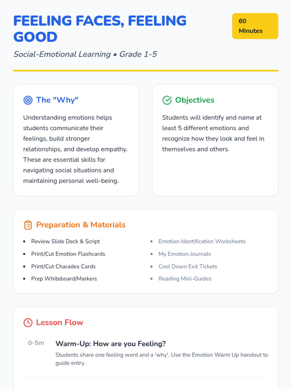 A comprehensive 60-minute lesson designed for elementary students to identify and understand primary emotions, fostering empathy and self-awareness through interactive games, discussions, and creative projects.