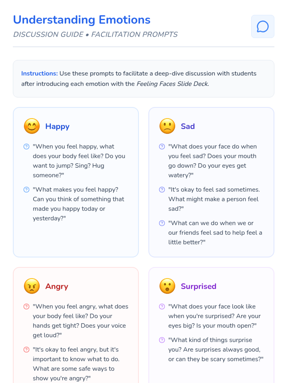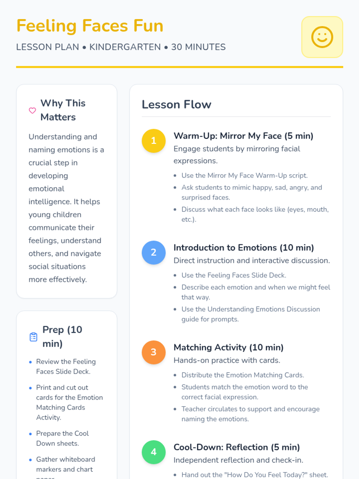 A delightful 30-minute lesson for Kindergarten students to explore and name basic emotions. This lesson helps young learners develop emotional literacy through interactive discussion and hands-on activities.