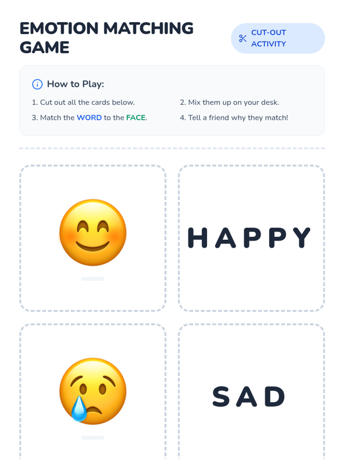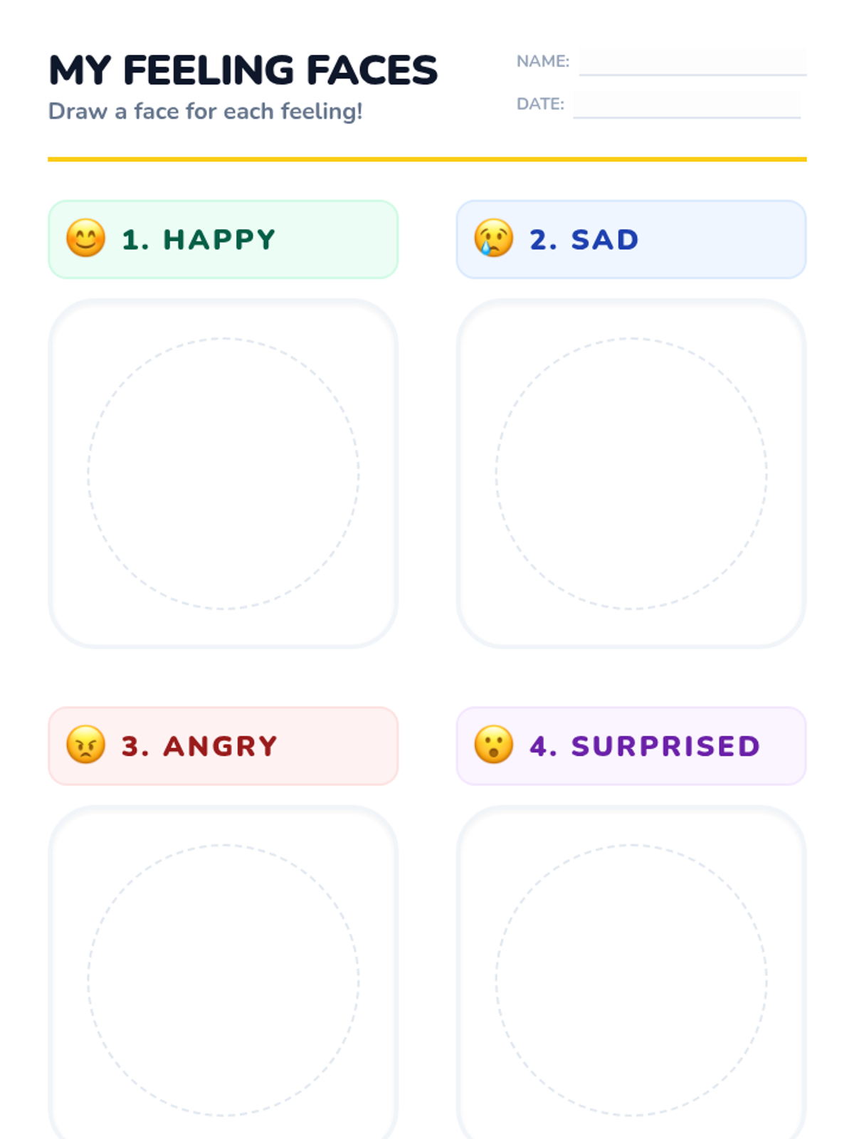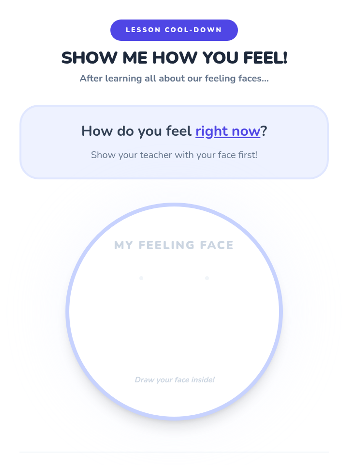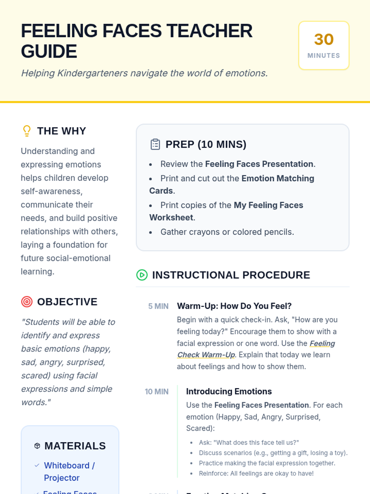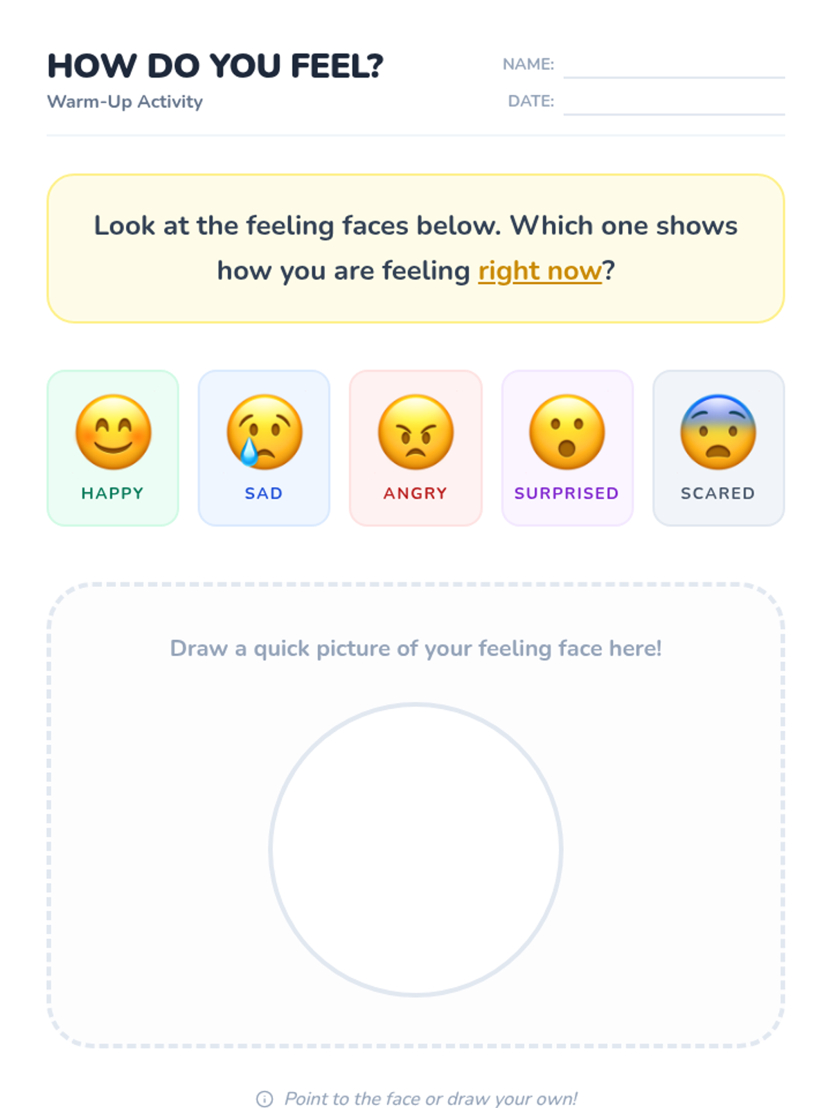 A fun, interactive lesson for Kindergarten students to identify and express five basic emotions using facial expressions and simple words.