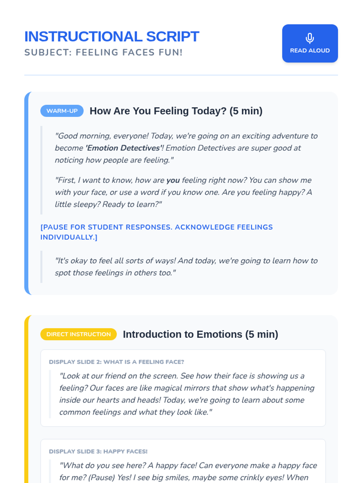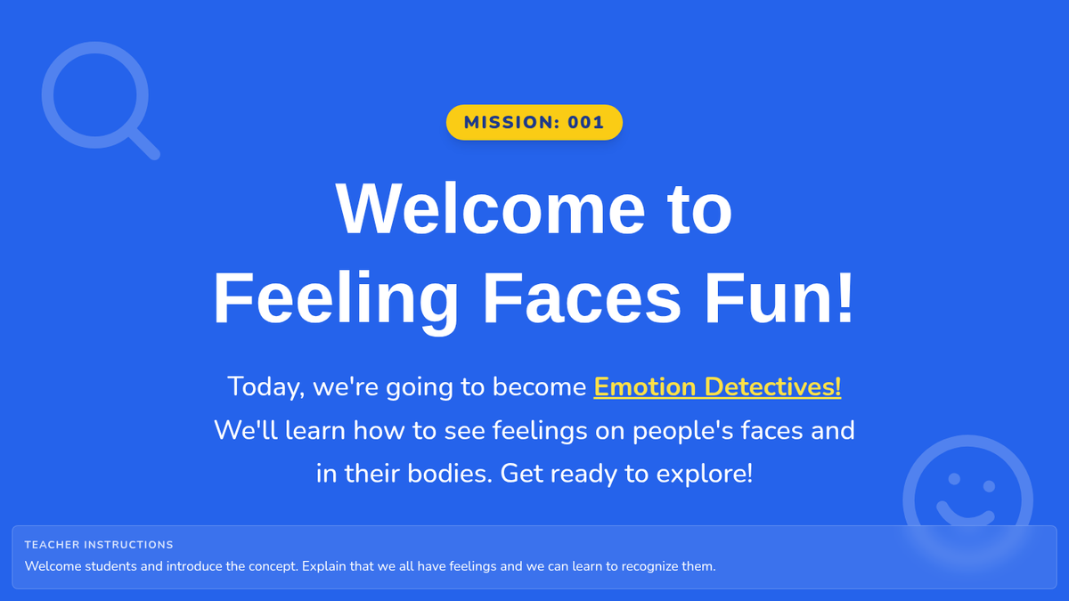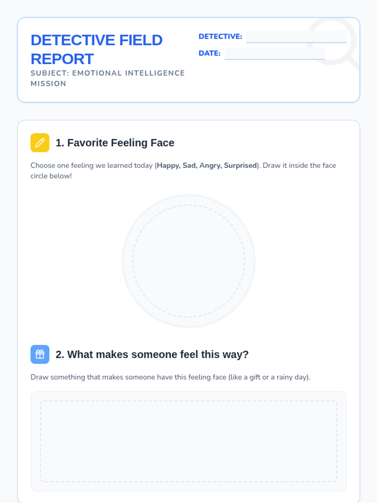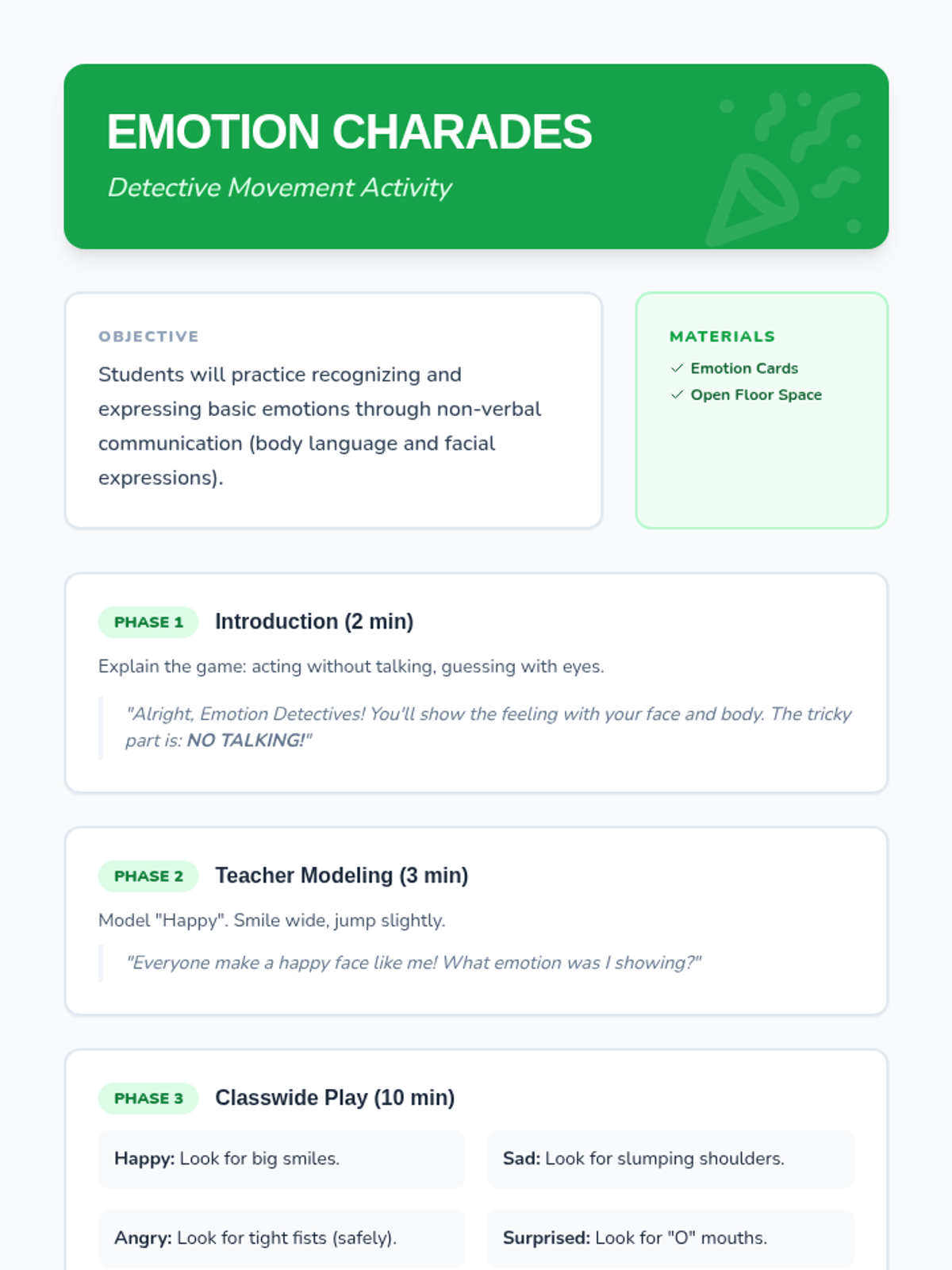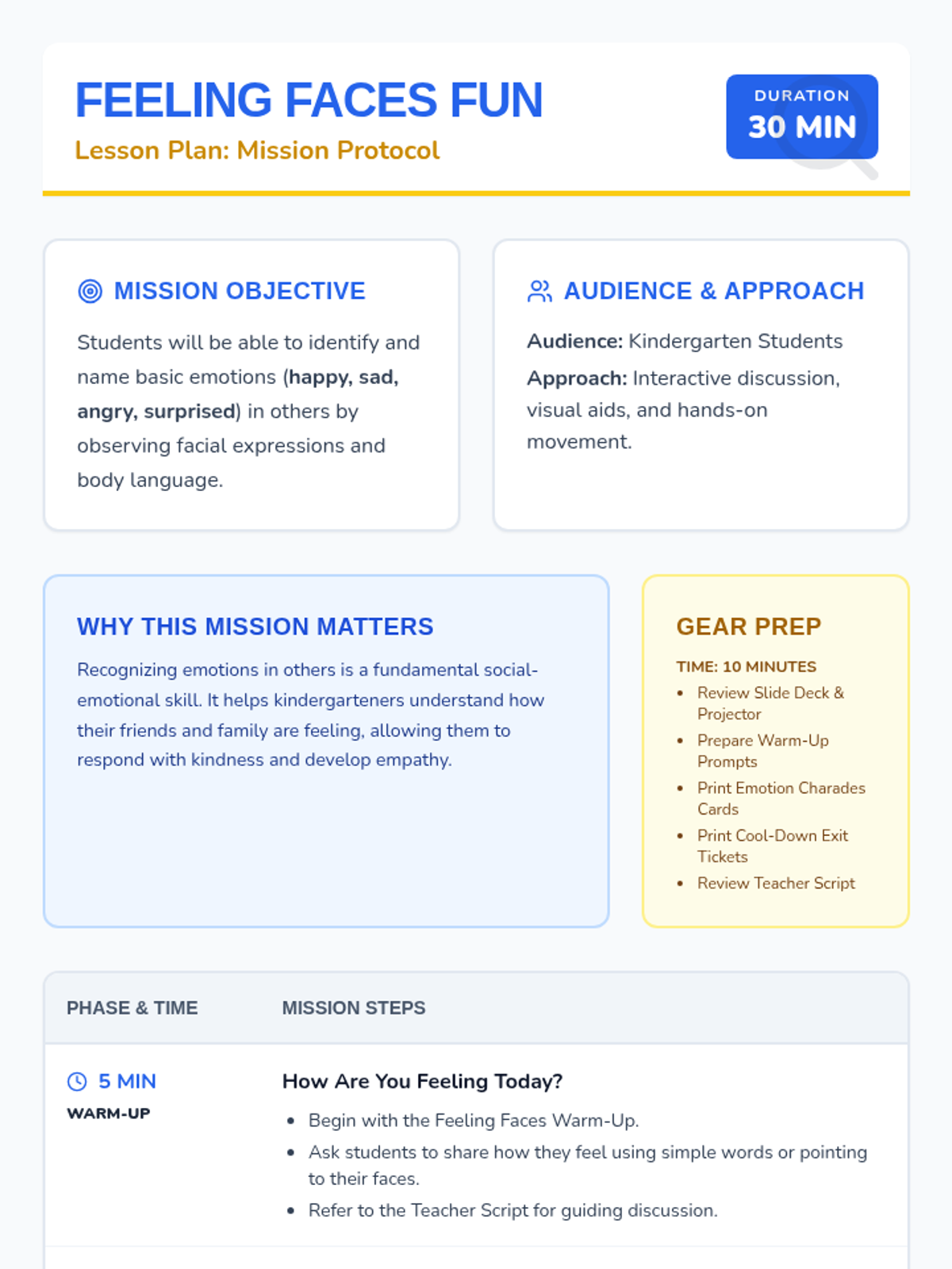 A 30-minute kindergarten lesson teaching students how to recognize emotions (happy, sad, angry, surprised) through facial expressions and body language using a fun 'Emotion Detective' theme.