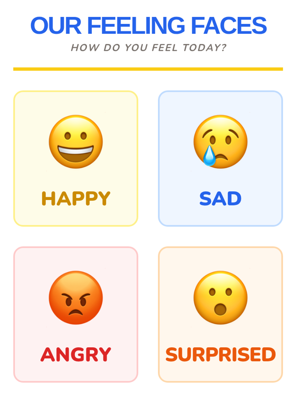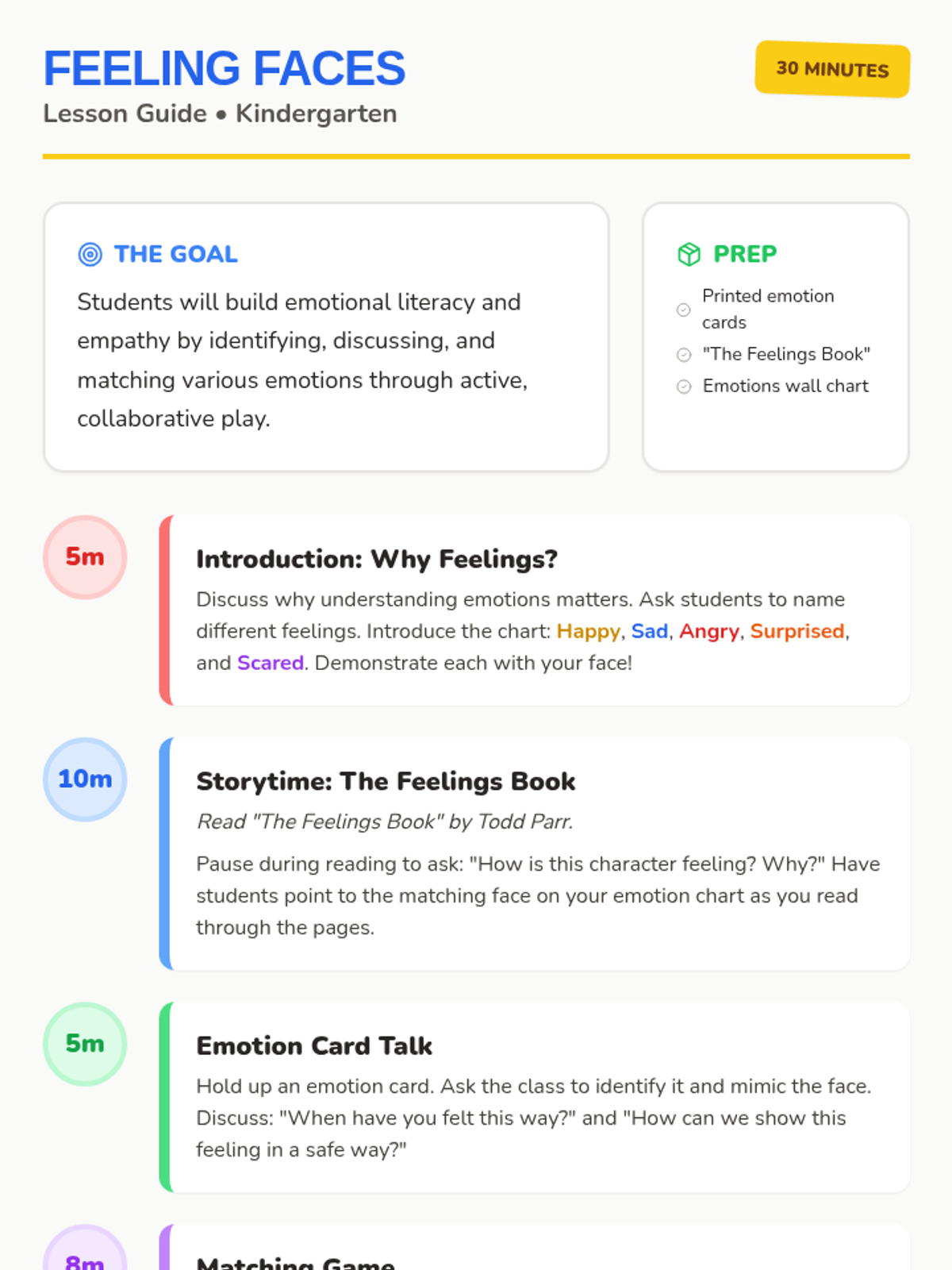 A kindergarten lesson focused on emotional literacy where students identify, discuss, and match various emotions using active and collaborative strategies.