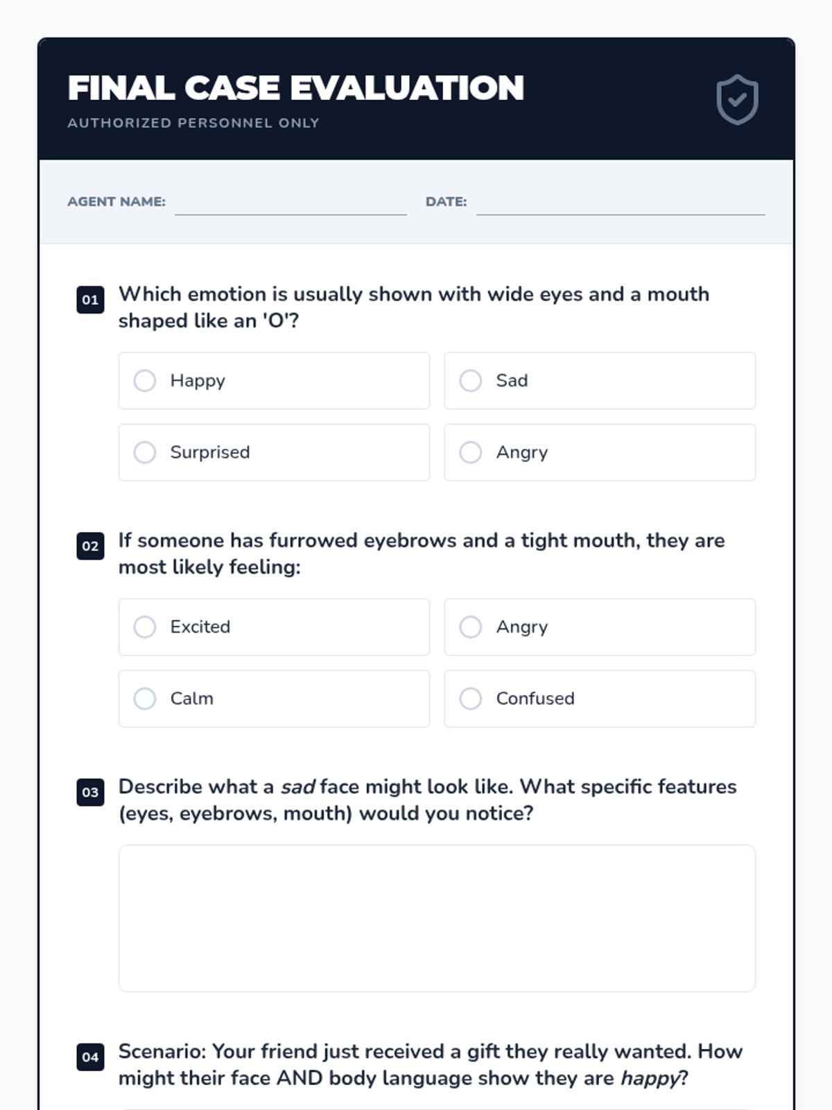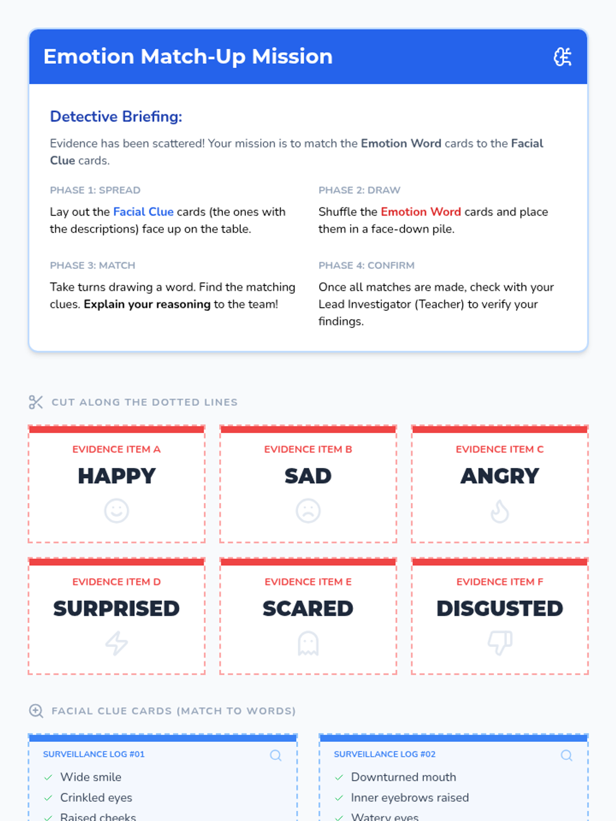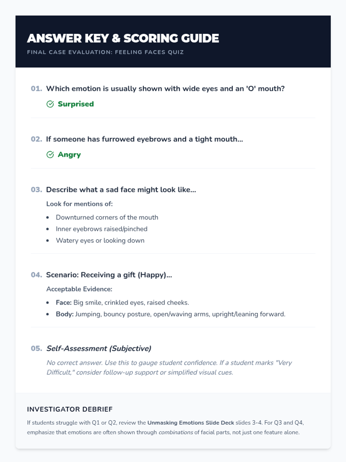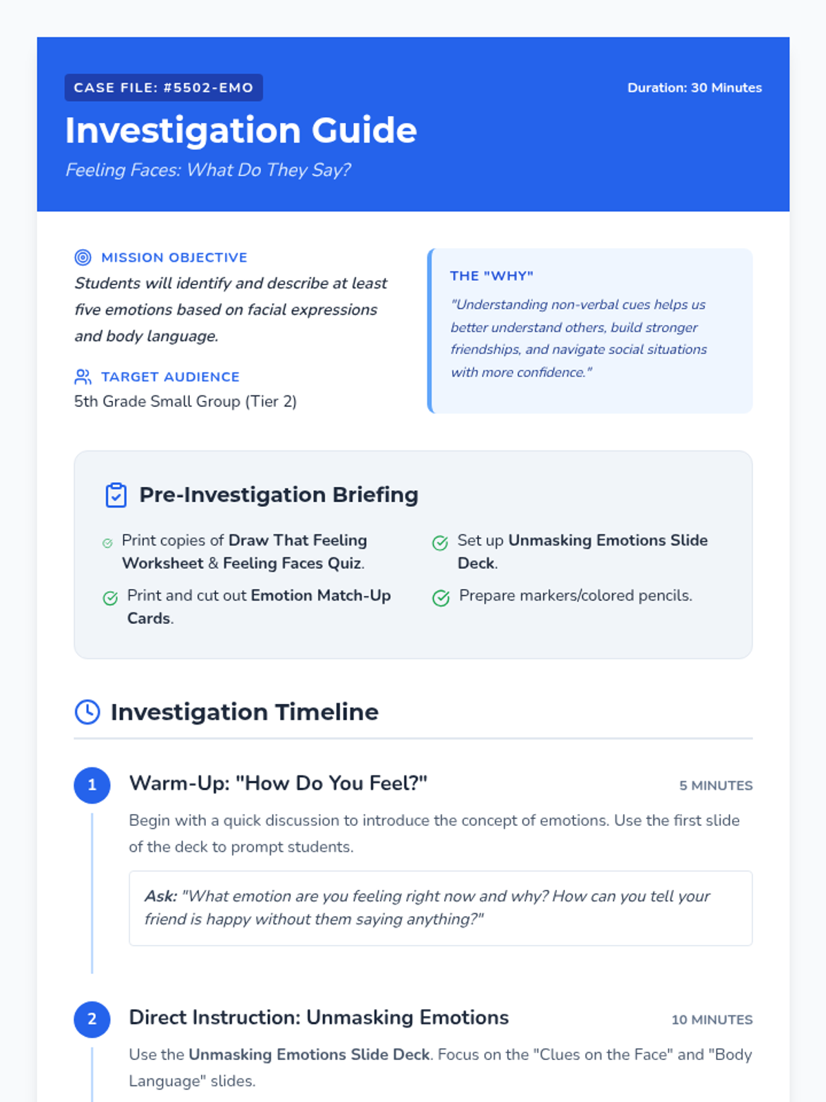A 30-minute Tier 2 small group lesson for 5th graders to identify emotions through facial expressions and body language using a detective-themed investigation approach.