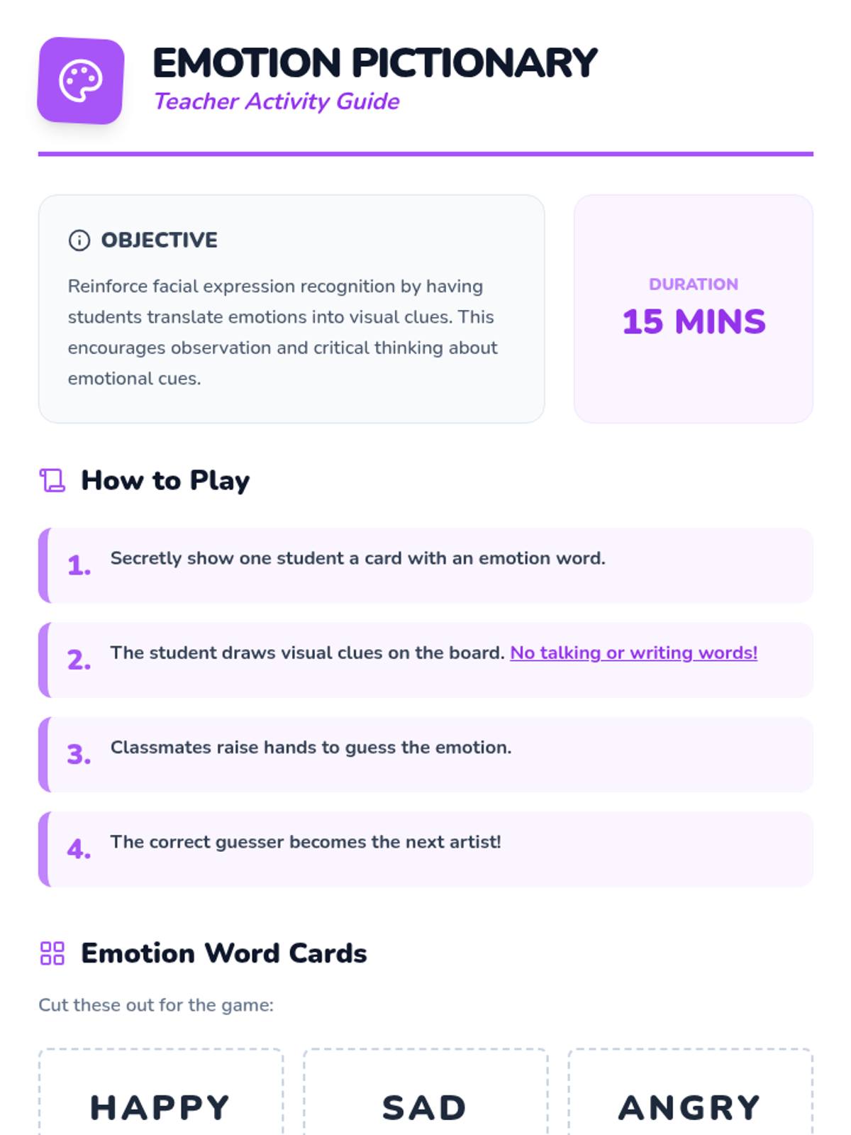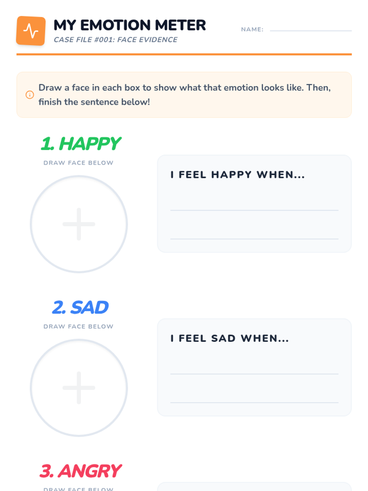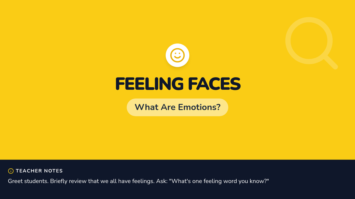 Students learn to identify core emotions (happy, sad, angry) through facial expressions and practice recognizing them in themselves and others.