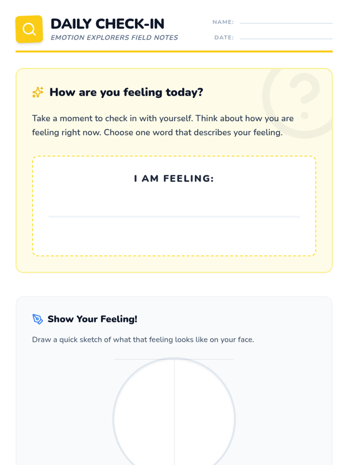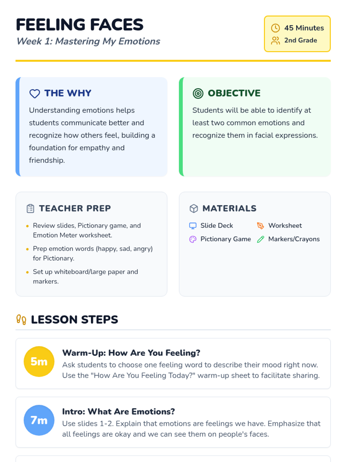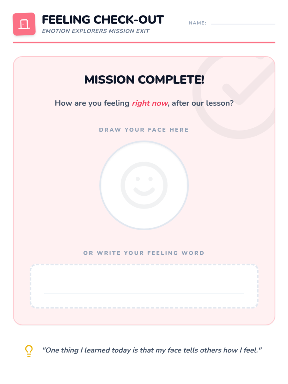 Students learn to identify core emotions (happy, sad, angry) through facial expressions and practice recognizing them in themselves and others.