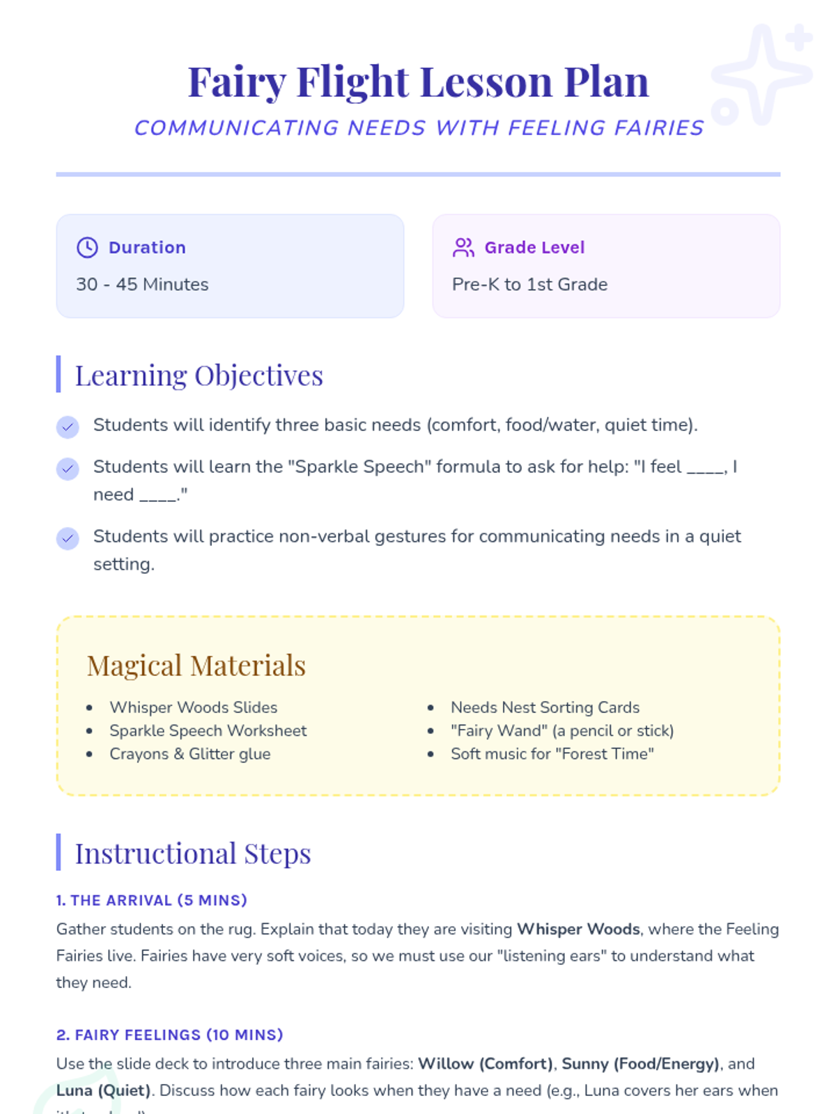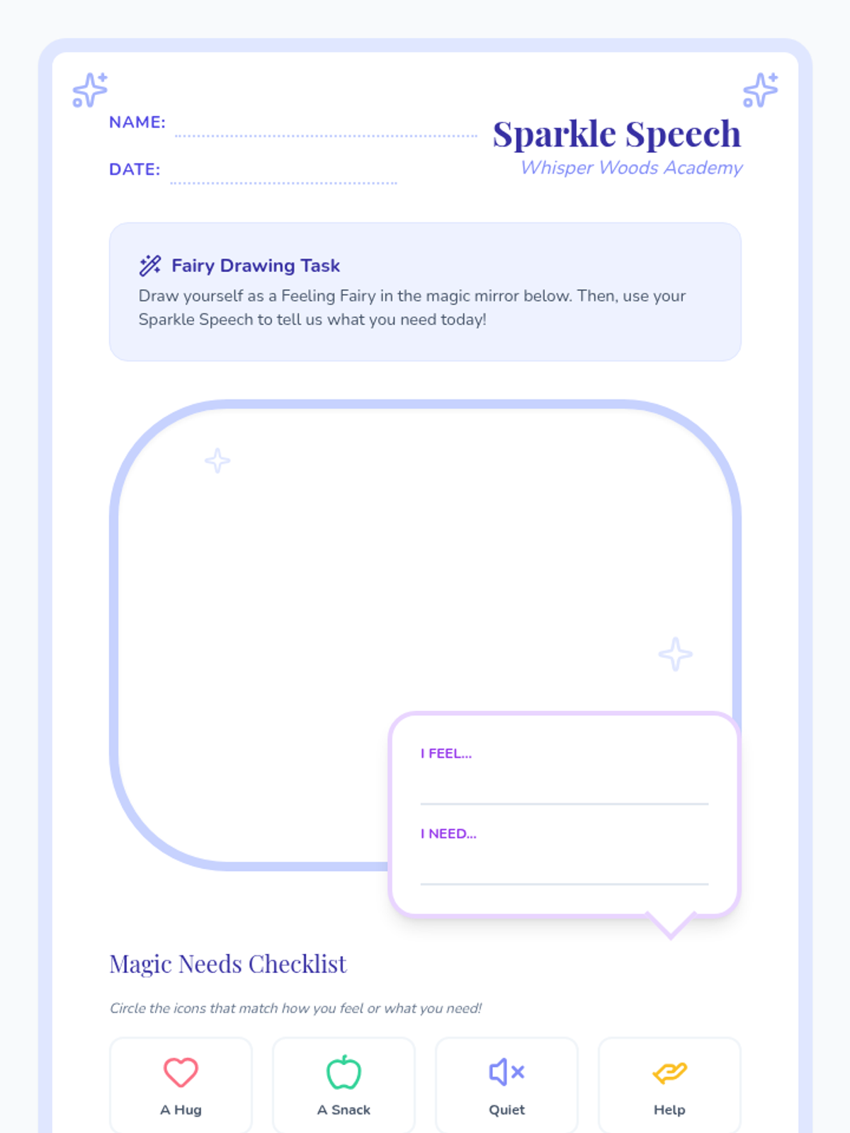 A gentle social-emotional lesson for early childhood students to identify and communicate their needs through the whimsical world of Feeling Fairies. Students learn to use their 'Sparkle Speech' to ask for things like comfort, quiet, or help.