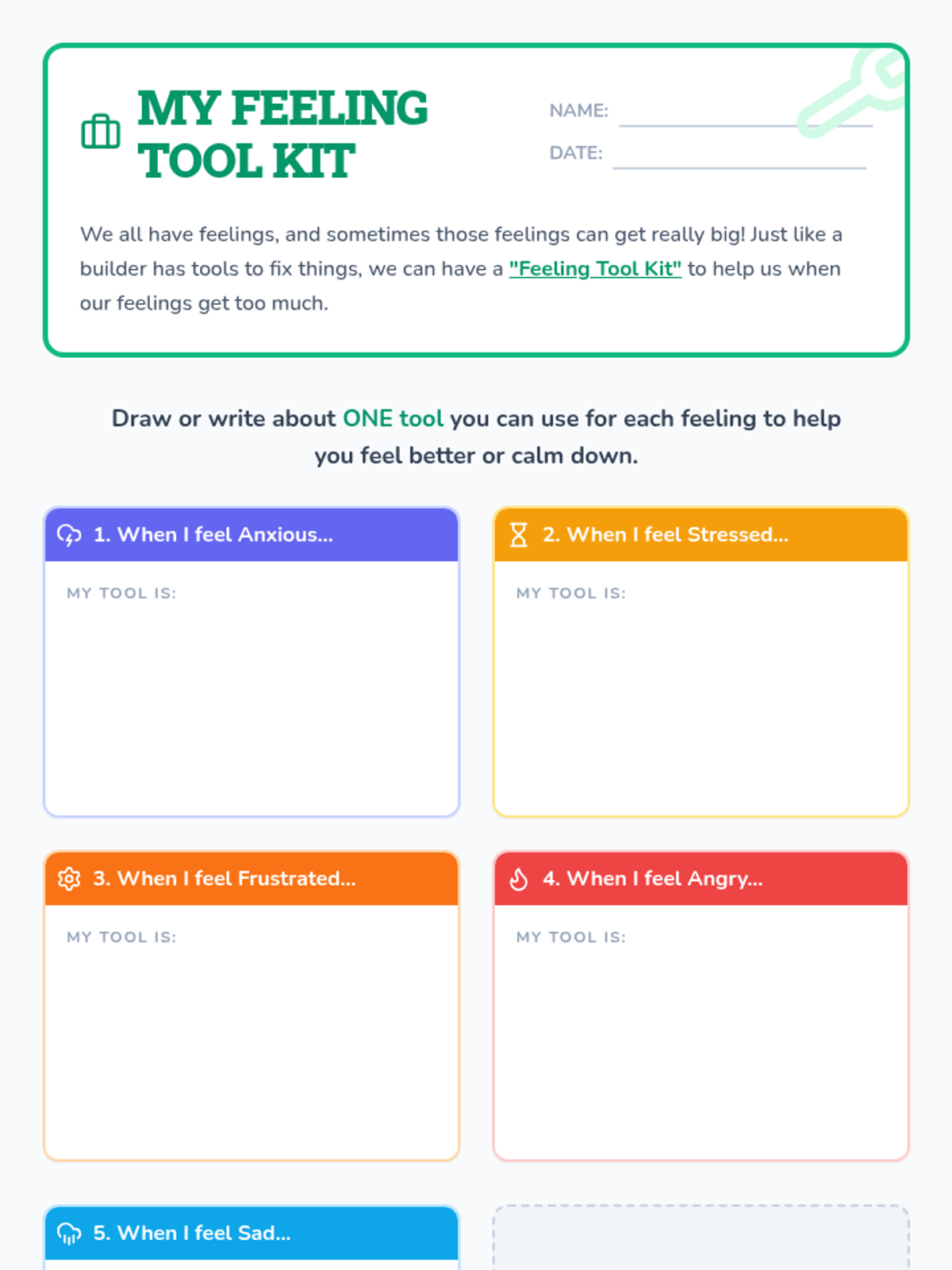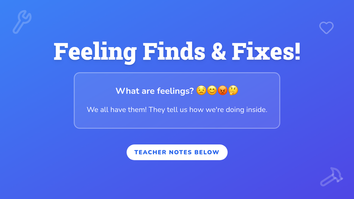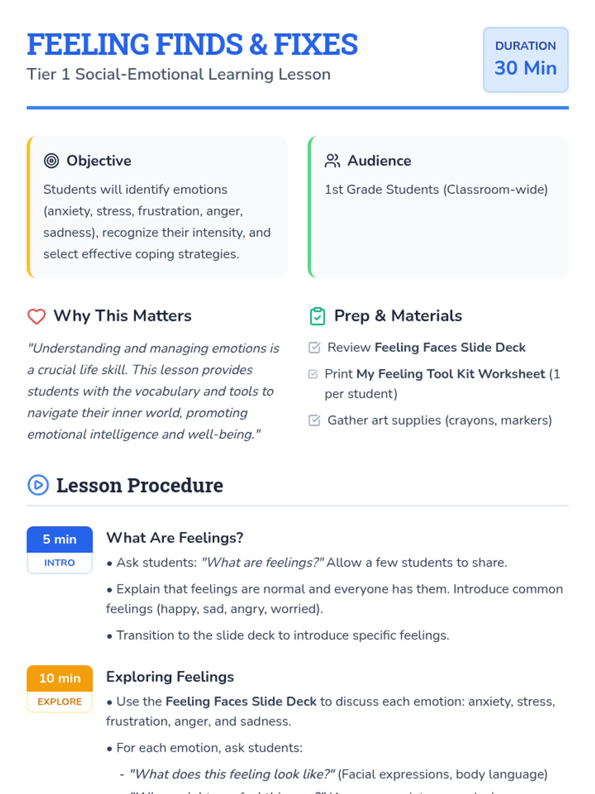 A 30-minute Tier 1 classroom lesson for 1st graders focused on identifying emotions (anxiety, stress, frustration, anger, sadness) and developing a 'Tool Kit' of coping strategies.