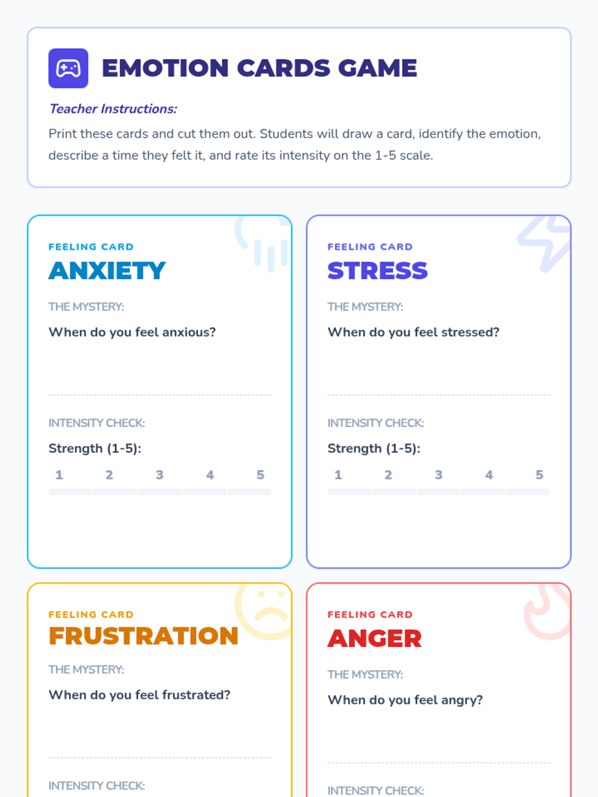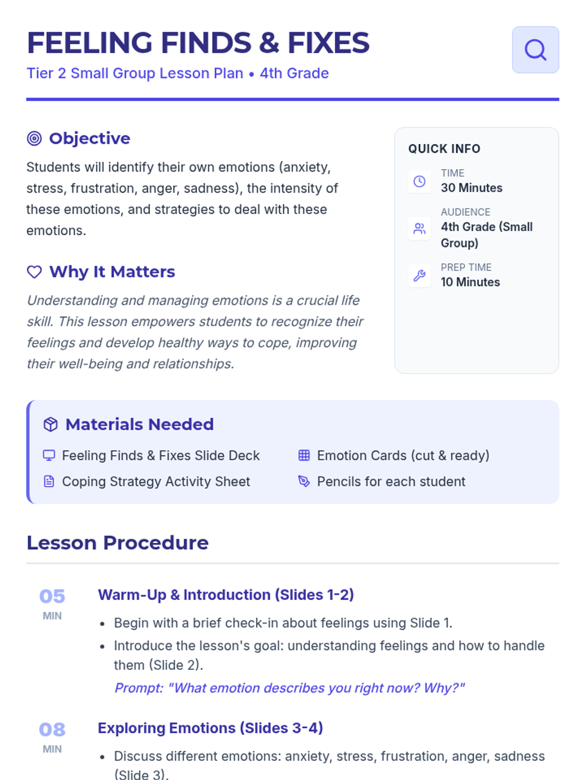 A 30-minute Tier 2 small group lesson for 4th graders to identify emotions, measure their intensity, and select appropriate coping strategies.