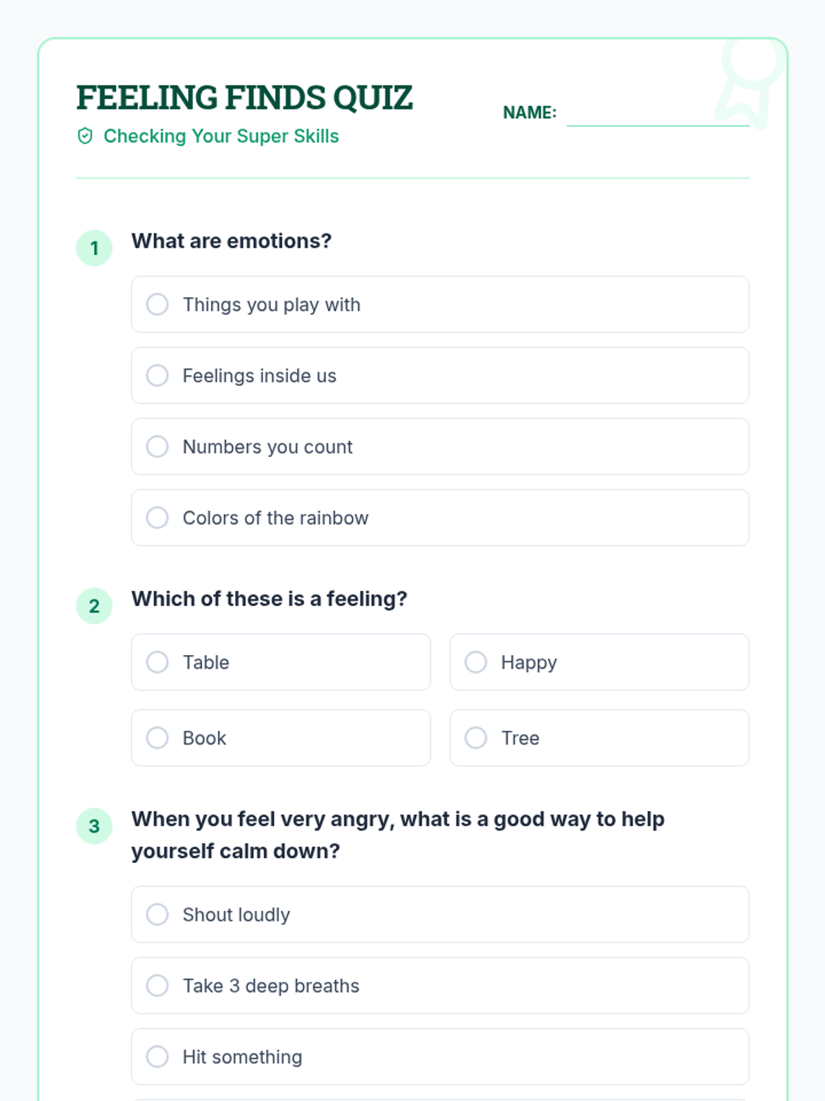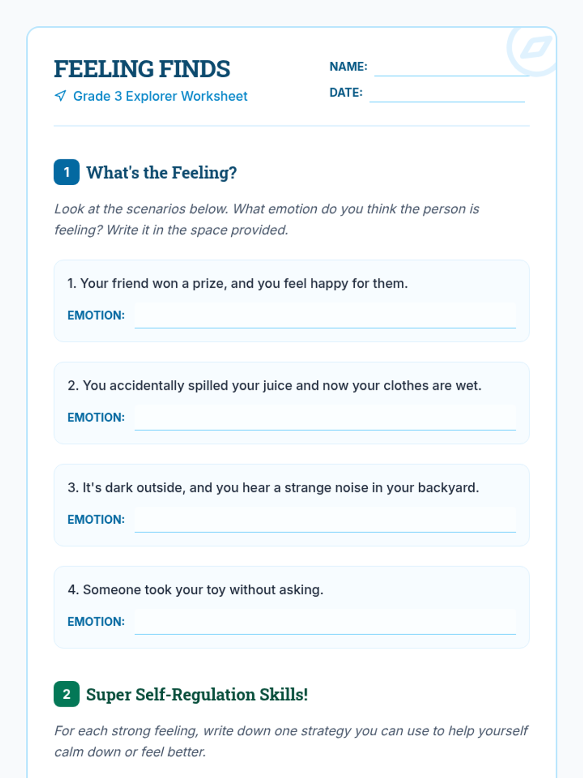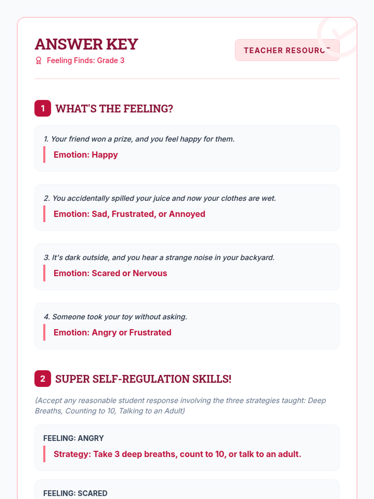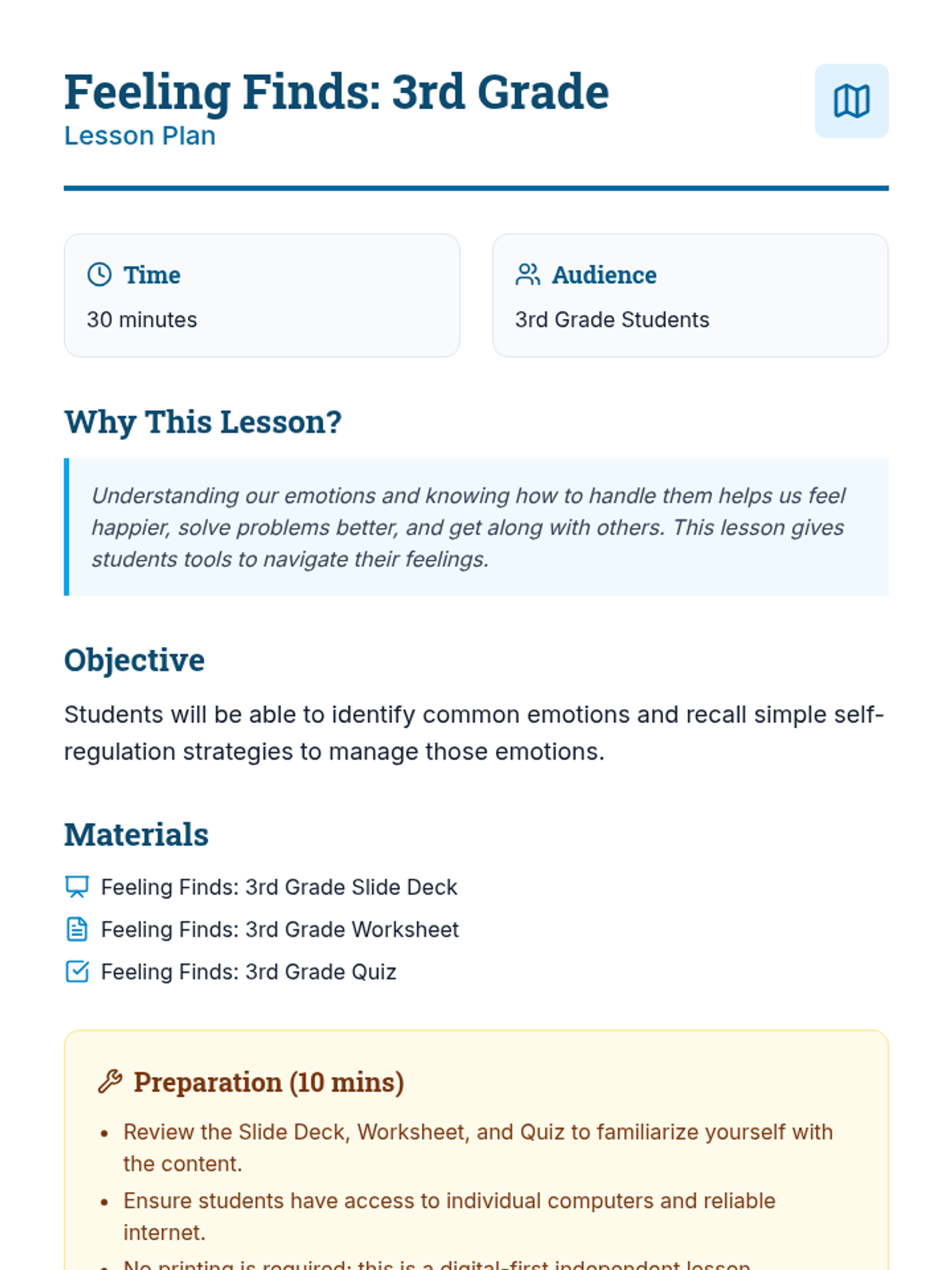 An introduction for 3rd graders to basic emotions and simple self-regulation strategies like deep breathing and counting to ten.