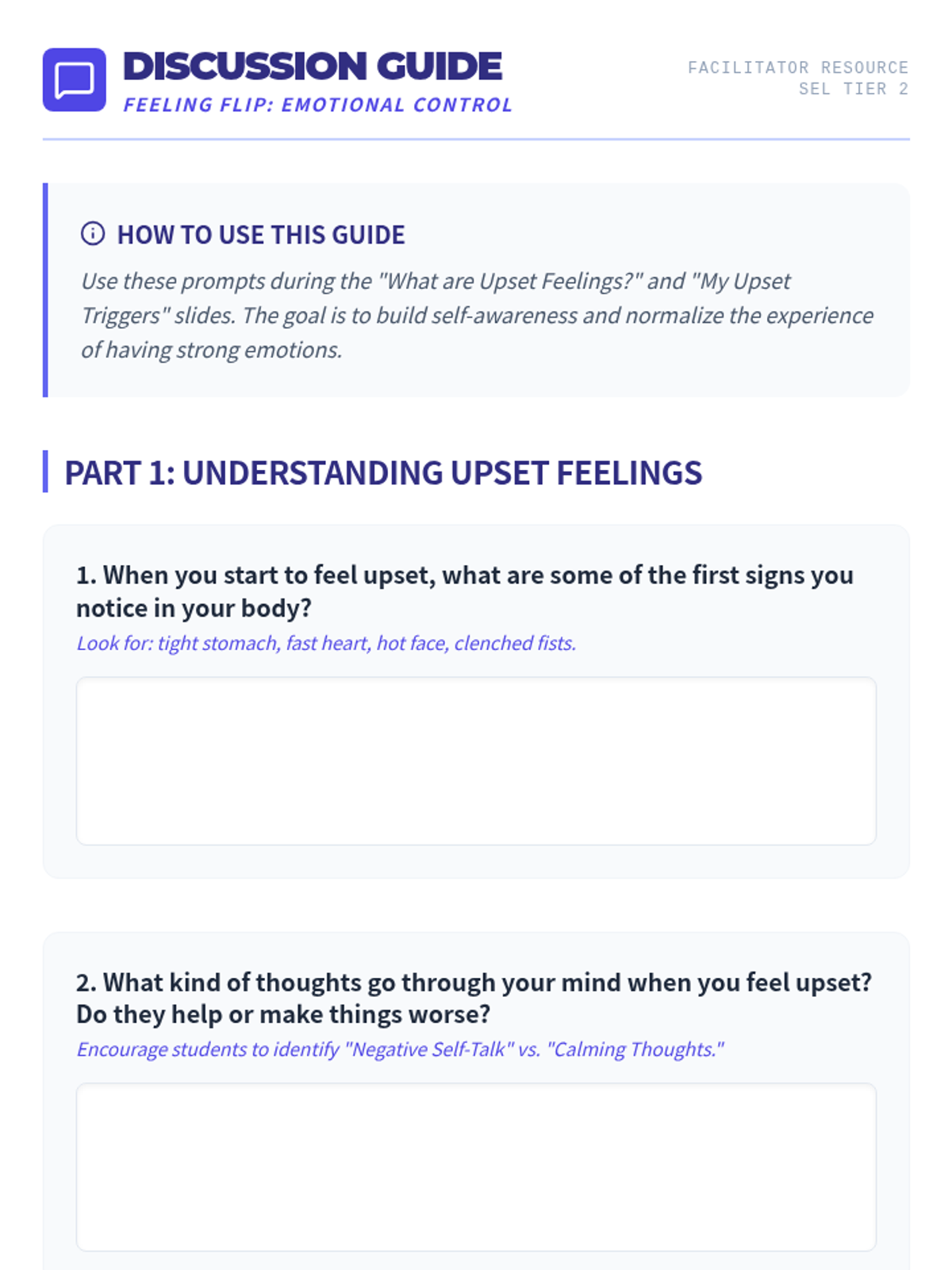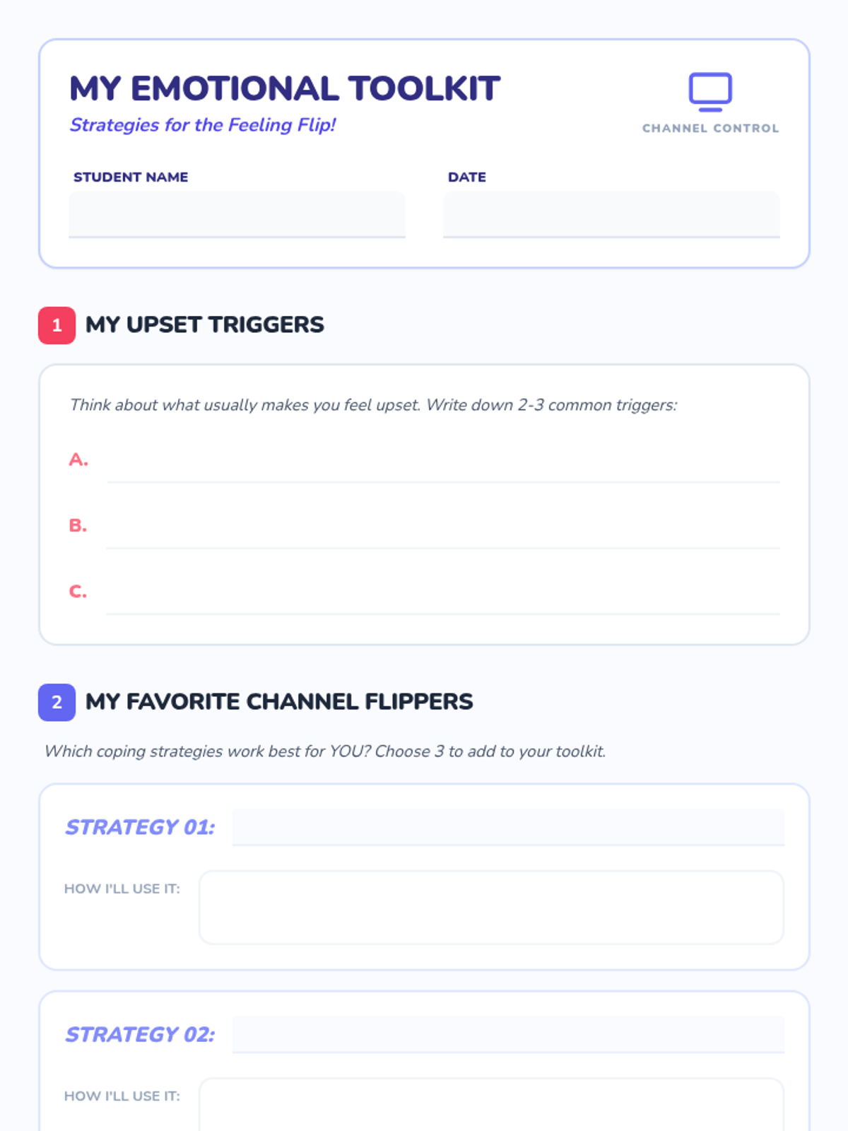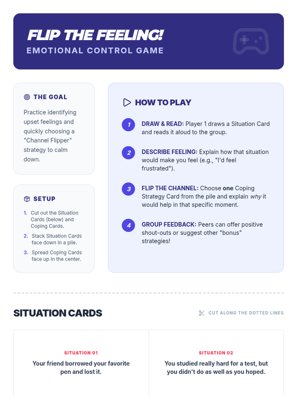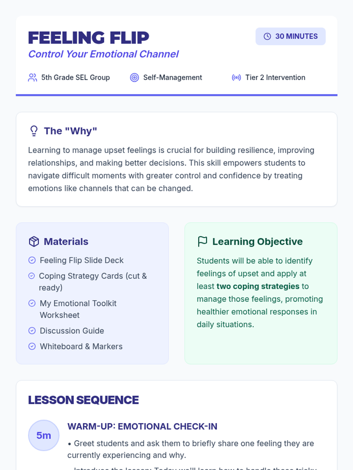 A single-session SEL lesson for 5th graders focused on identifying upset feelings and using 'channel flipping' coping strategies to manage emotional reactions.