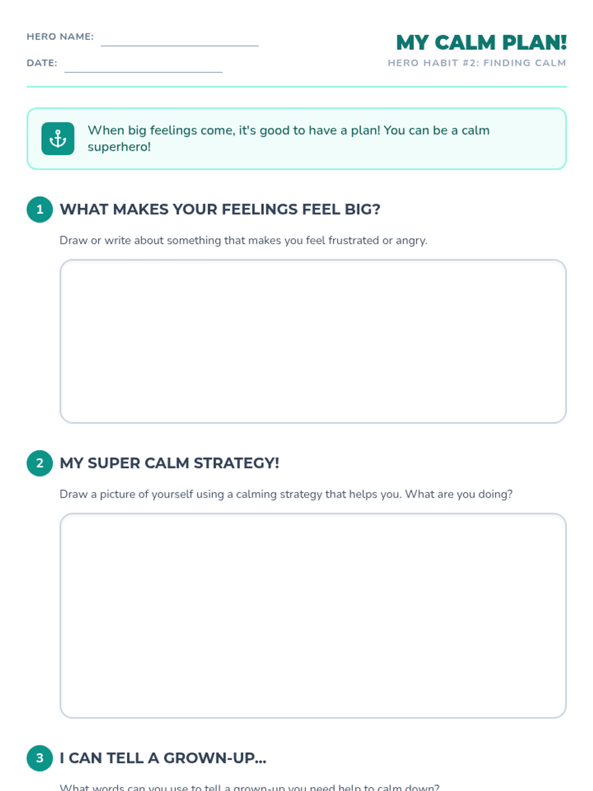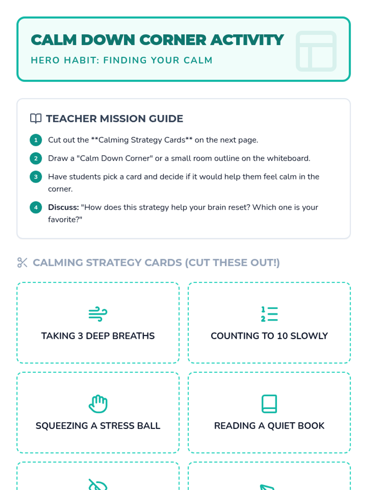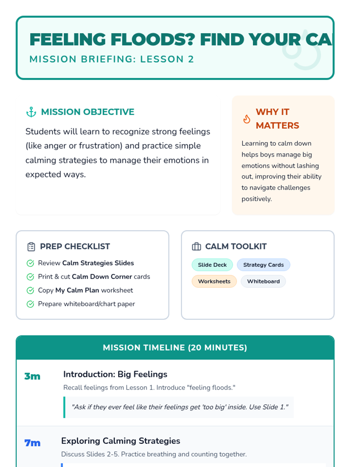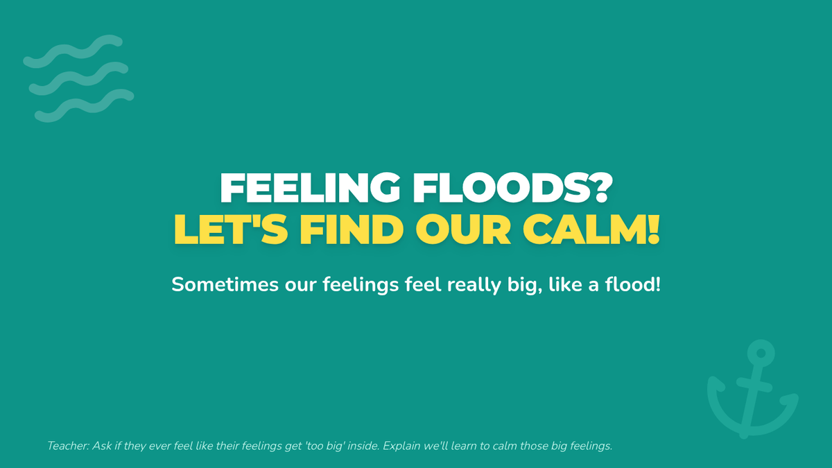 Students learn to recognize 'feeling floods' and practice simple calming strategies to manage big emotions like anger or frustration.