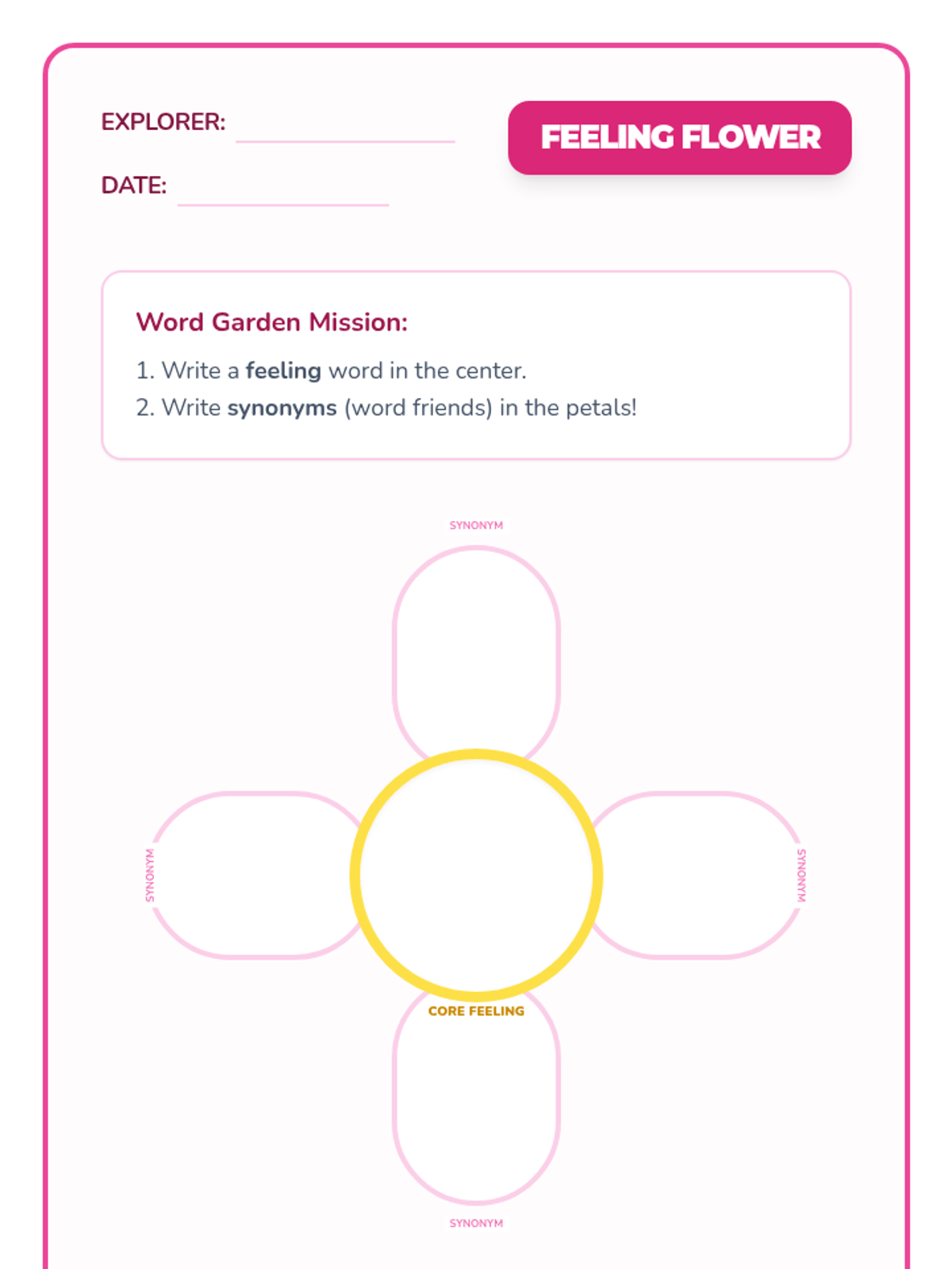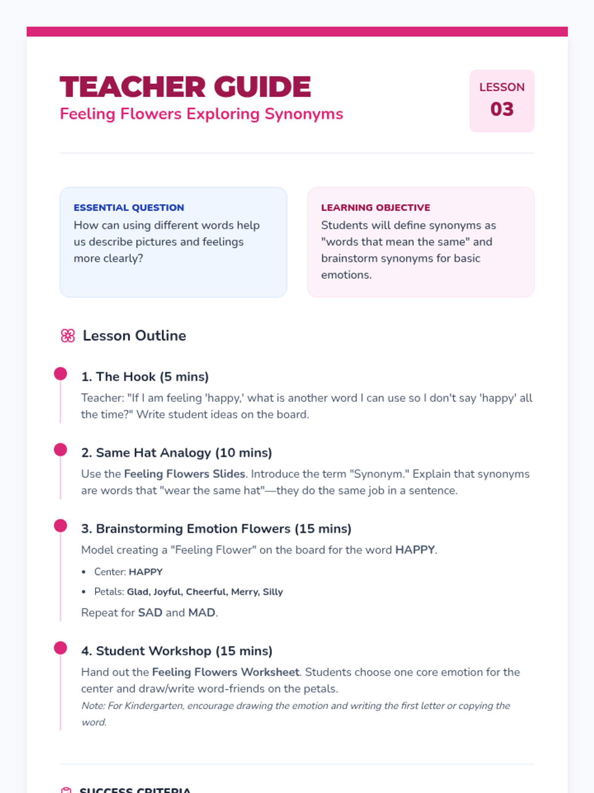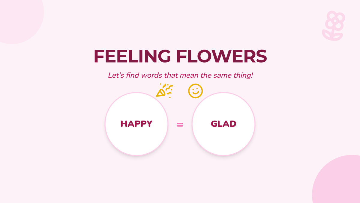 The focus shifts to synonyms, explored as 'words that wear the same hat.' Students brainstorm synonyms for common emotions to build a 'Flower of Feelings' vocabulary map.