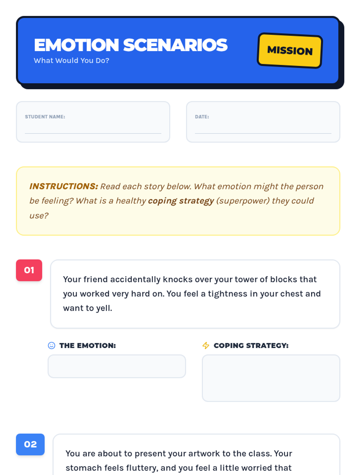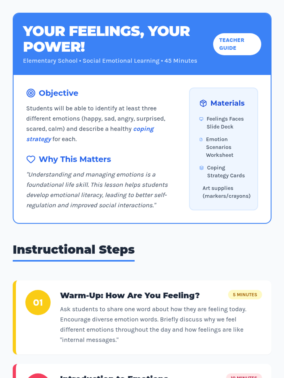 Elementary students develop emotional literacy by identifying basic feelings and building a 'superpower' toolkit of healthy coping strategies to manage big emotions.