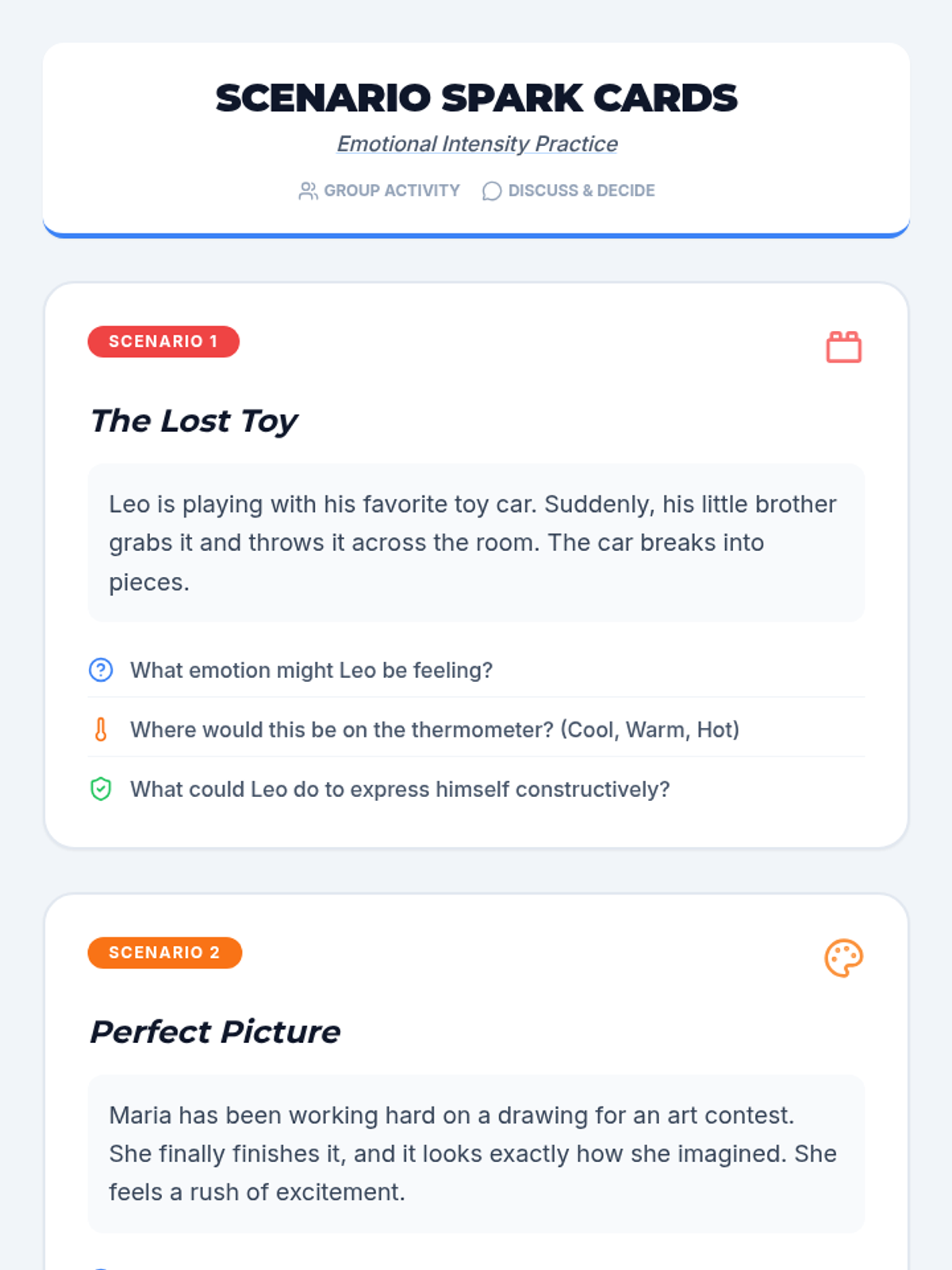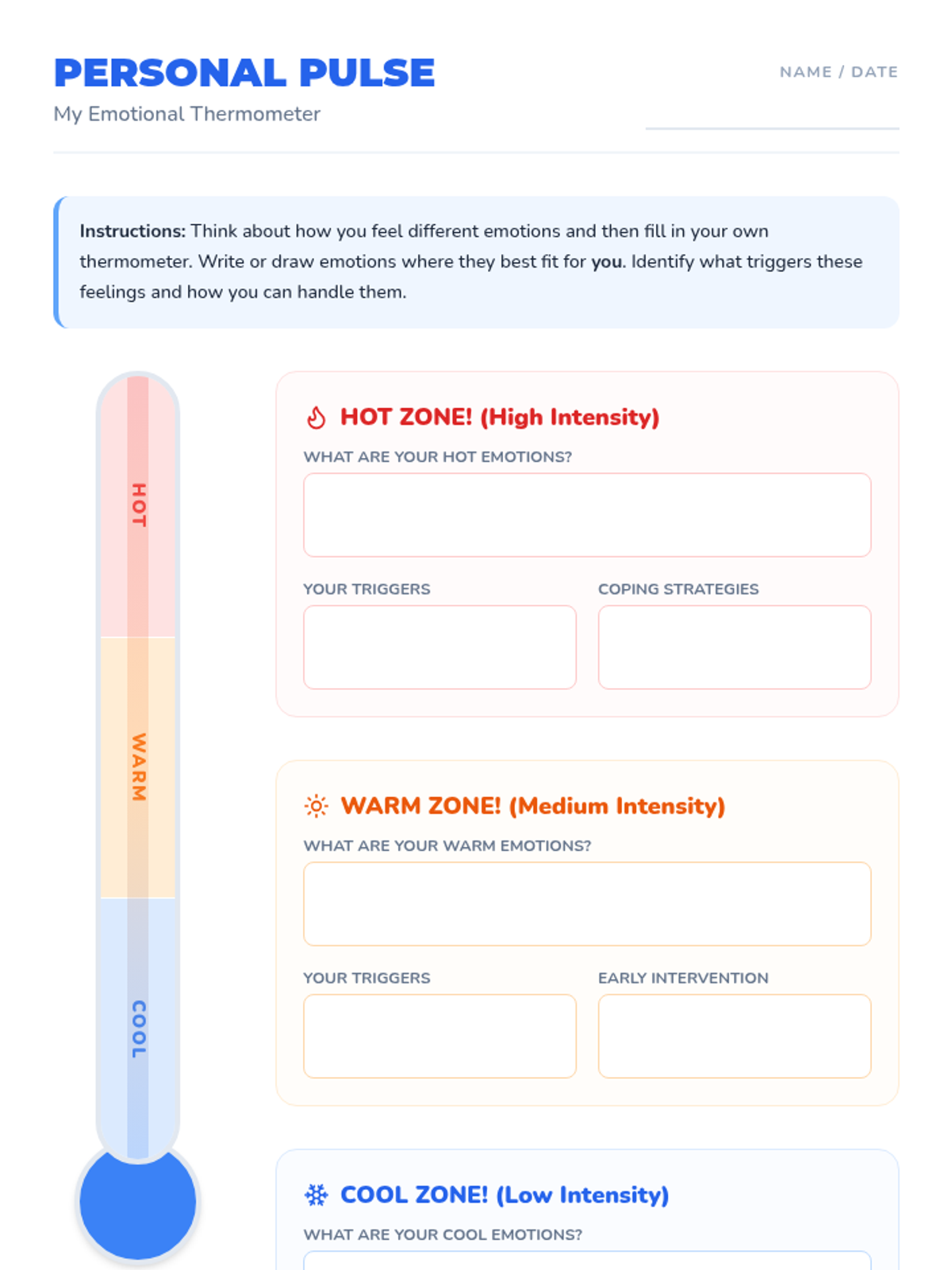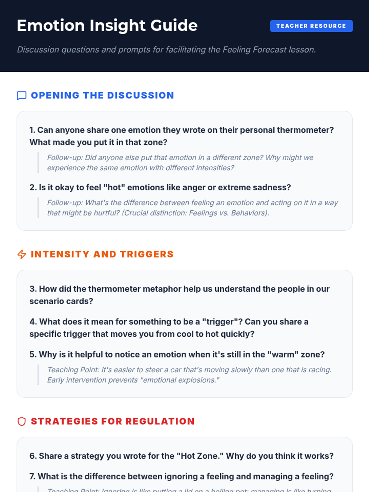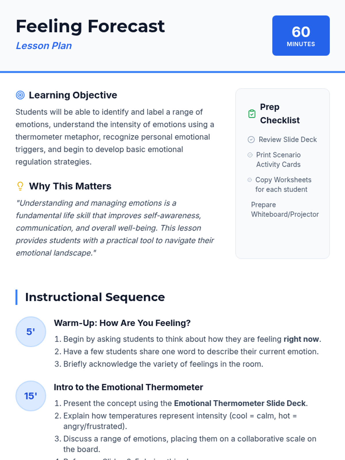 This insightful lesson helps students identify, label, and understand the intensity of their emotions using a 'thermometer' metaphor. Through interactive scenarios and self-reflection, students learn to articulate their feelings, recognize emotional triggers, and develop early intervention strategies for emotional regulation.