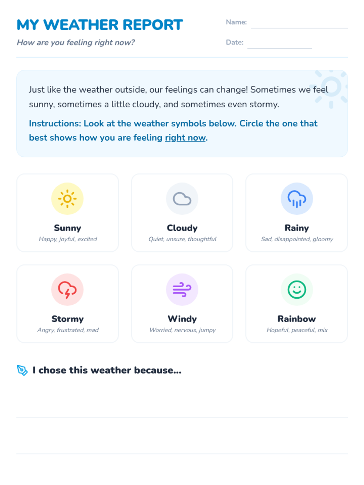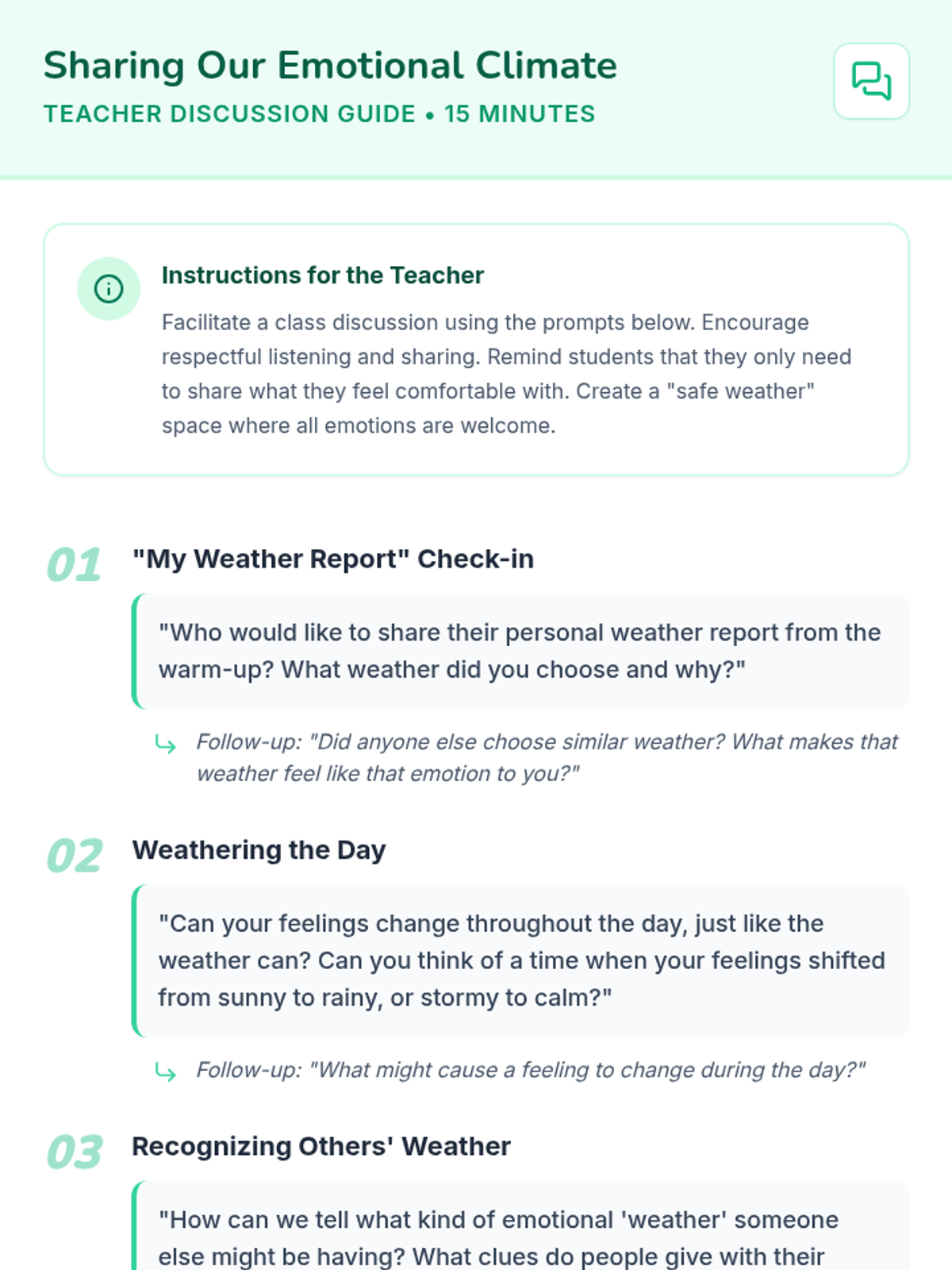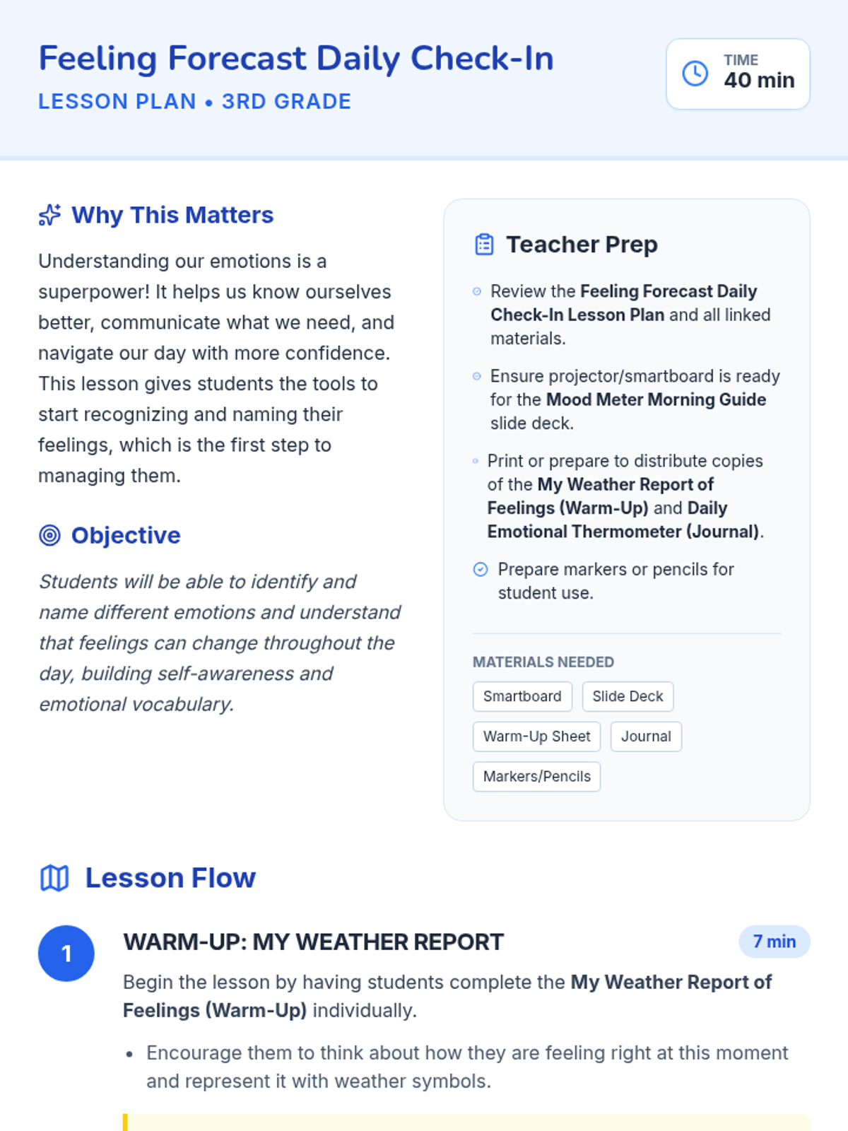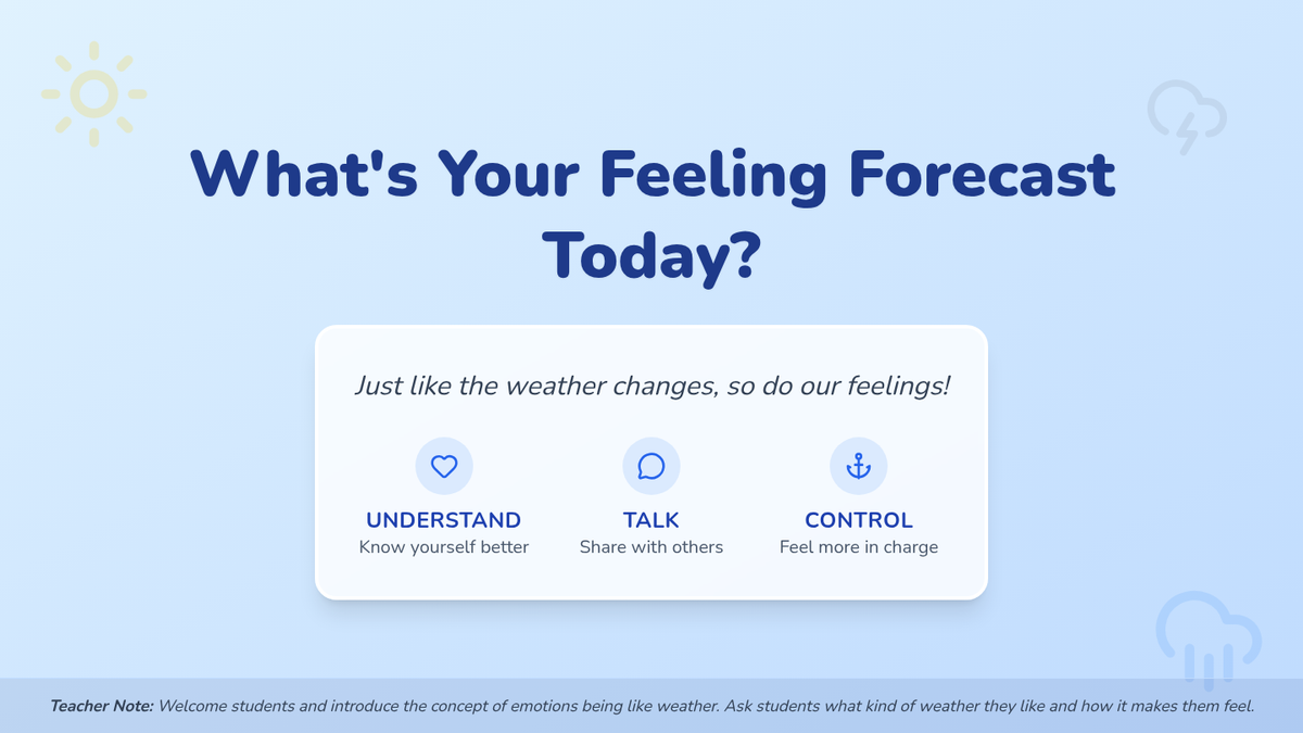 A 40-minute lesson for 3rd graders to build emotional self-awareness using weather metaphors to identify and track feelings.